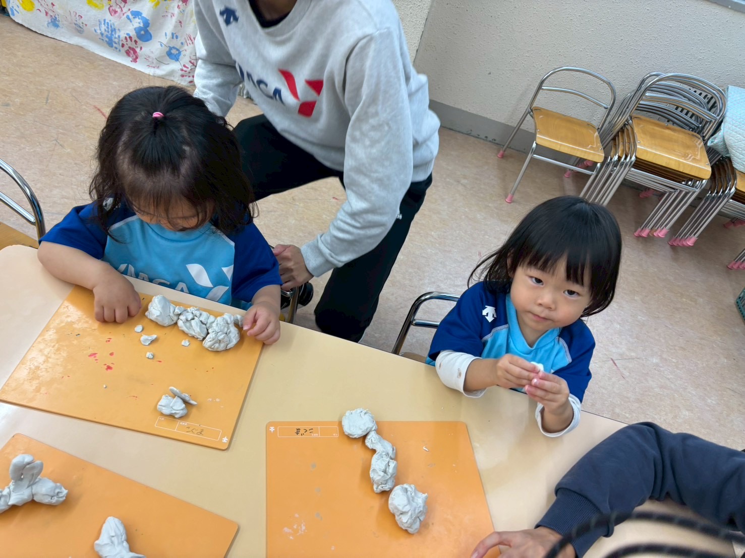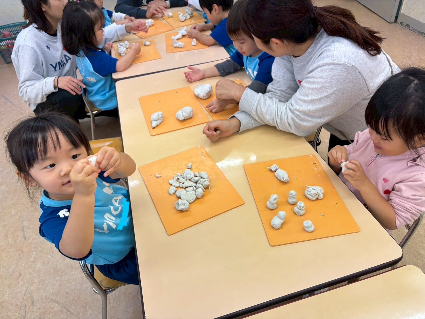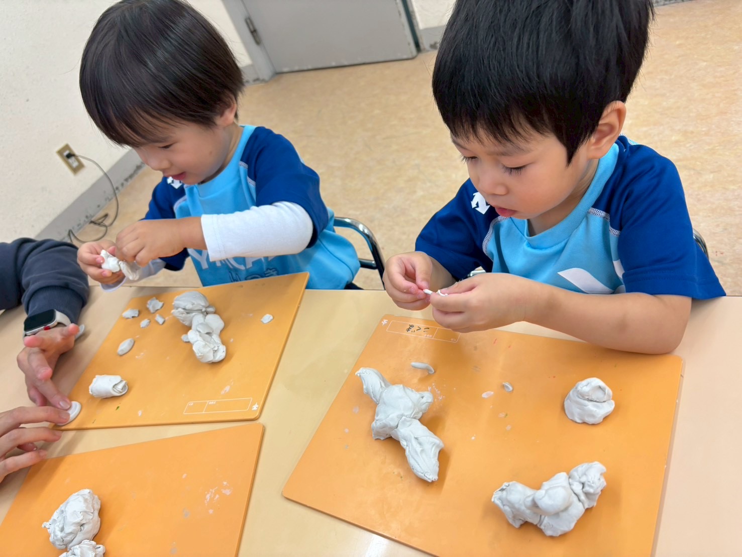 お部屋では粘土あそびをしました。想像力を膨らませながら、おいしいものや可愛いもの、かっこいいものをたくさん作りました。粘土をこねているとお話も進み、鼻歌も歌って、なんだか賑やかです。楽しかったね!お家に持って帰っていますのでまた遊んでみてください(^^)/