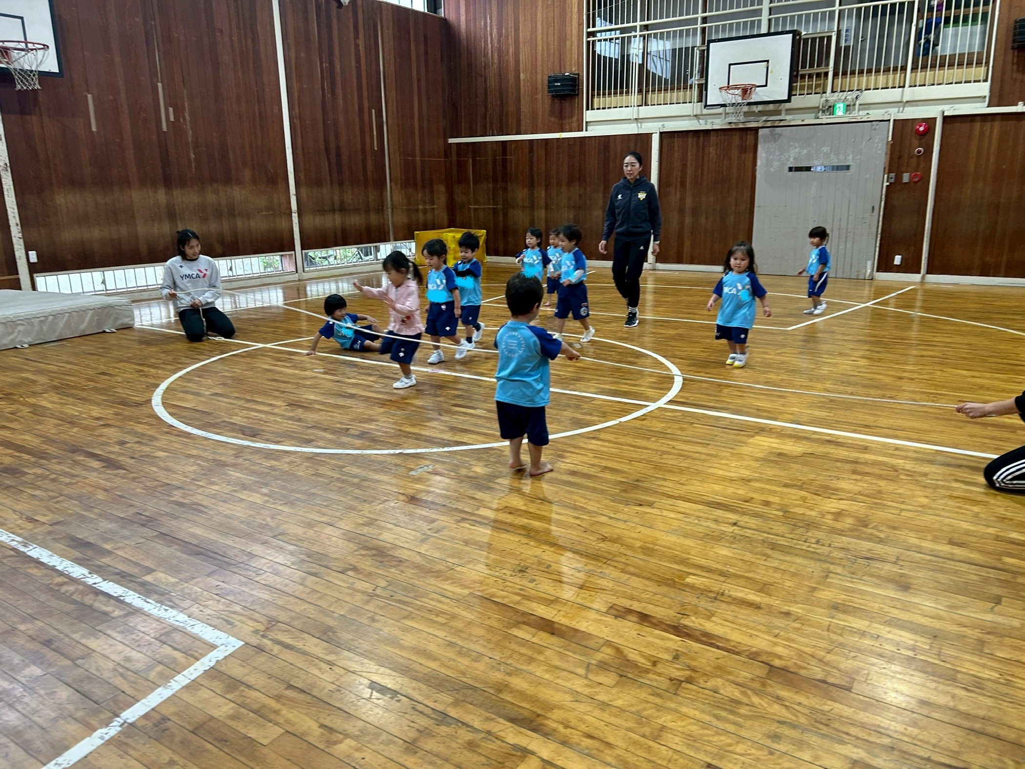 上がったり下がったりしている縄をよく見て、上がっているときに見計らって通ってもらいました。タイミングを見るの難しかったね~!子どもたちとの色々なやり取りが面白かったです(#^.^#)