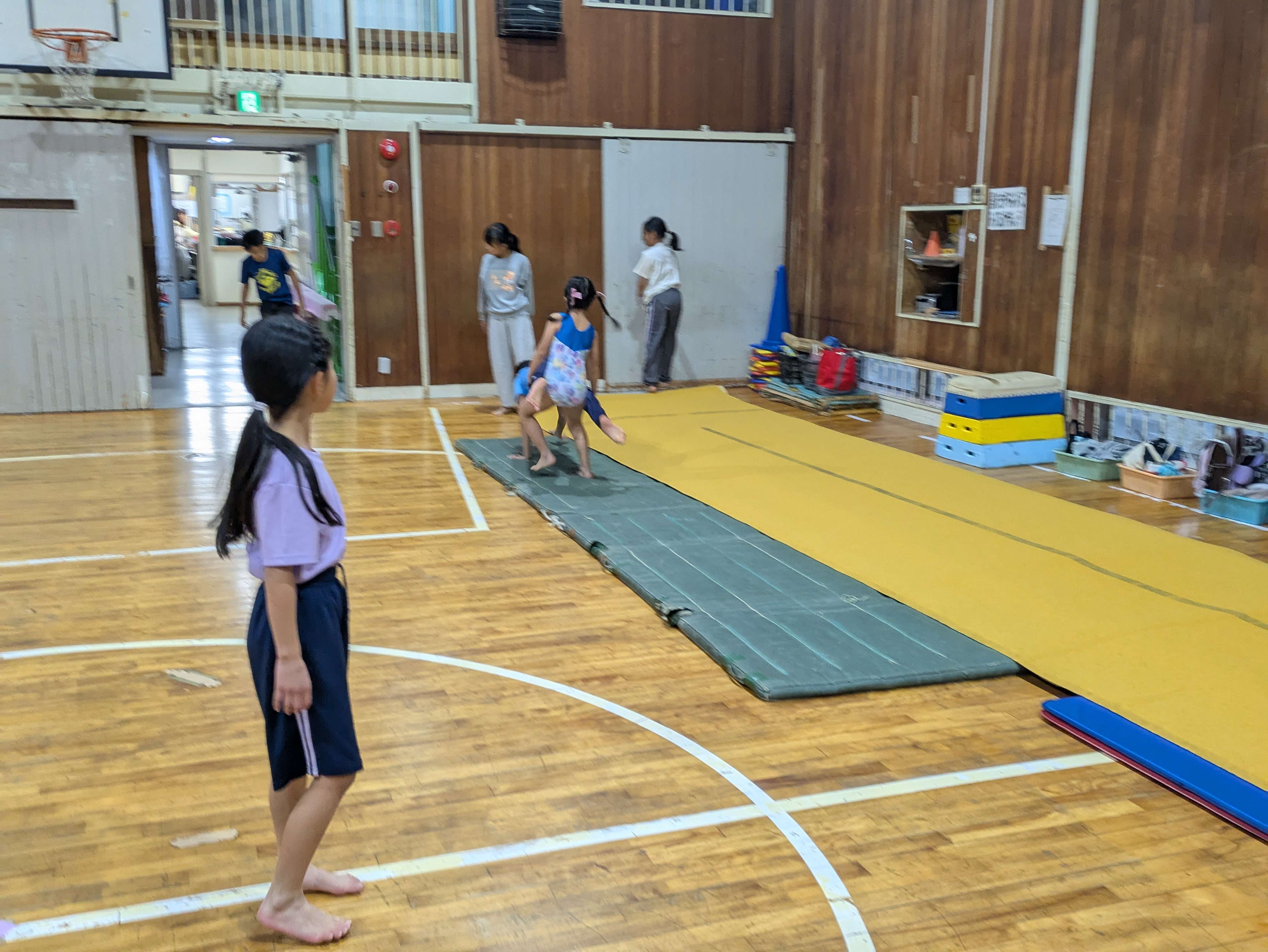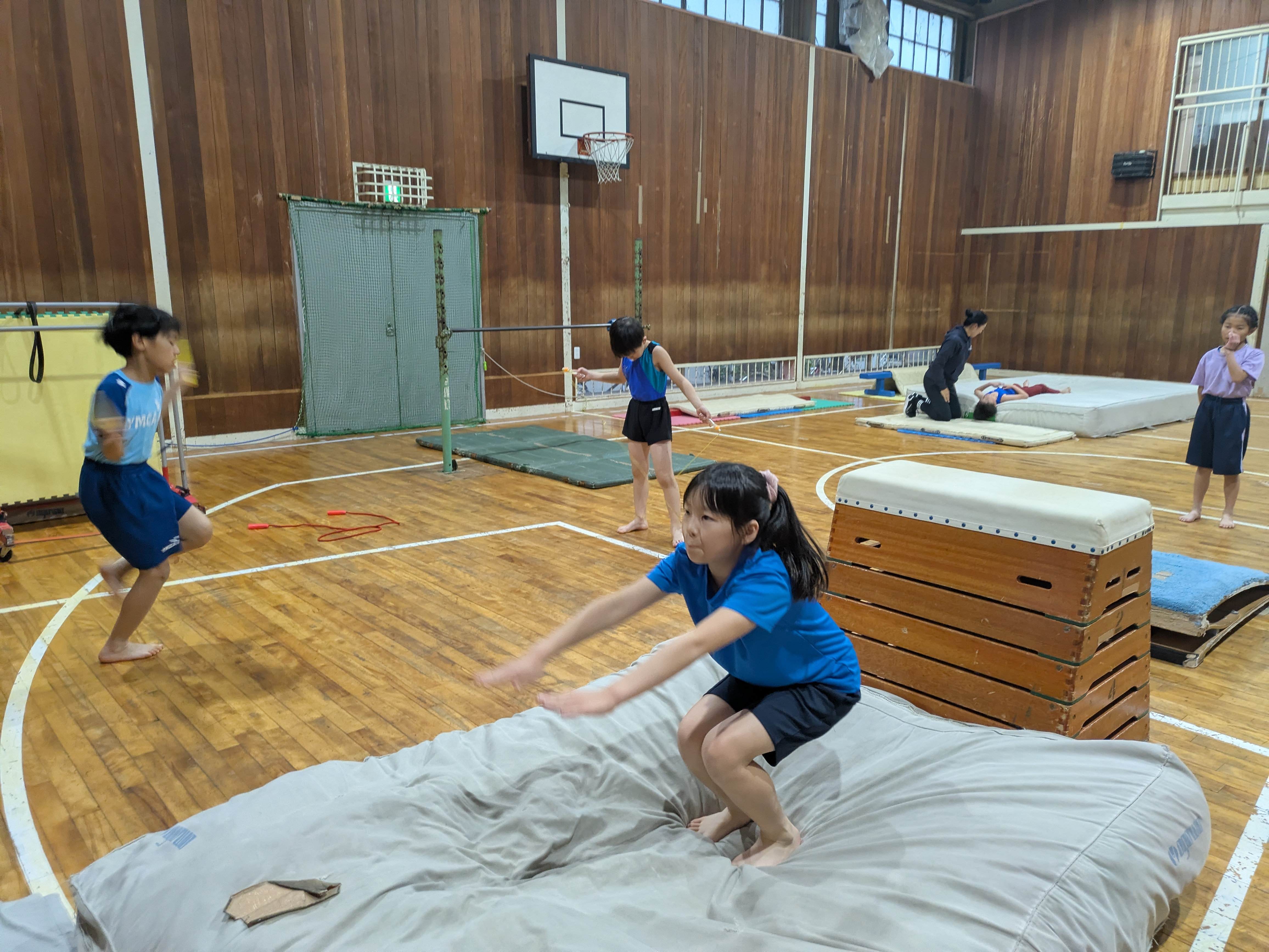ロイタージャンプでは、リーダーと手を繋いでジャンプのタイミングを意識して取り組みました!しっかりロイター板を使えるようになってきたので、助走からも同じようにできるようにしましょう!