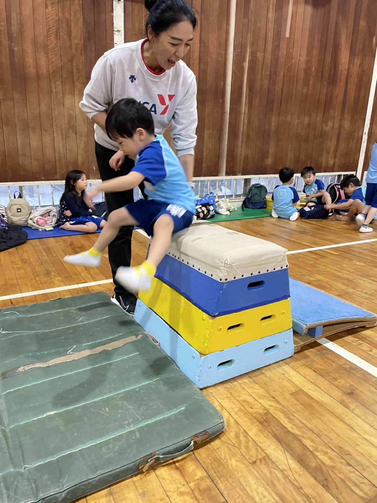 ロイター板のジャンプでは、しっかりと足を揃えて跳ぶことができていましたね!跳び箱のときも、そのジャンプを活かしてできるようにしましょう!