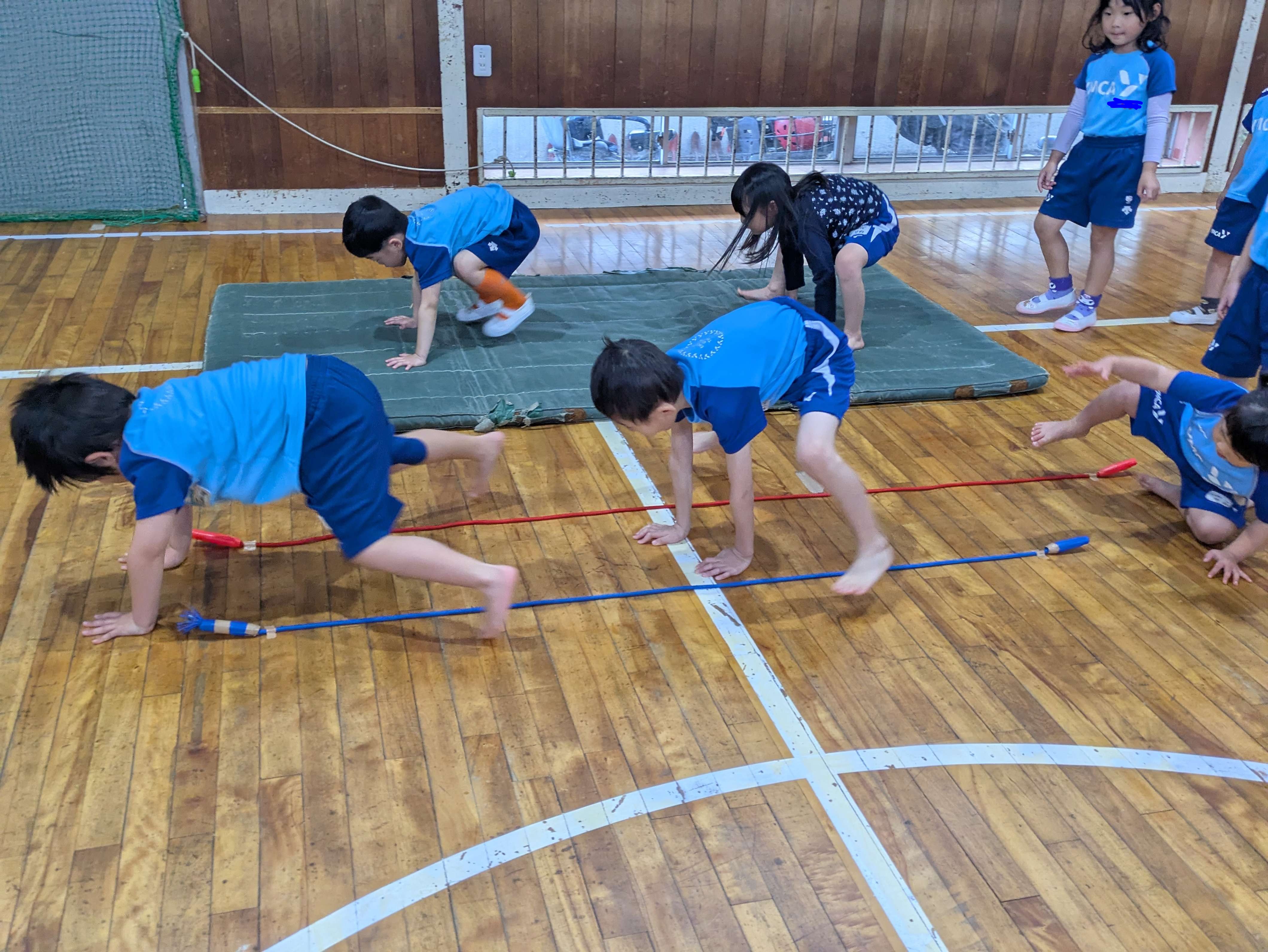 跳び箱では、大きく脚を開いてとべるようになりましたね!手を最後まで着いて、跳び箱を押して跳ぶようにしましょう!