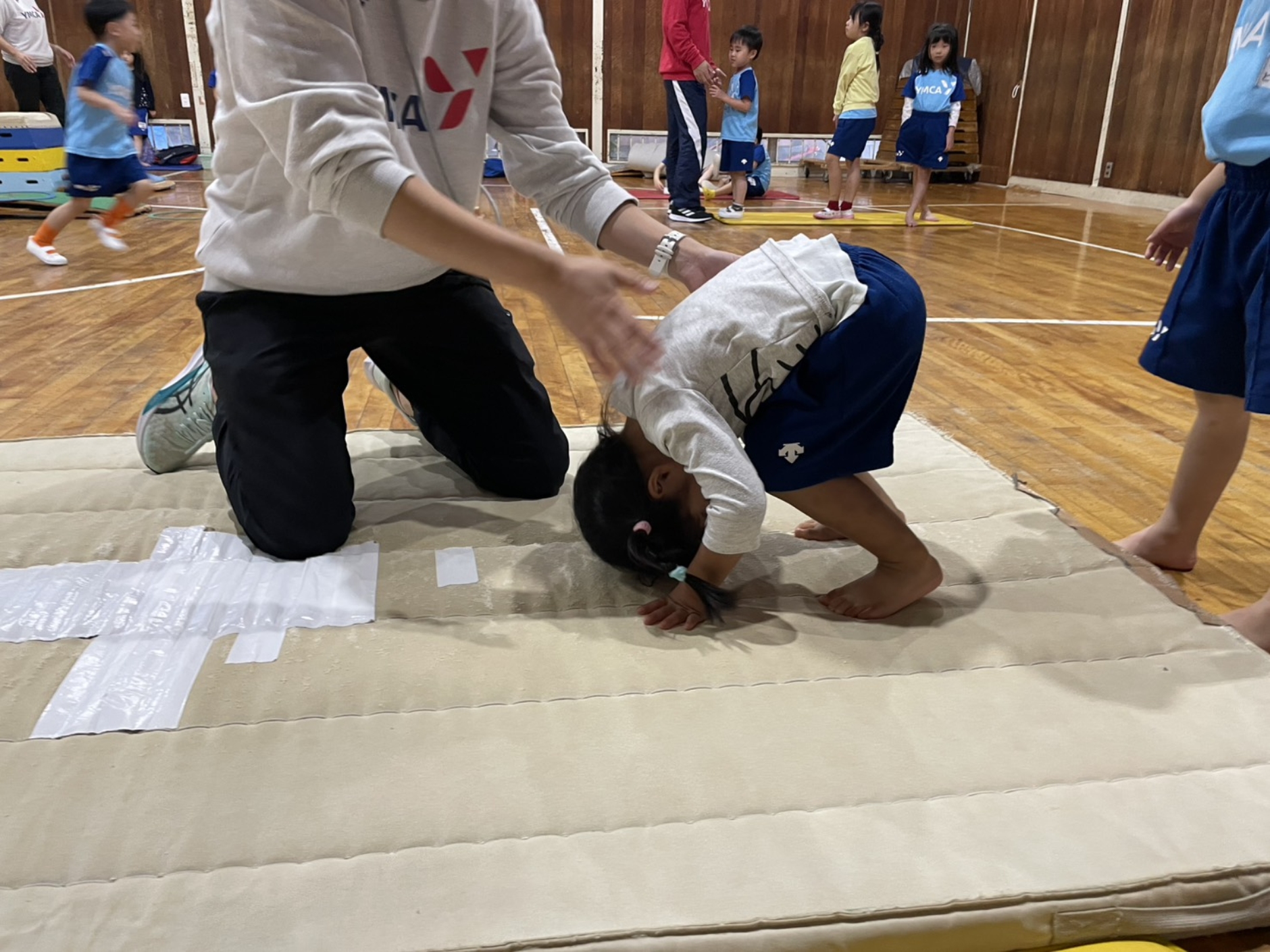 マットの前転や後転では、最後まで体を丸めたまま回れるようにしましょう!