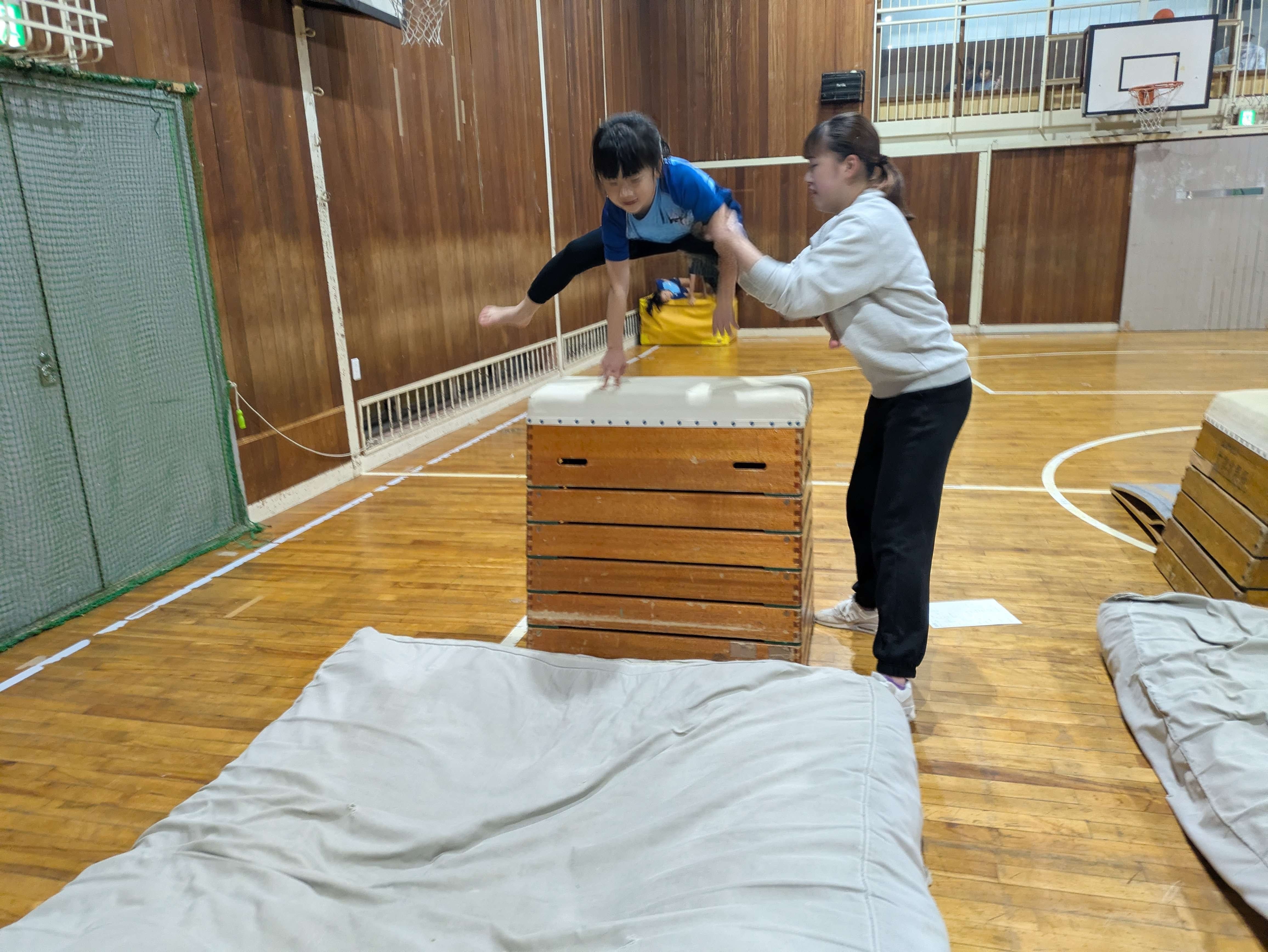 跳び箱では、ジャンプをしてから手をついて、最後まで跳び箱を押してとべるようにしましょう!