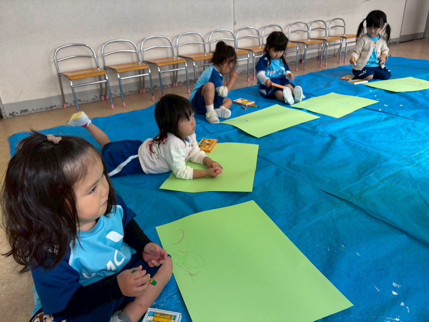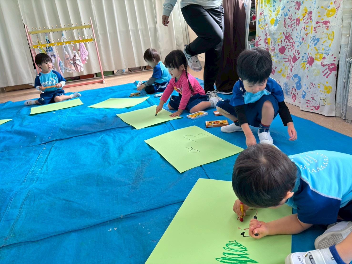 お部屋ではクレパスでお絵描きをしました。お芋の絵を描いているお友だちもいました。好きな電車を書いているお友だちや、パパママのお顔を描いている友達もいました。どんどん上手になりますね!