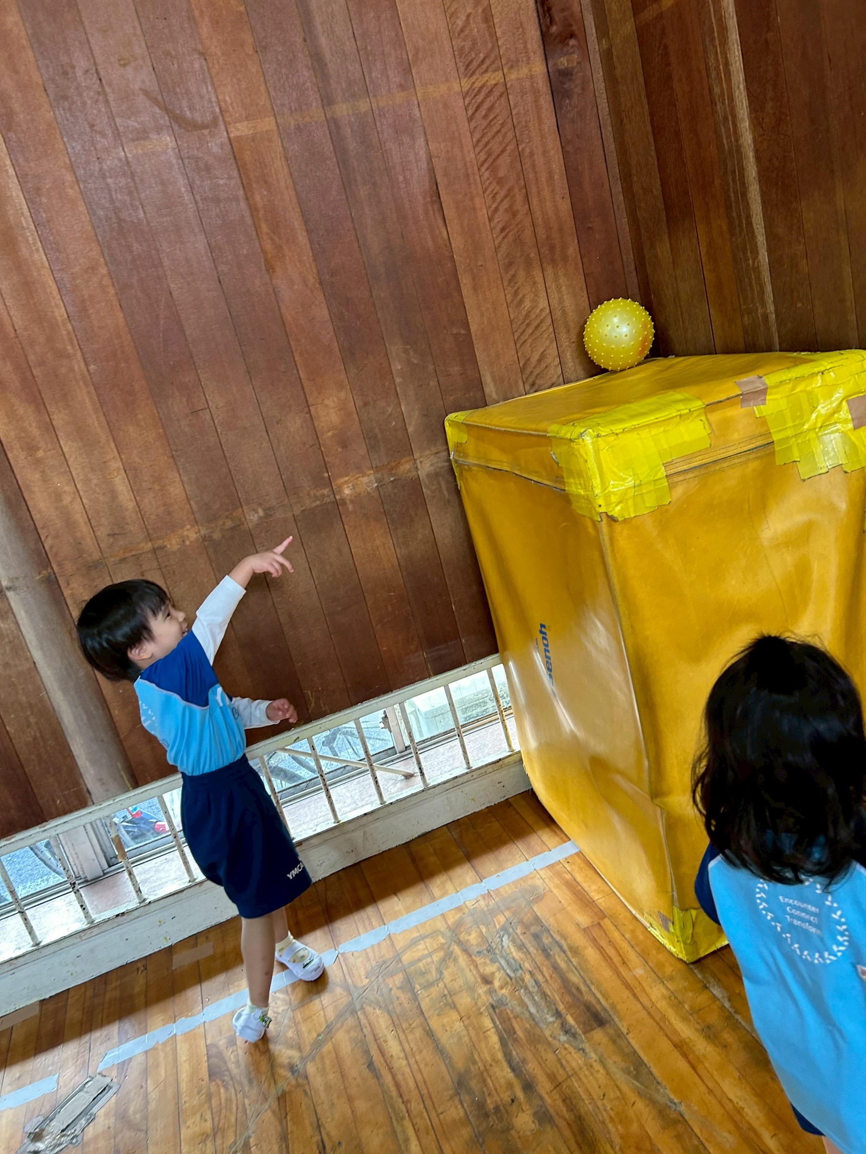 子どもたちがよく大きなバランスボールから小さいボールまでシュートしてとお願いしてくるのですが、今日してみると次々引っかかって面白いことになりました。なかなか取れません。順番に子どもたちを抱っこしてパンチしてもらったり、ボールを当ててみたり。最後は真下から大きめのボールを当てて取り出しました。みんなやった~と喜んでいました( *´艸`)