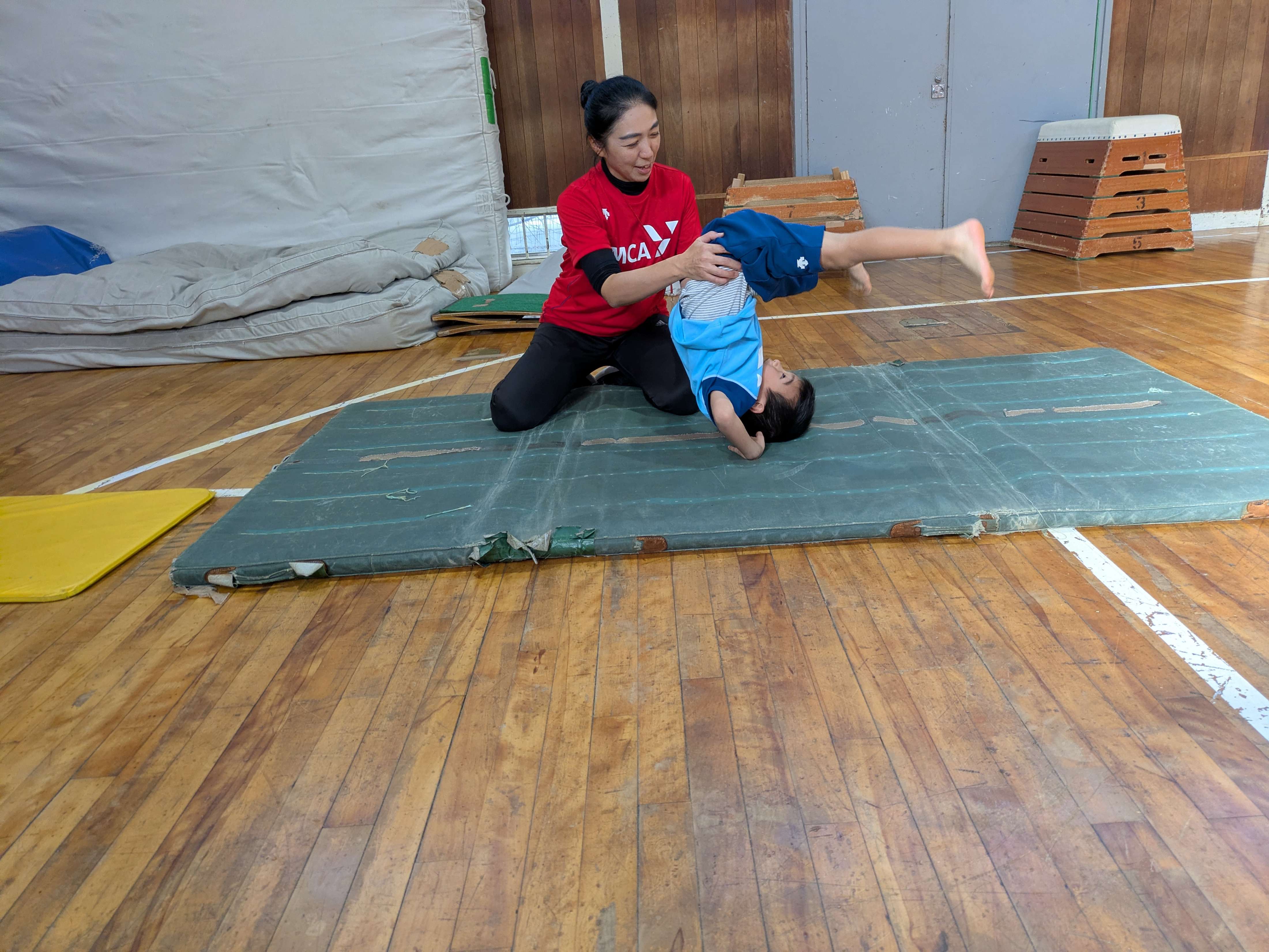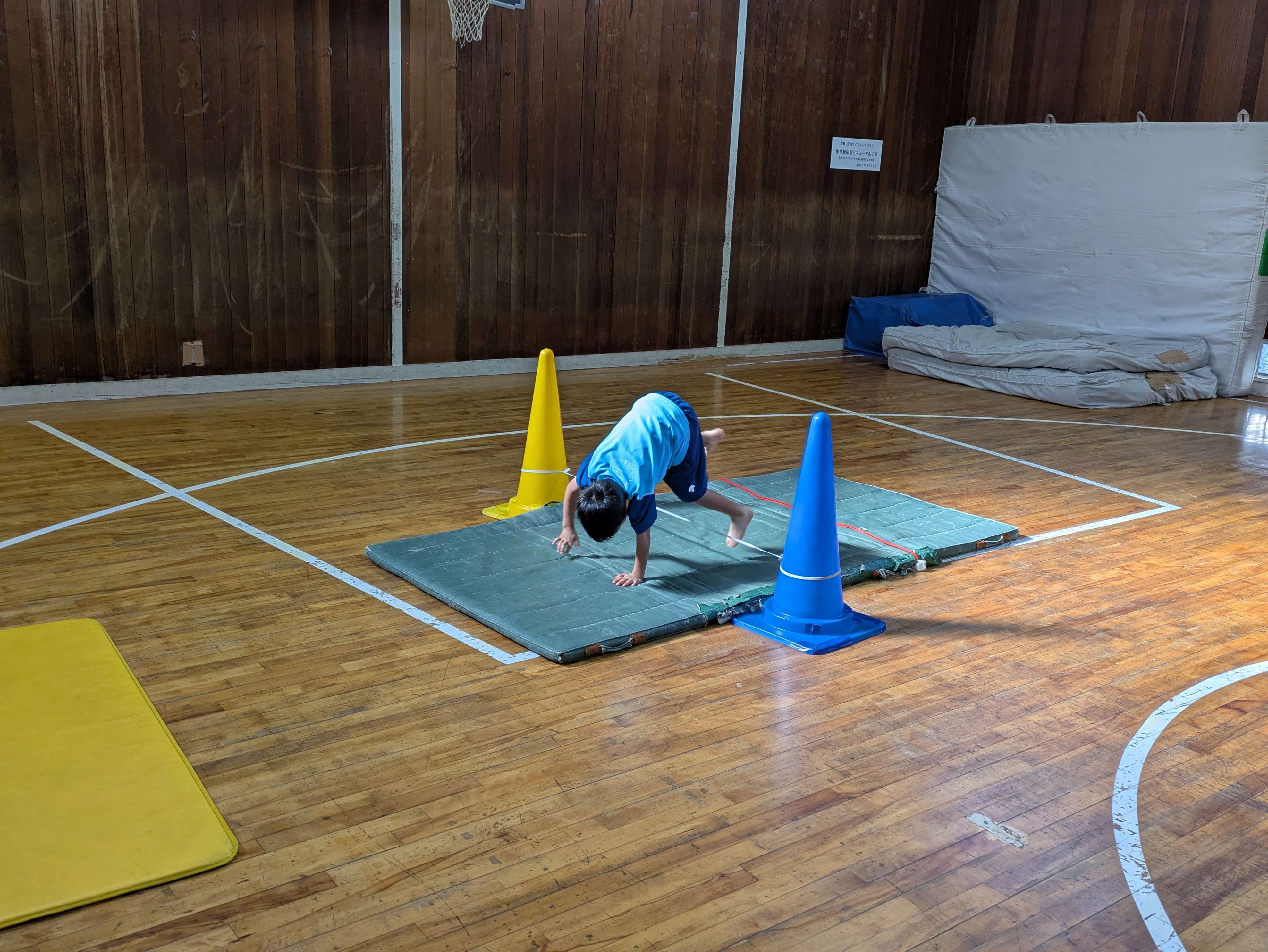 マットの前転では、最後手をつかないように意識して頑張れていますね!お腹と足が離れないよう、最後まで体を丸くしたまま回れるようにしましょう!