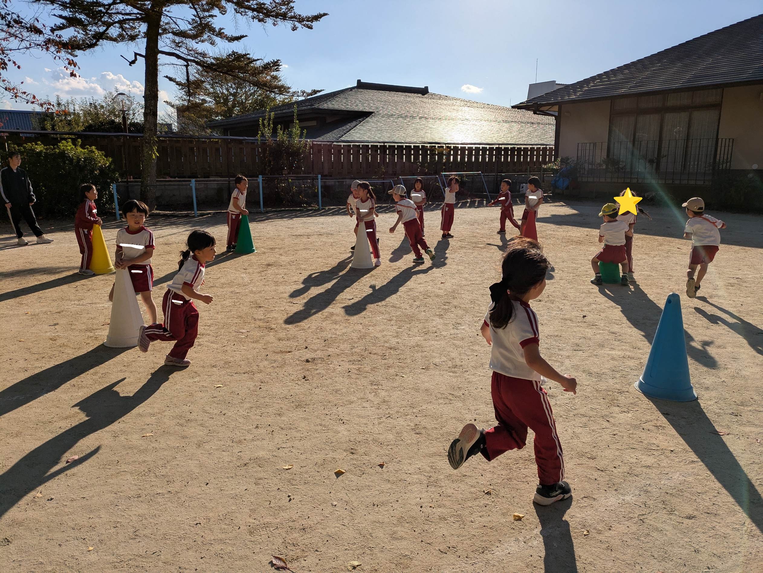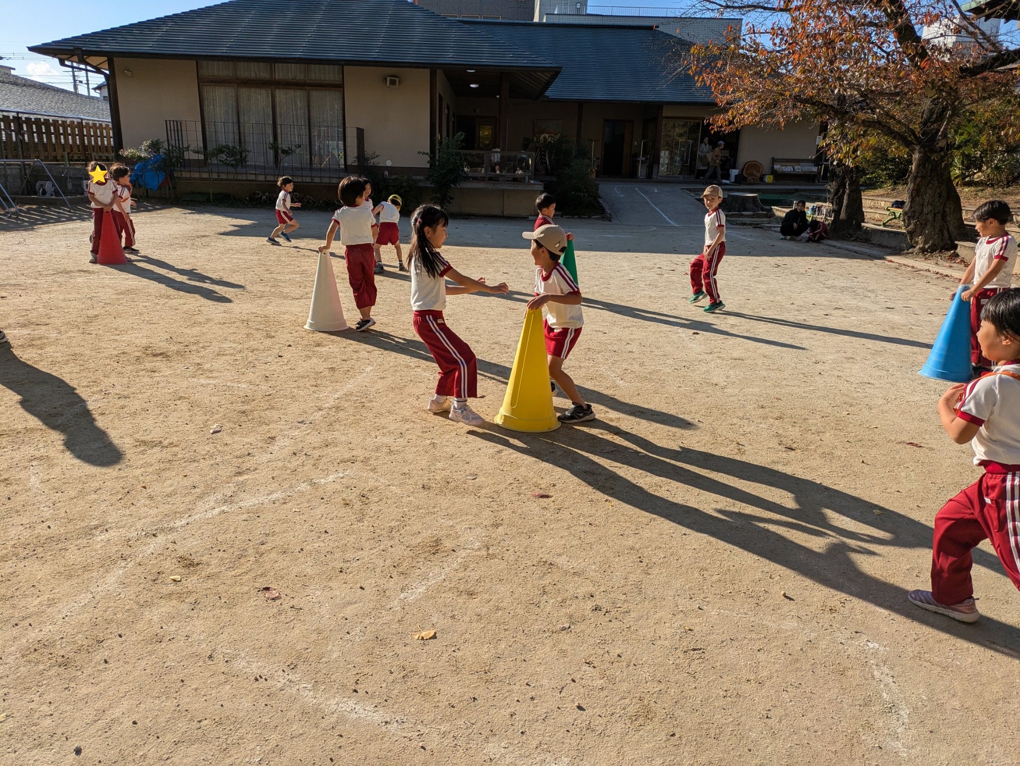 コーンのところにいる間は、タッチされないルールでしたね。でも、1つのコーンにつき1人しか居れないので、どんどんお友だちに「代わって!」と声をかけて鬼にタッチされないように頑張りました!