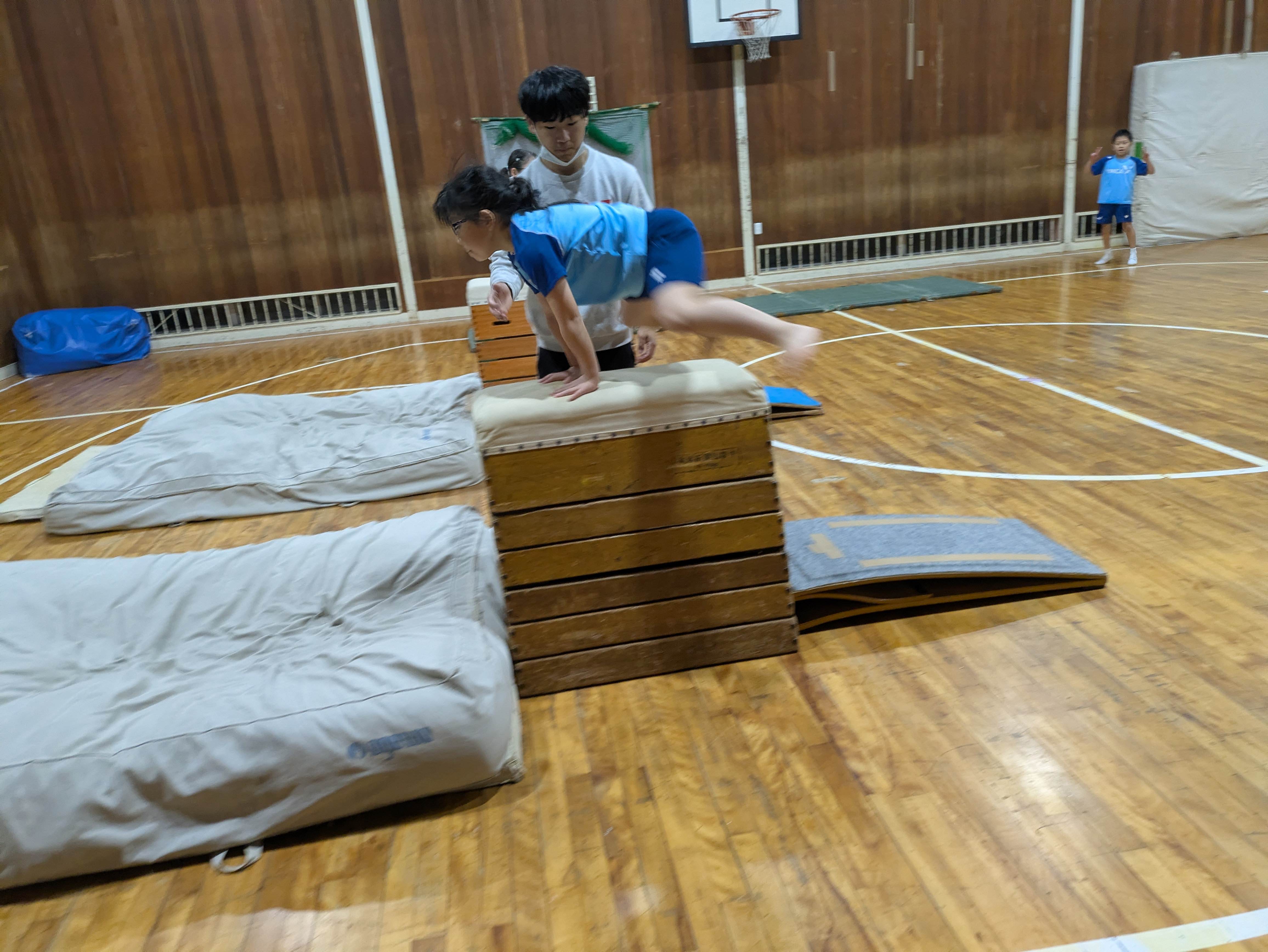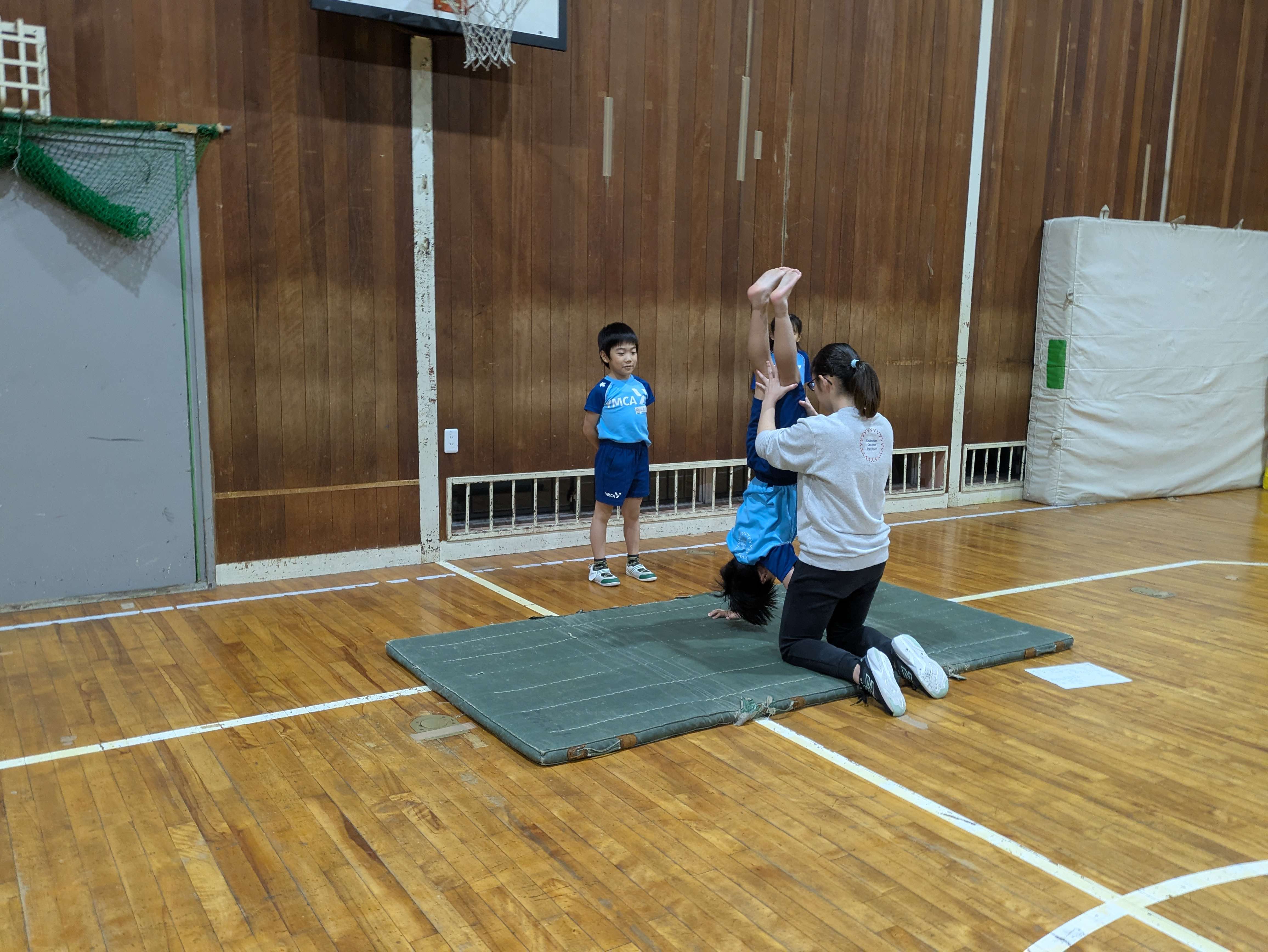 マットの側転や倒立では、勢いよく足を振り上げて、大きく技ができるようにしましょう!