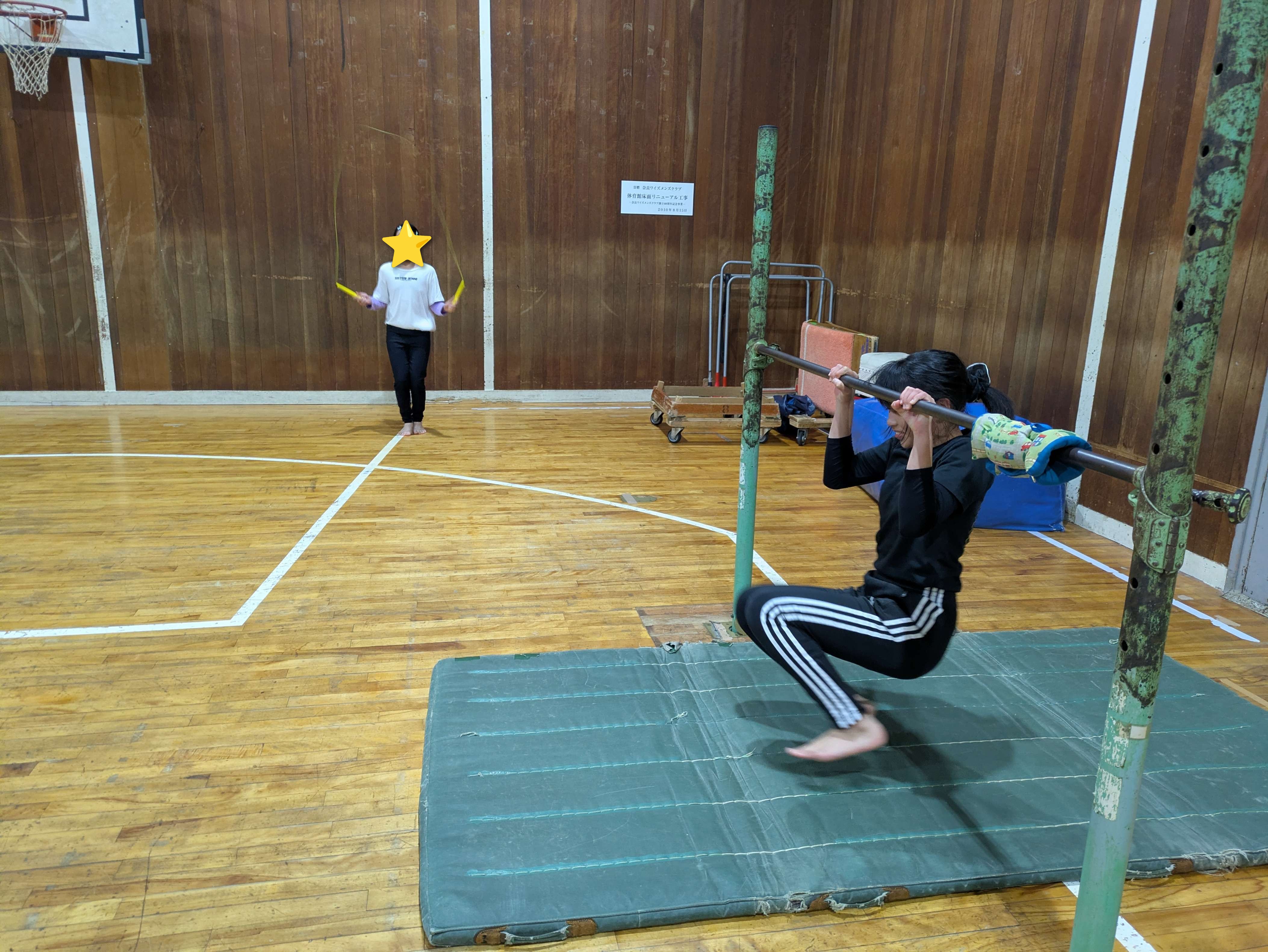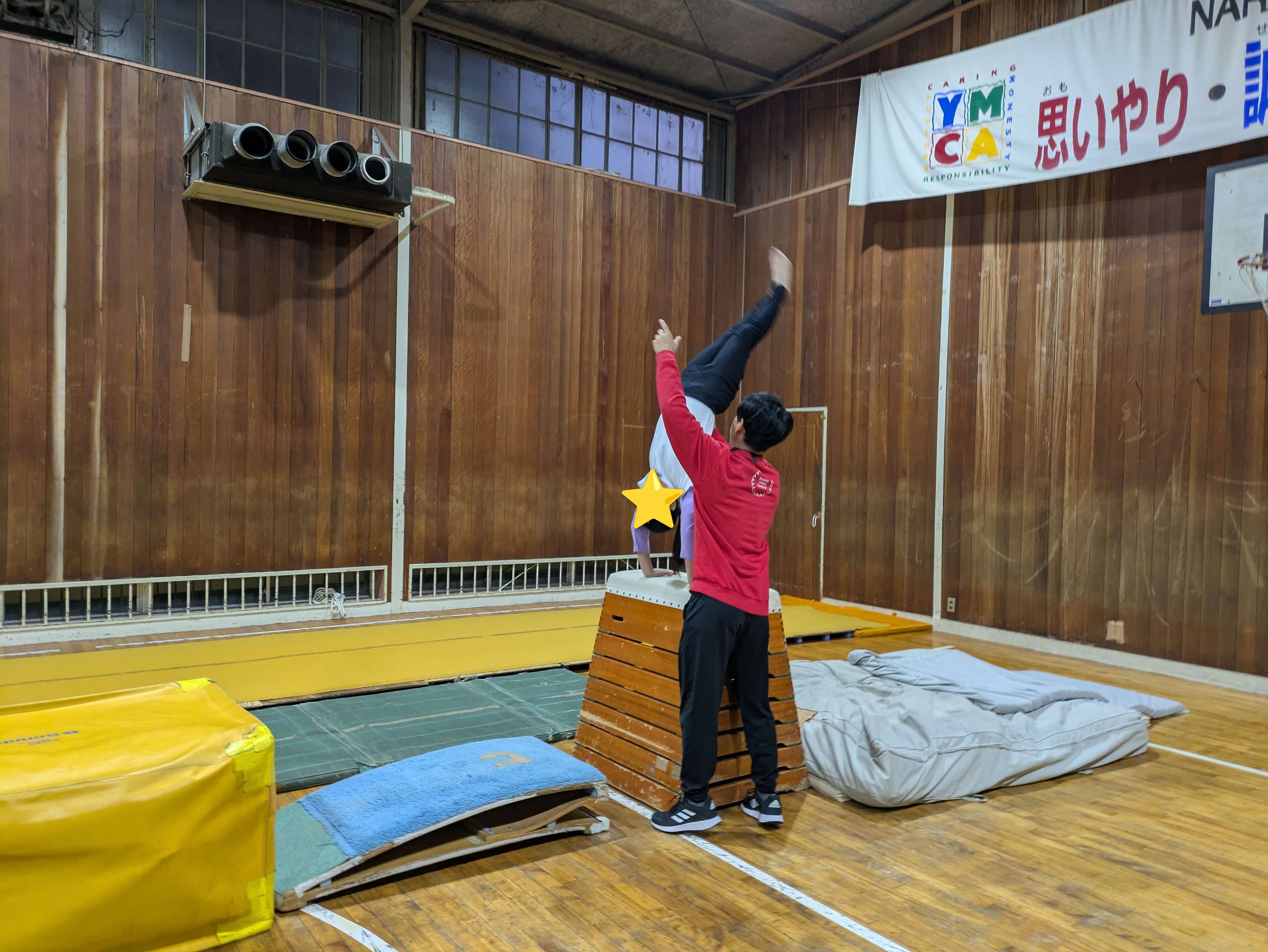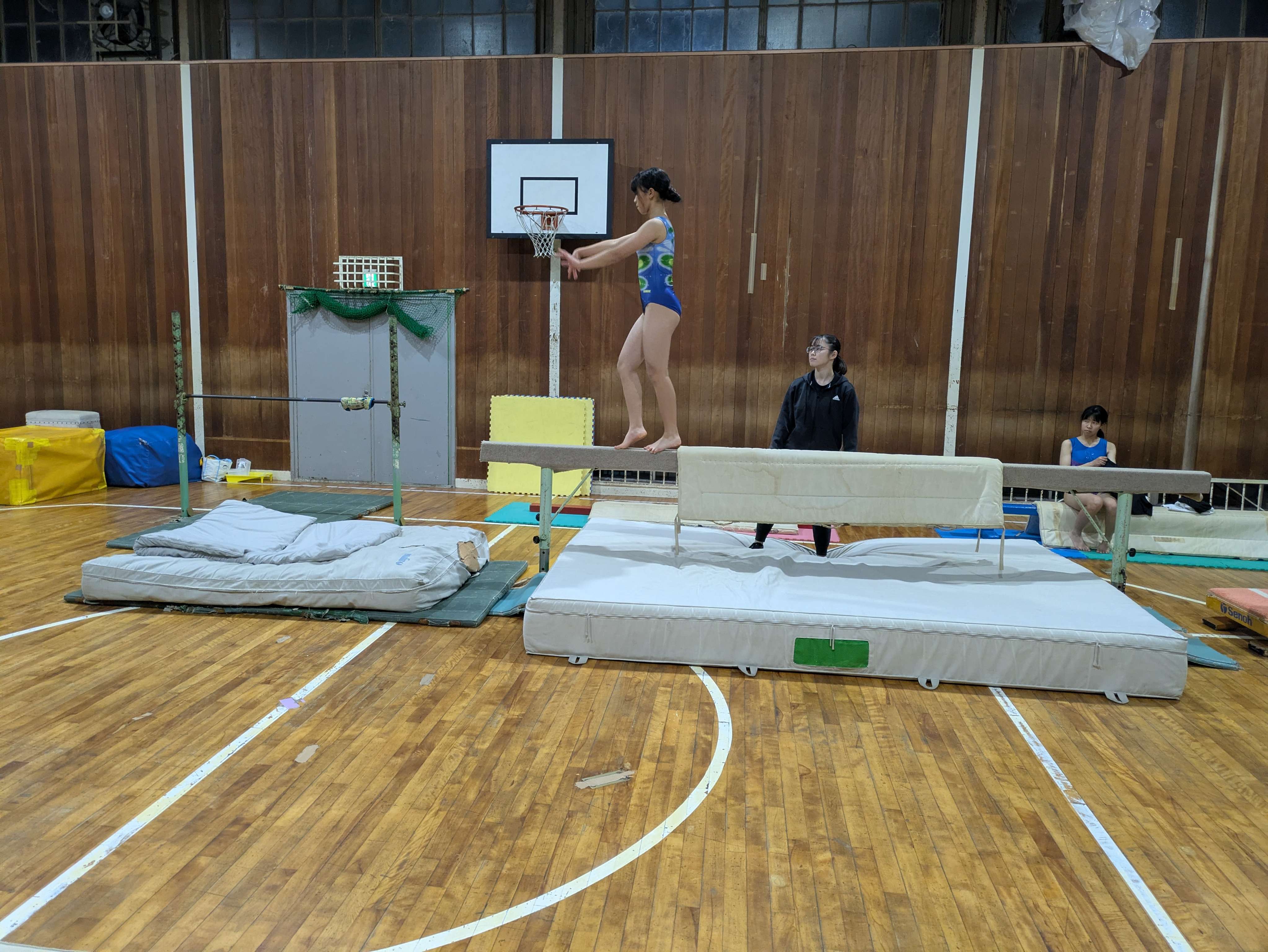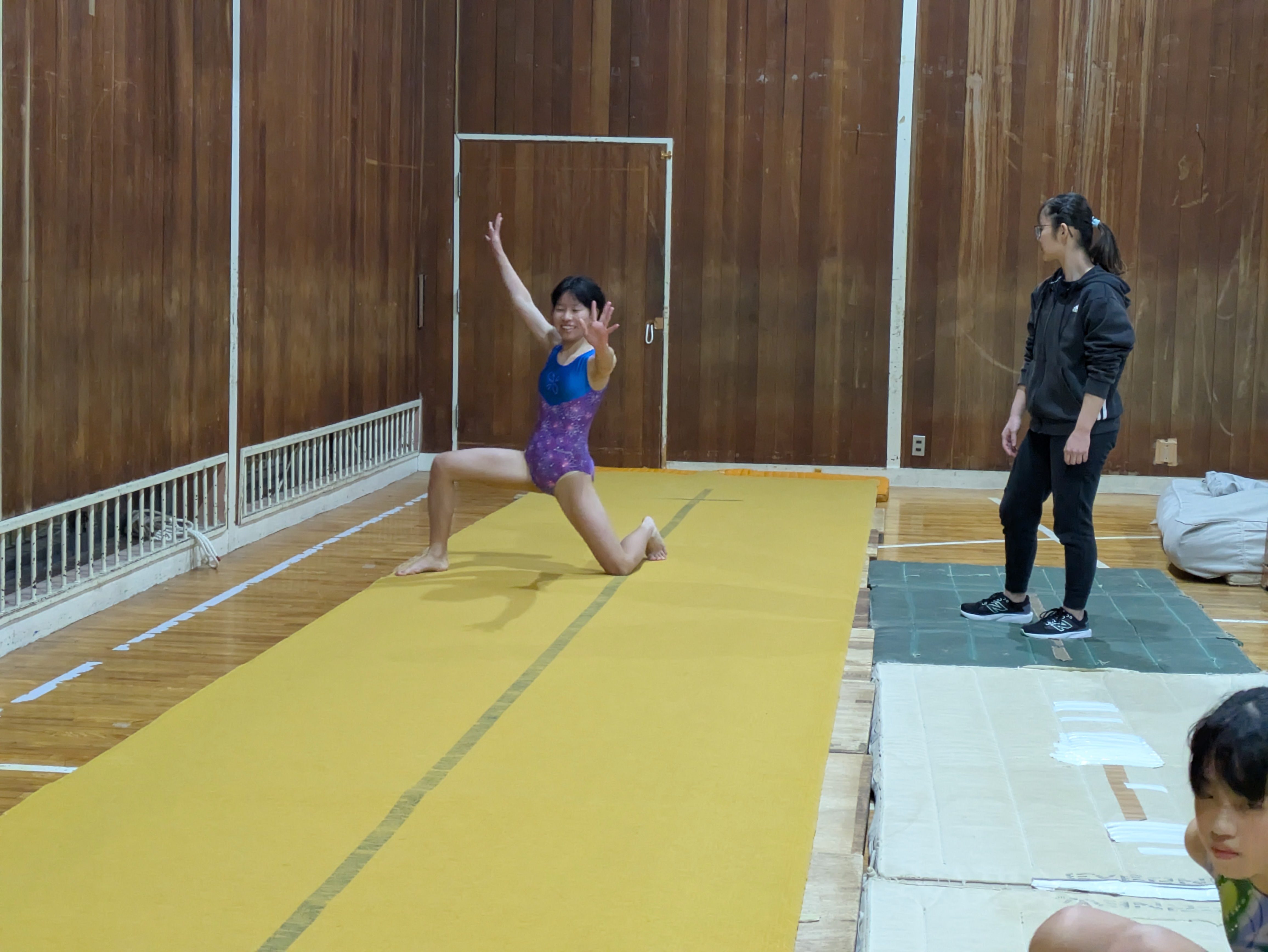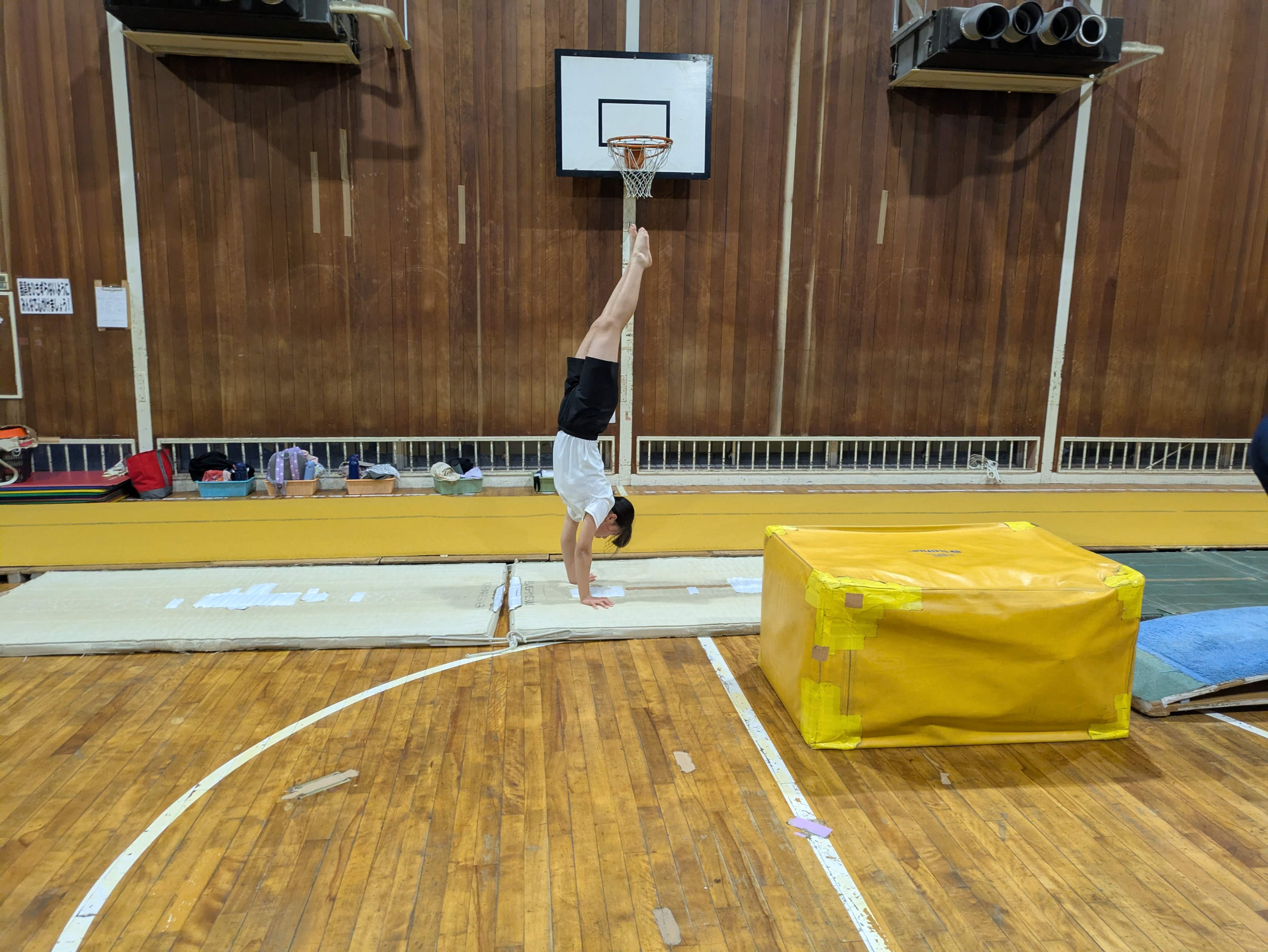 トレーニングでは、倒立歩行や跳び箱で足の振り上げなどをしました。