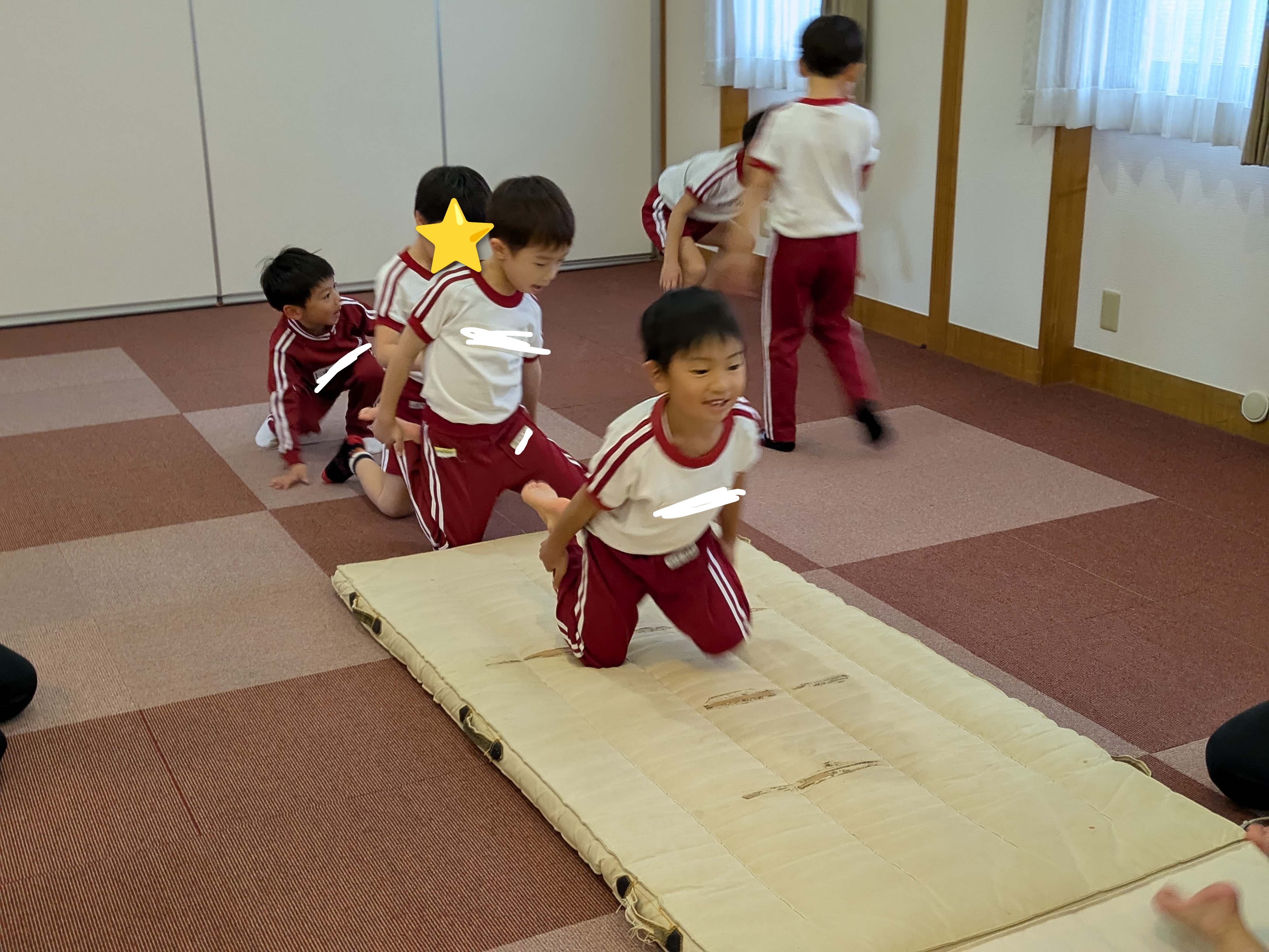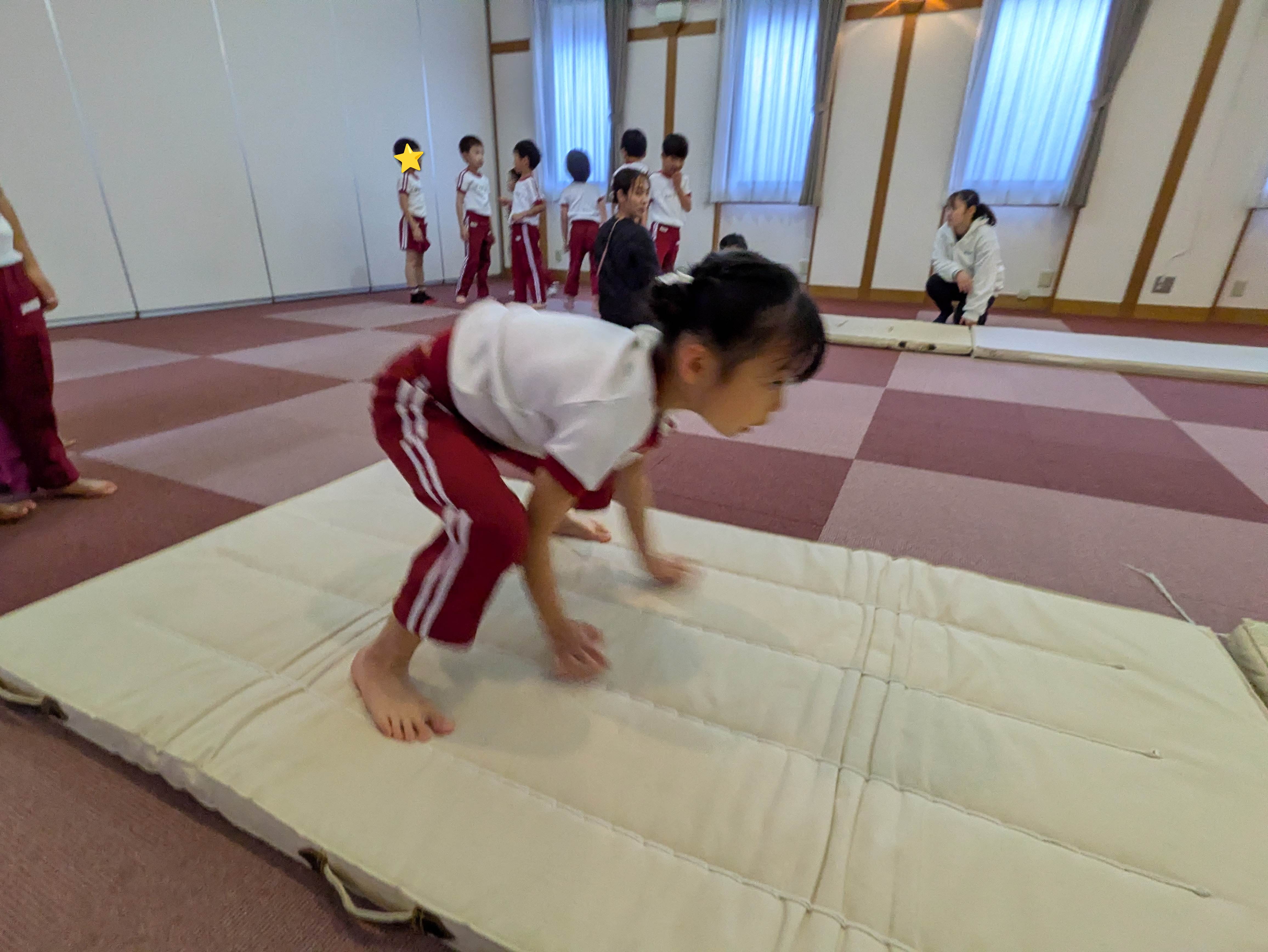 マットでは、くまやぺんぎんなどの基礎的な運動をしました。カエルでは、手の近くまで足を運ぶように意識して取り組みました!