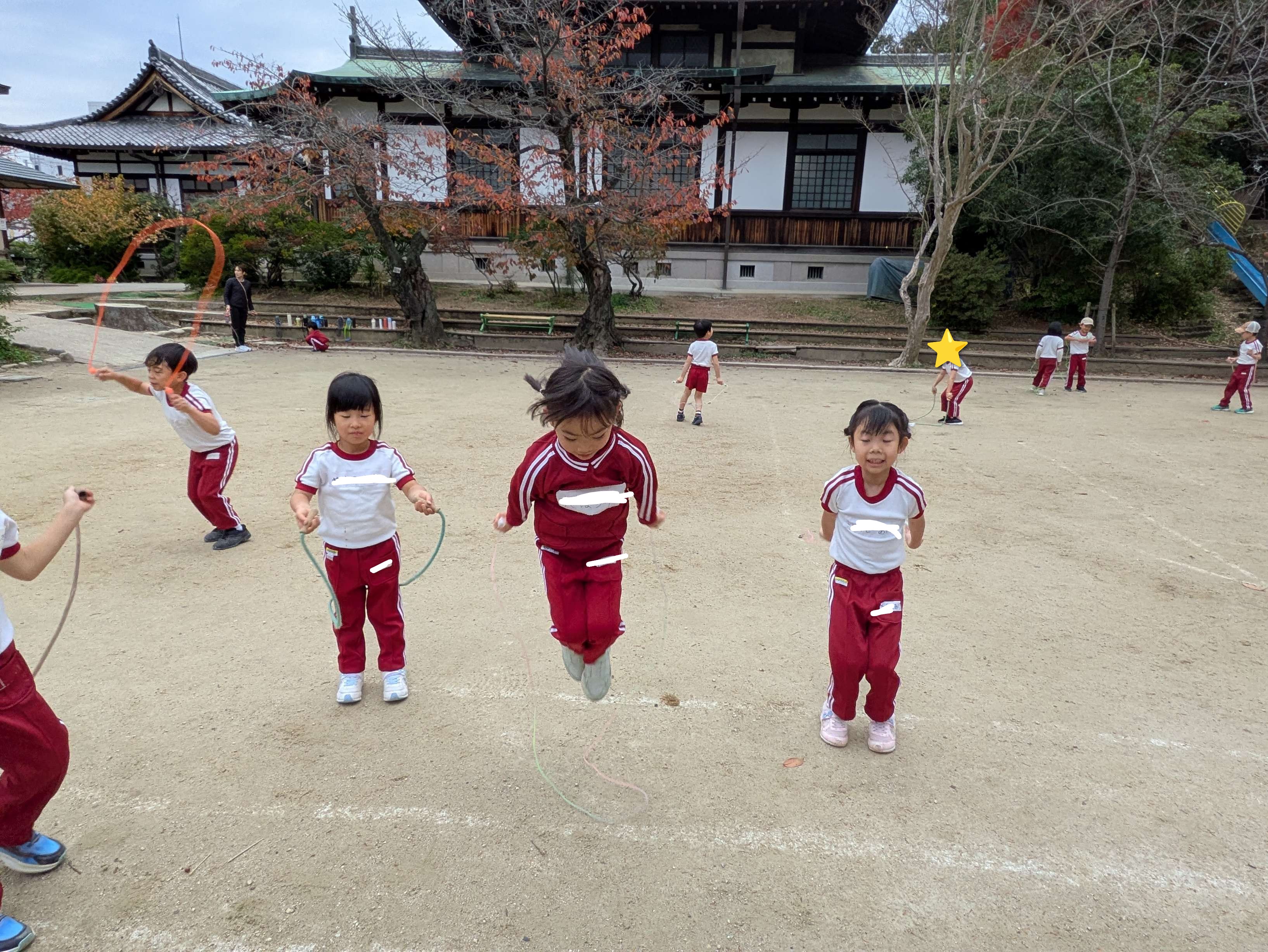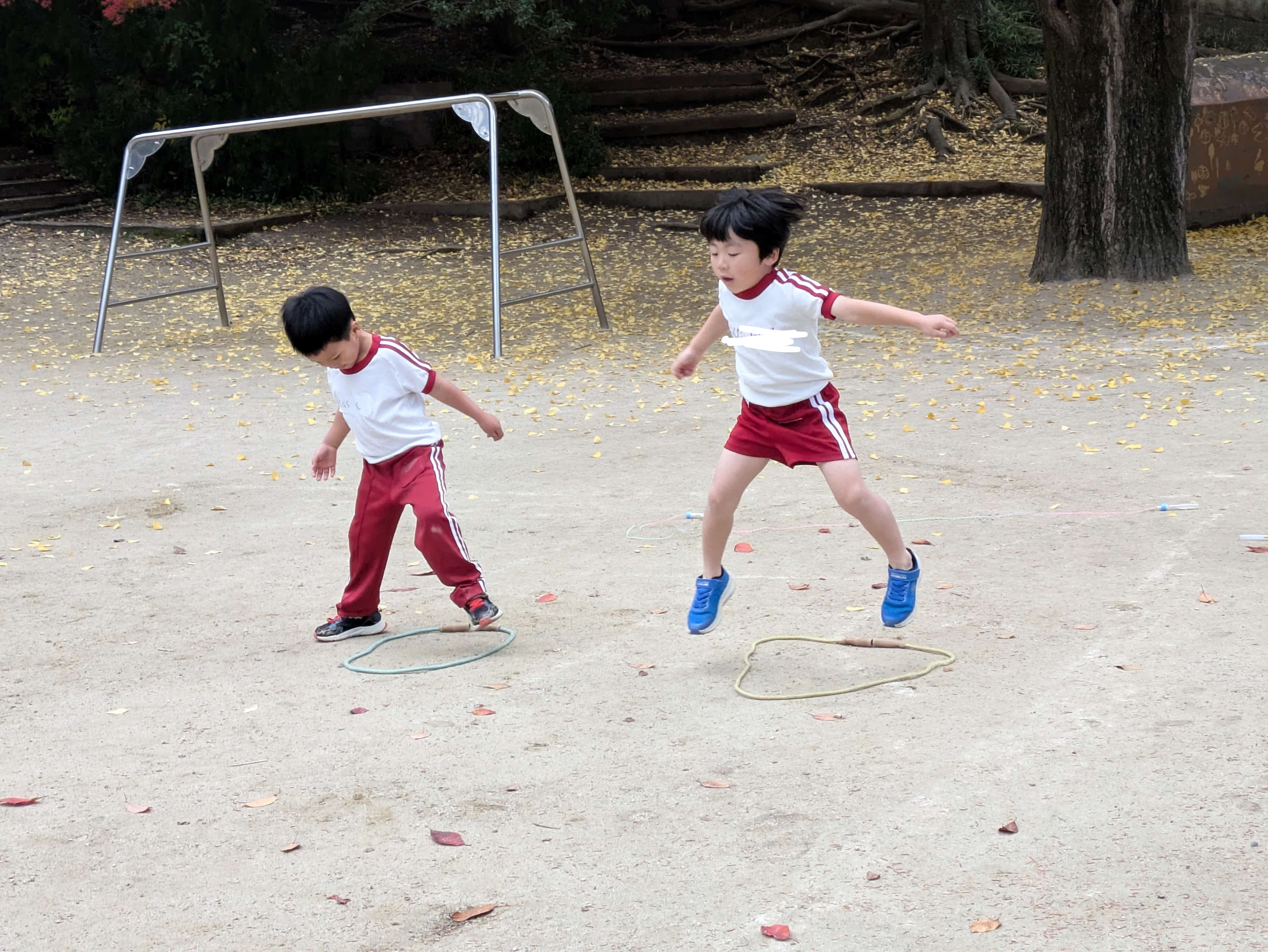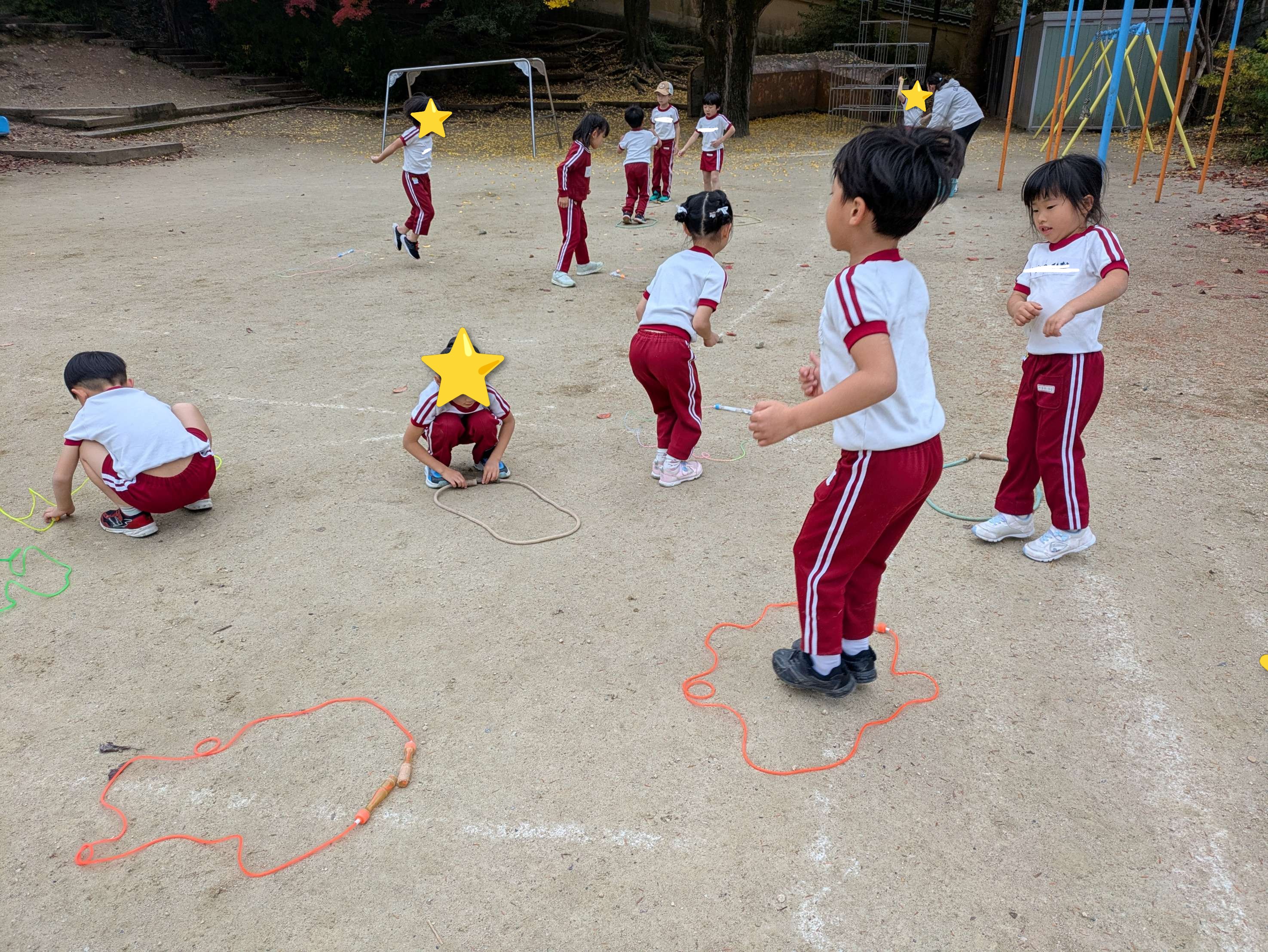 今日は、縄でわっかを作ってその中にジャンプで入ったり、パージャンプをしたり、一本の縄を踏まないように回転したりしました!
