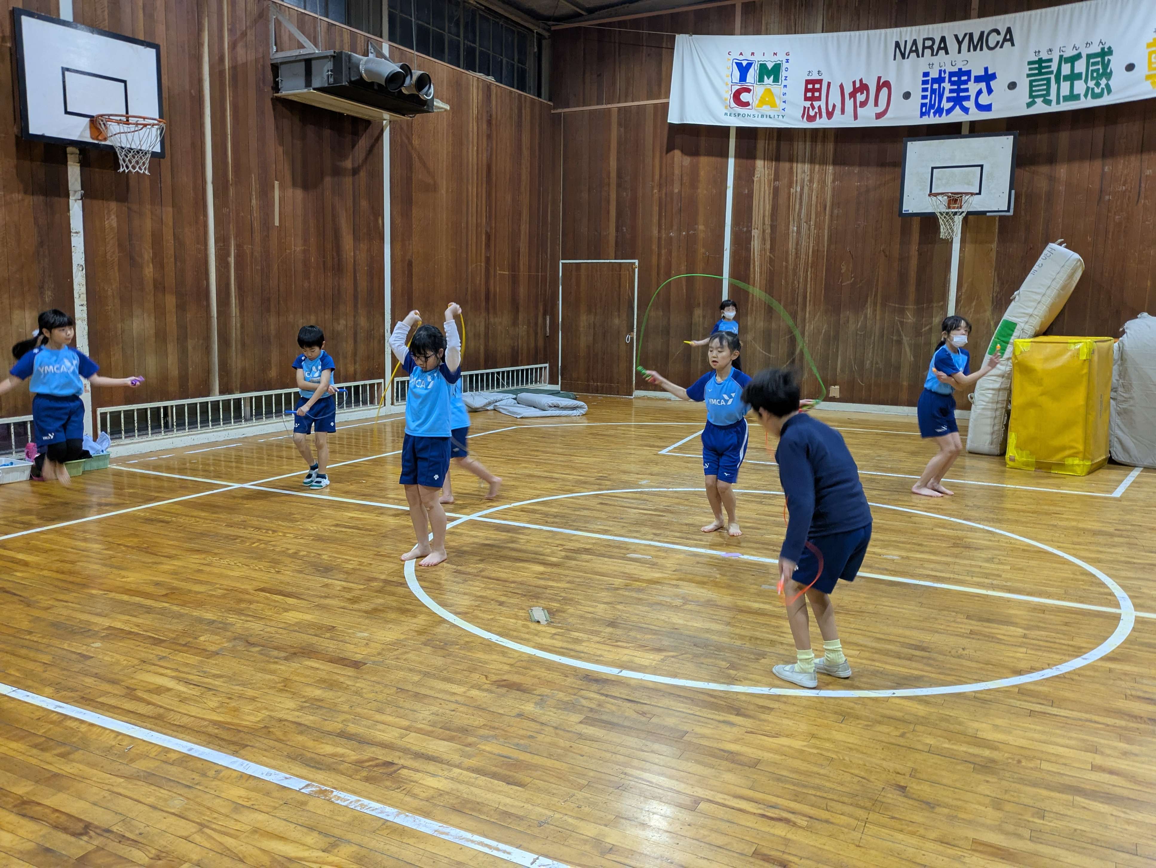 今日ははじめに、リズムジャンプをしました。曲に合わせて、横ジャンプやチョキジャンプをしました!みんなしっかり曲を聞いて、テンポに合わせてできていましたね!