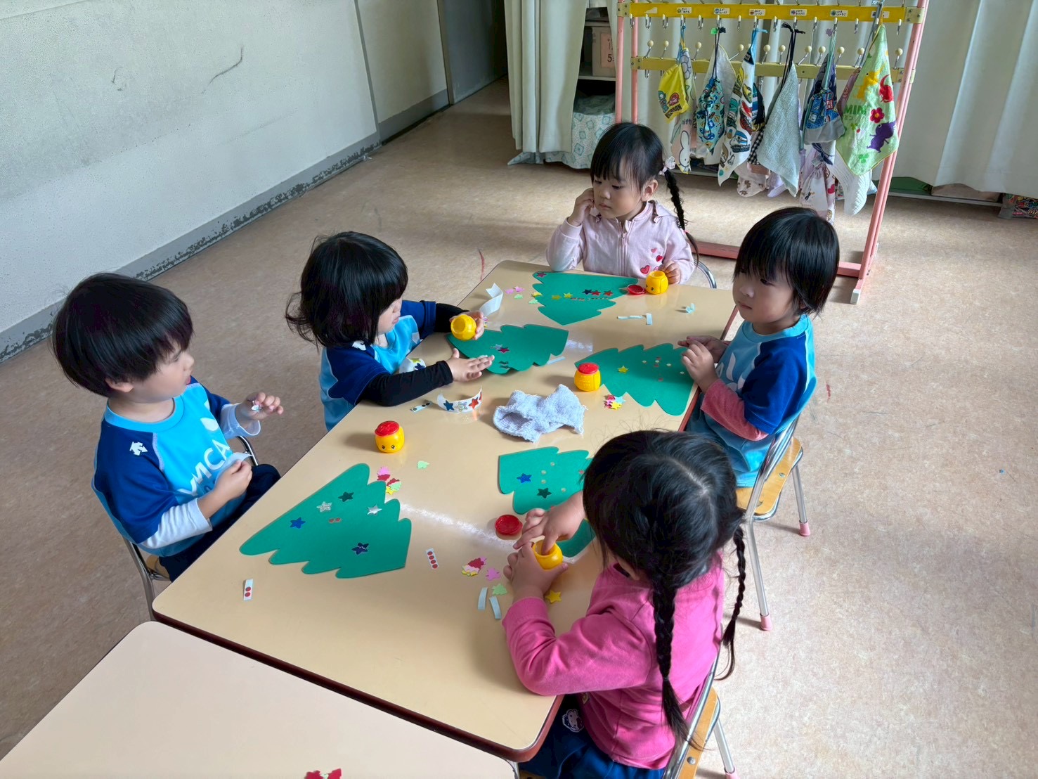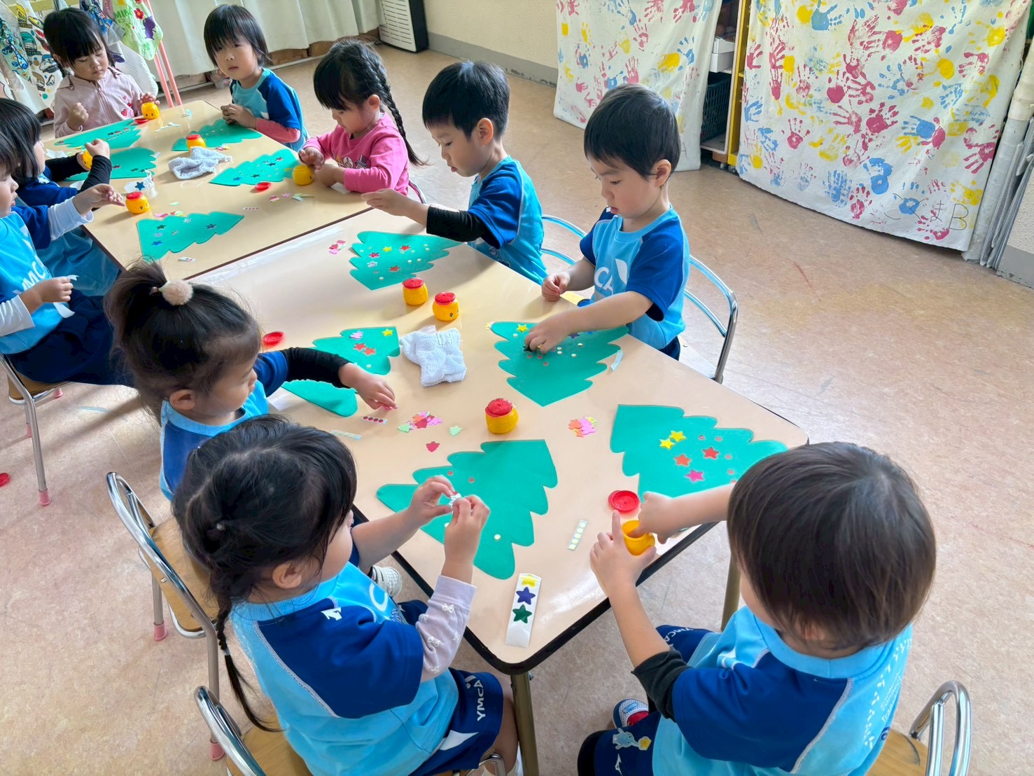 お部屋ではクリスマスツリーを作りました。のりやシールで可愛く仕上がりました。次回持って帰りますね!