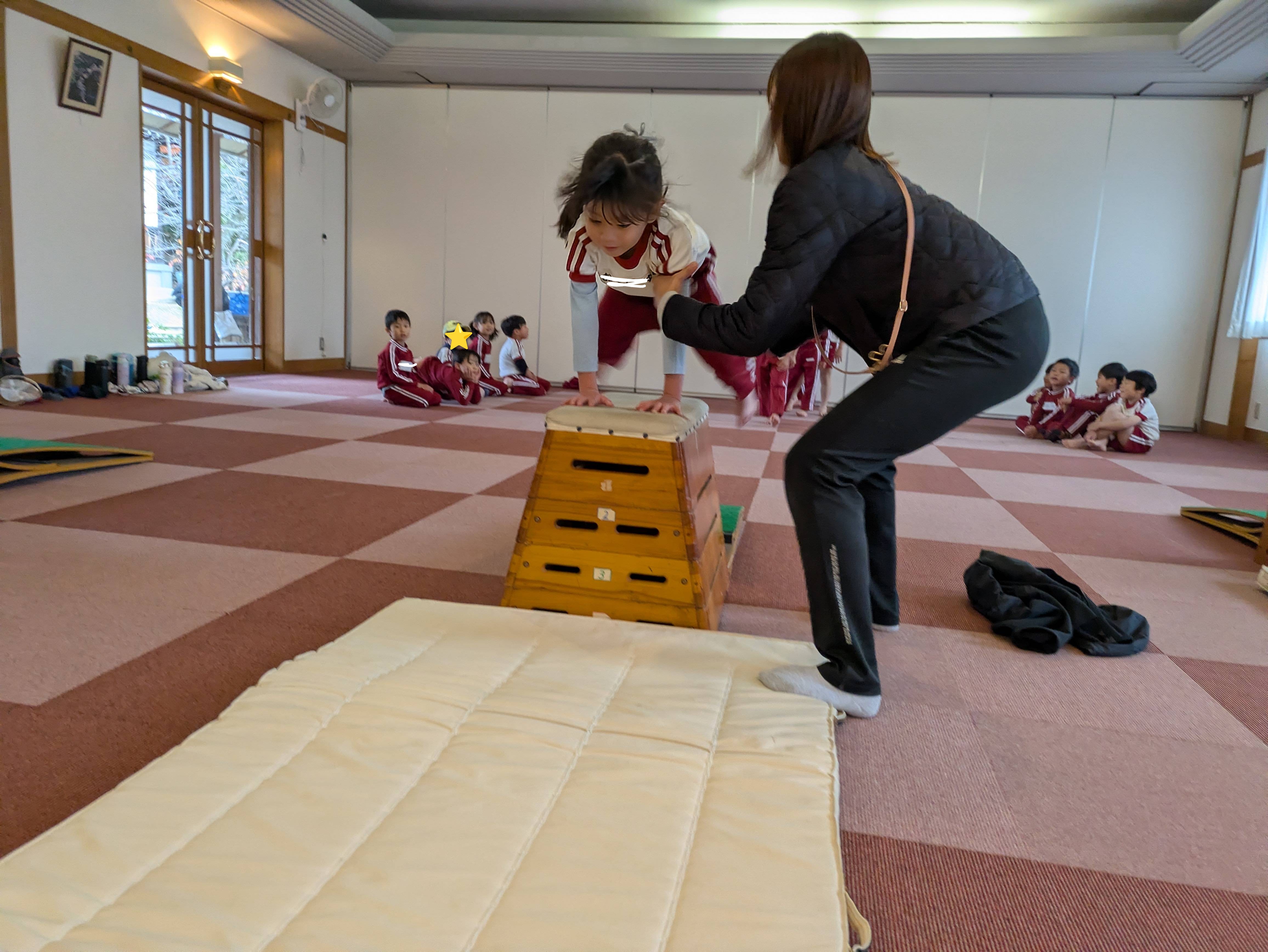 自信を持って跳ぶことができるお友だちが増えましたね!リーダーのお手伝いがあると、上手に跳べるお友だちも多いので、1人でもできるように頑張りましょう!