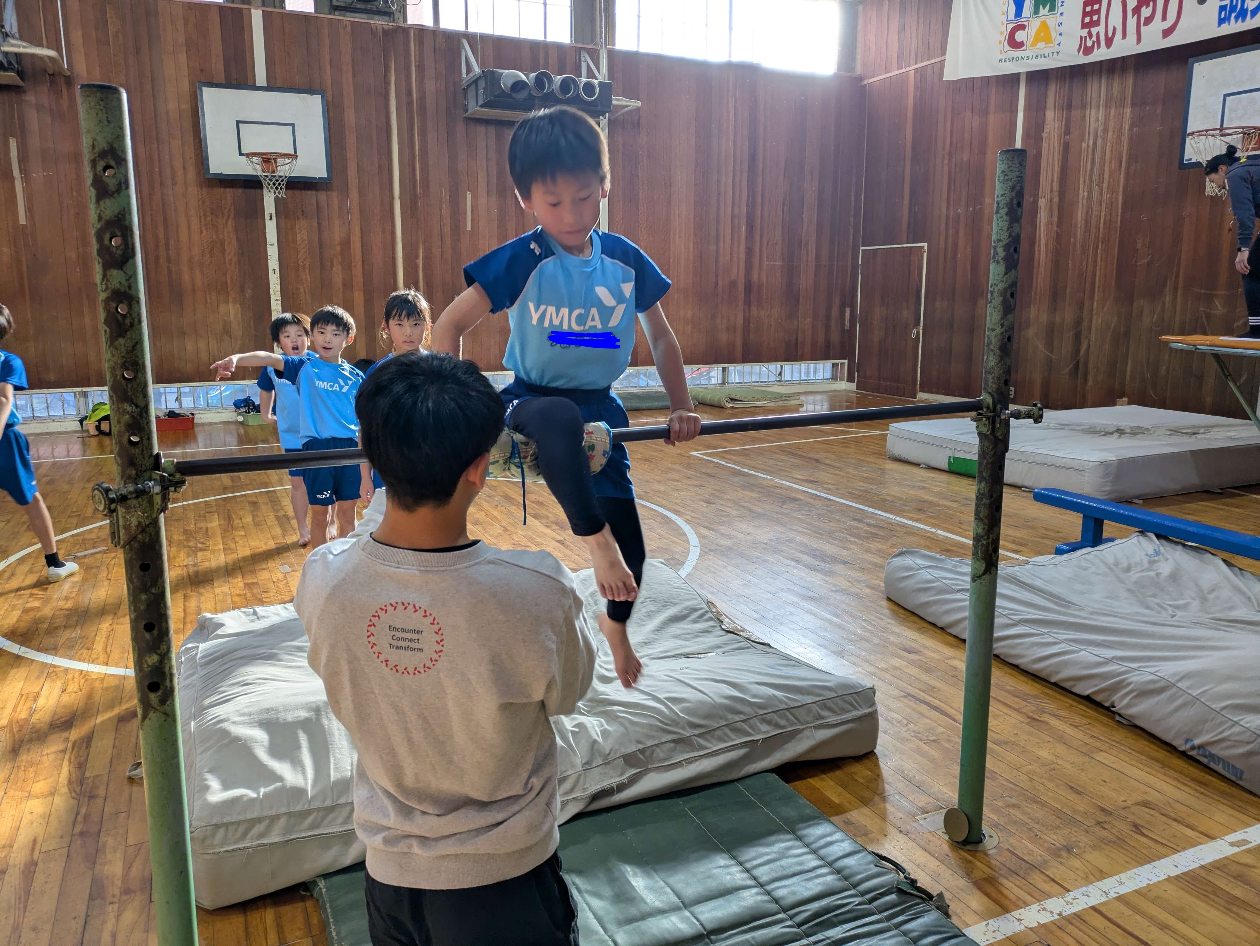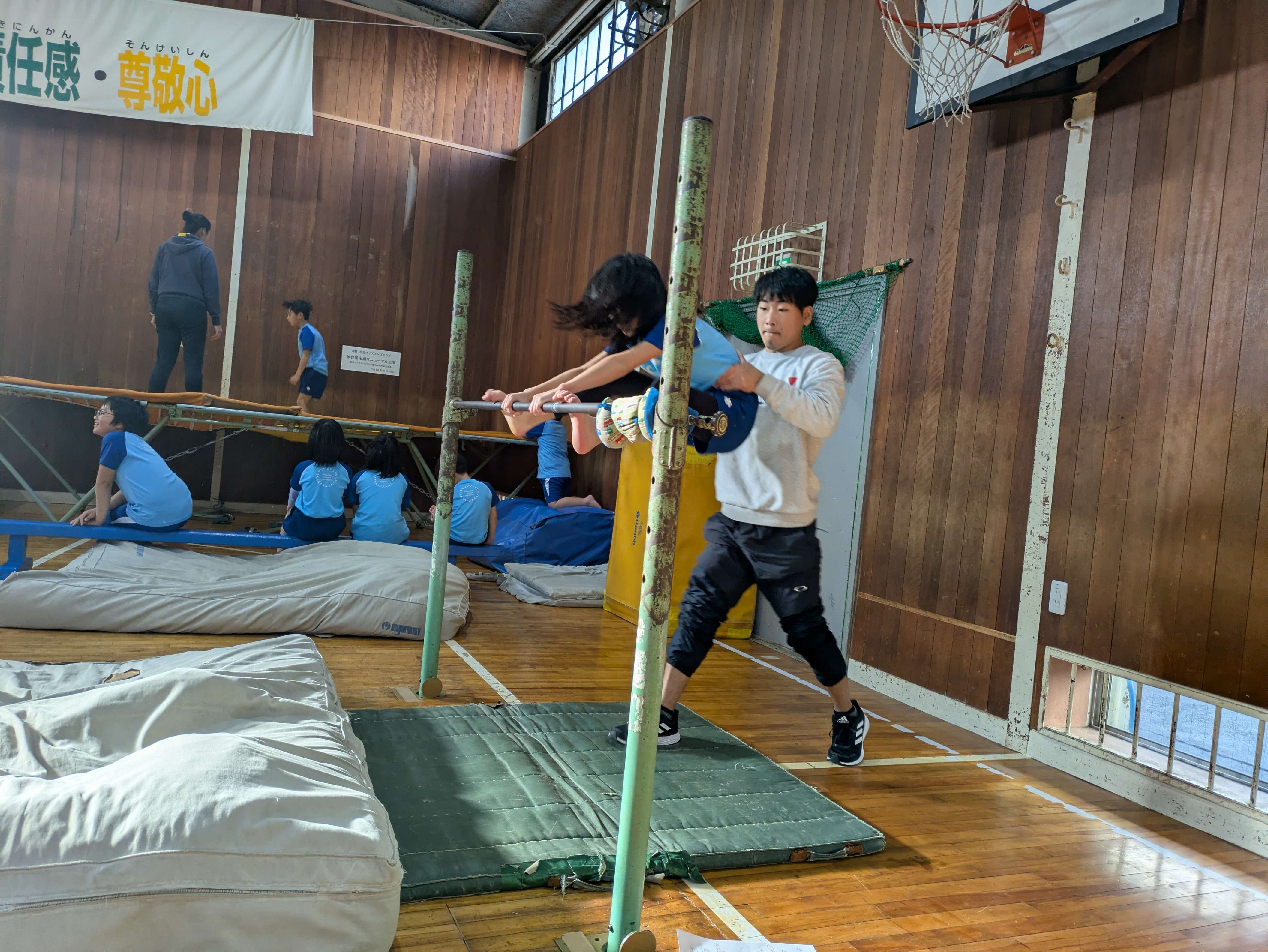 鉄棒では、足の振りをしっかり使って回るようにしましょう!