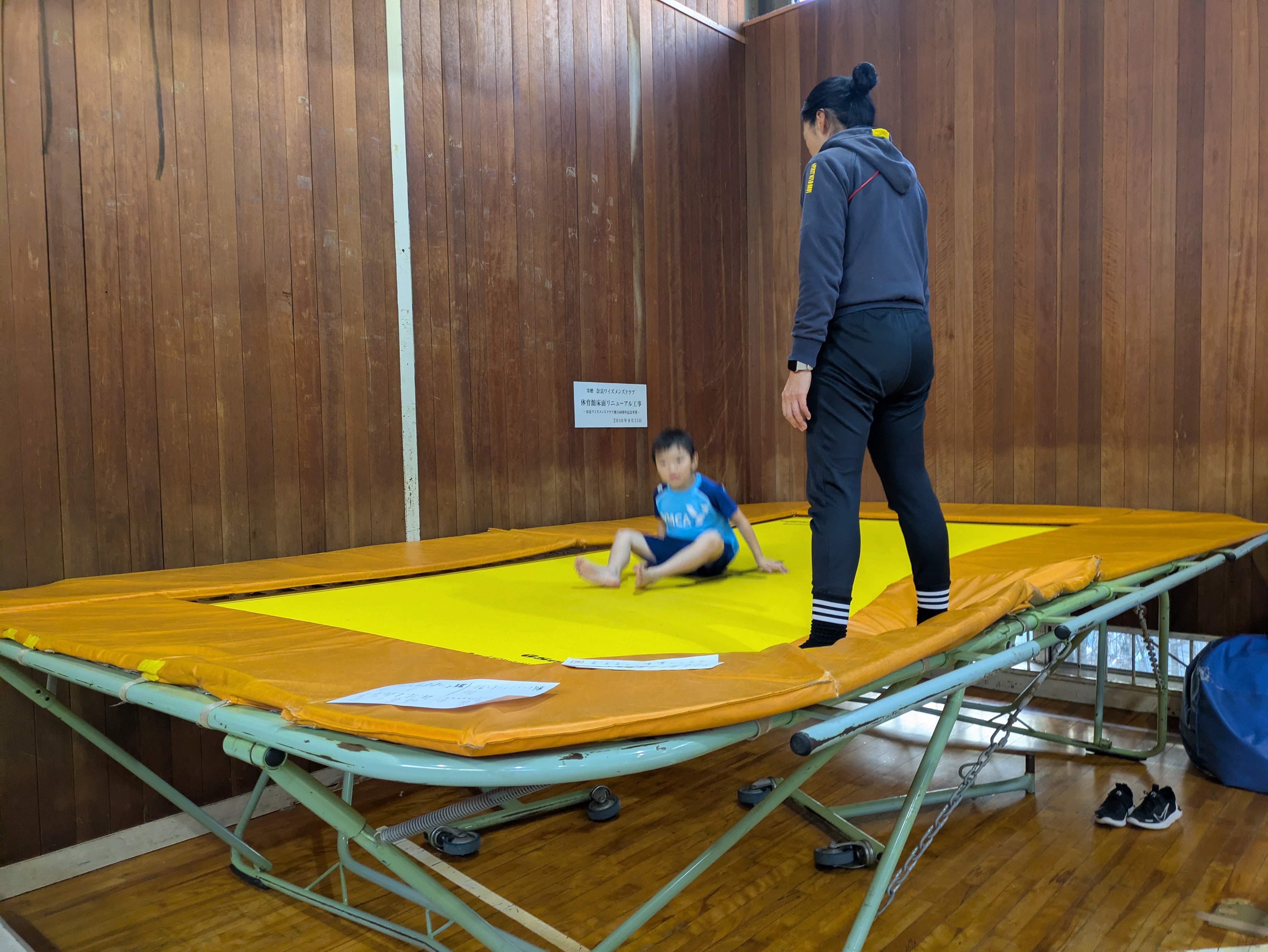 トランポリンでは、空中でも体に力を入れてコントロールできるよう頑張りましょう!