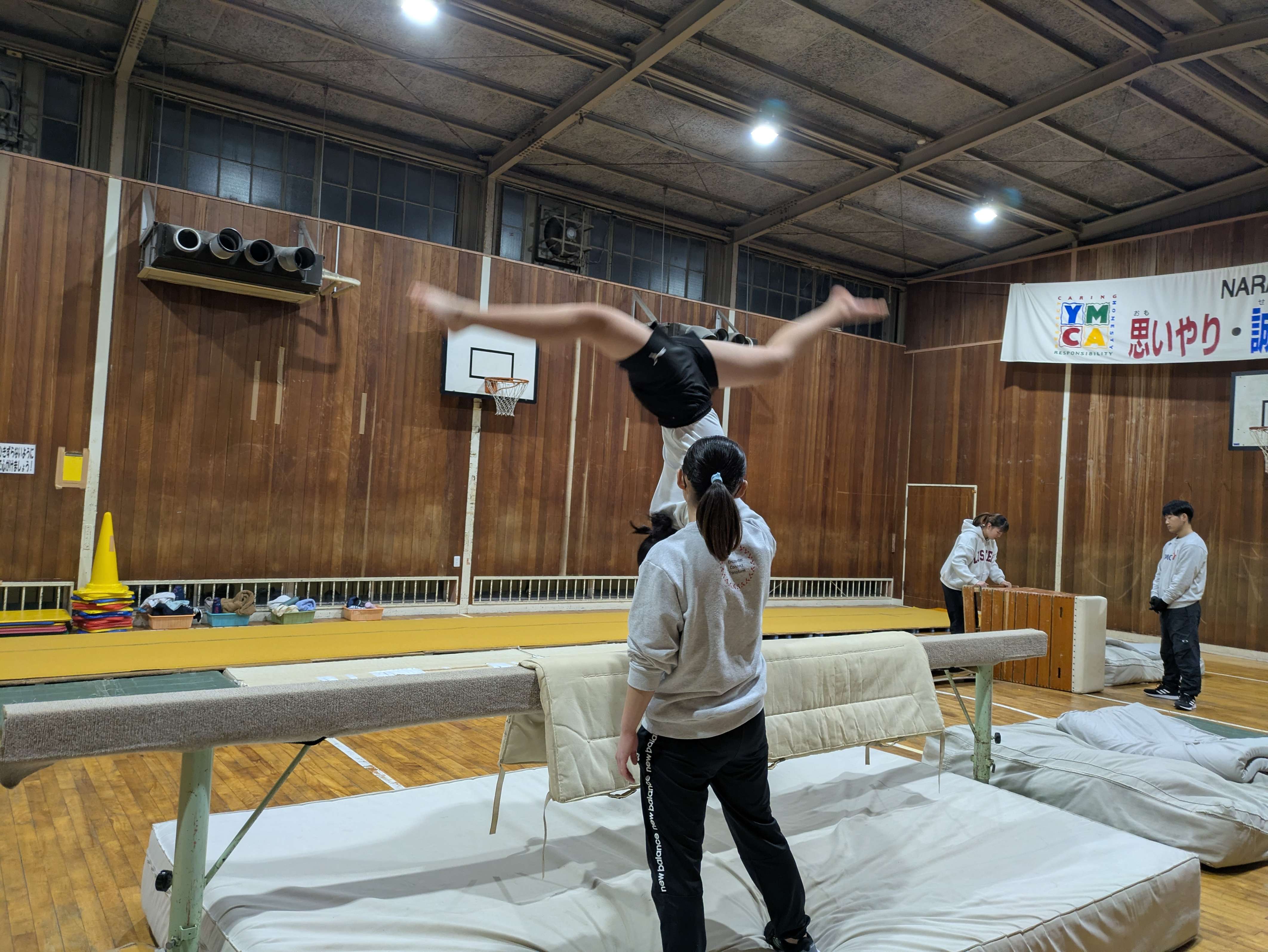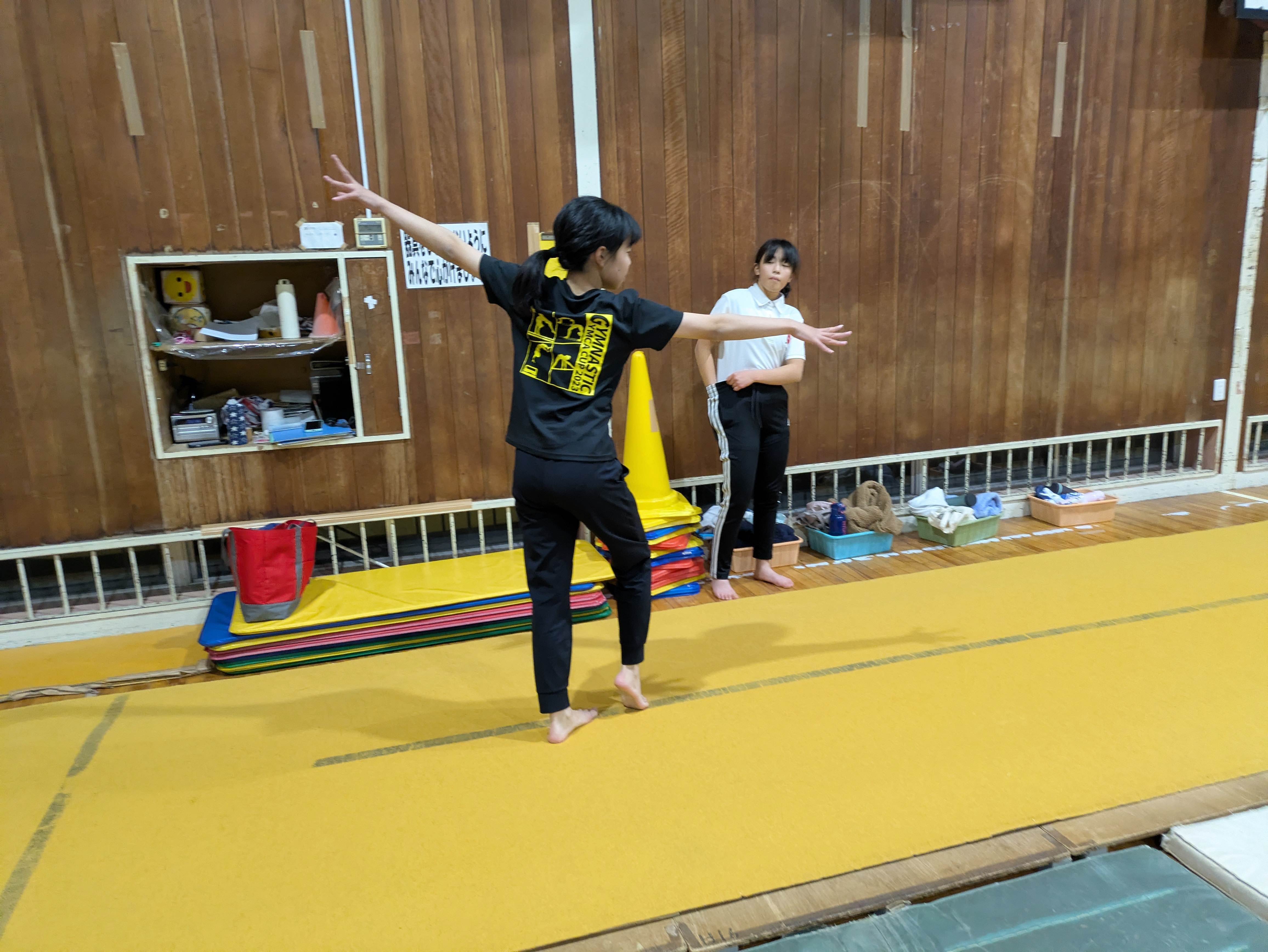 トレーニングでは、倒立歩行や着地まで意識をして跳び箱の跳び越しなどをしました。
