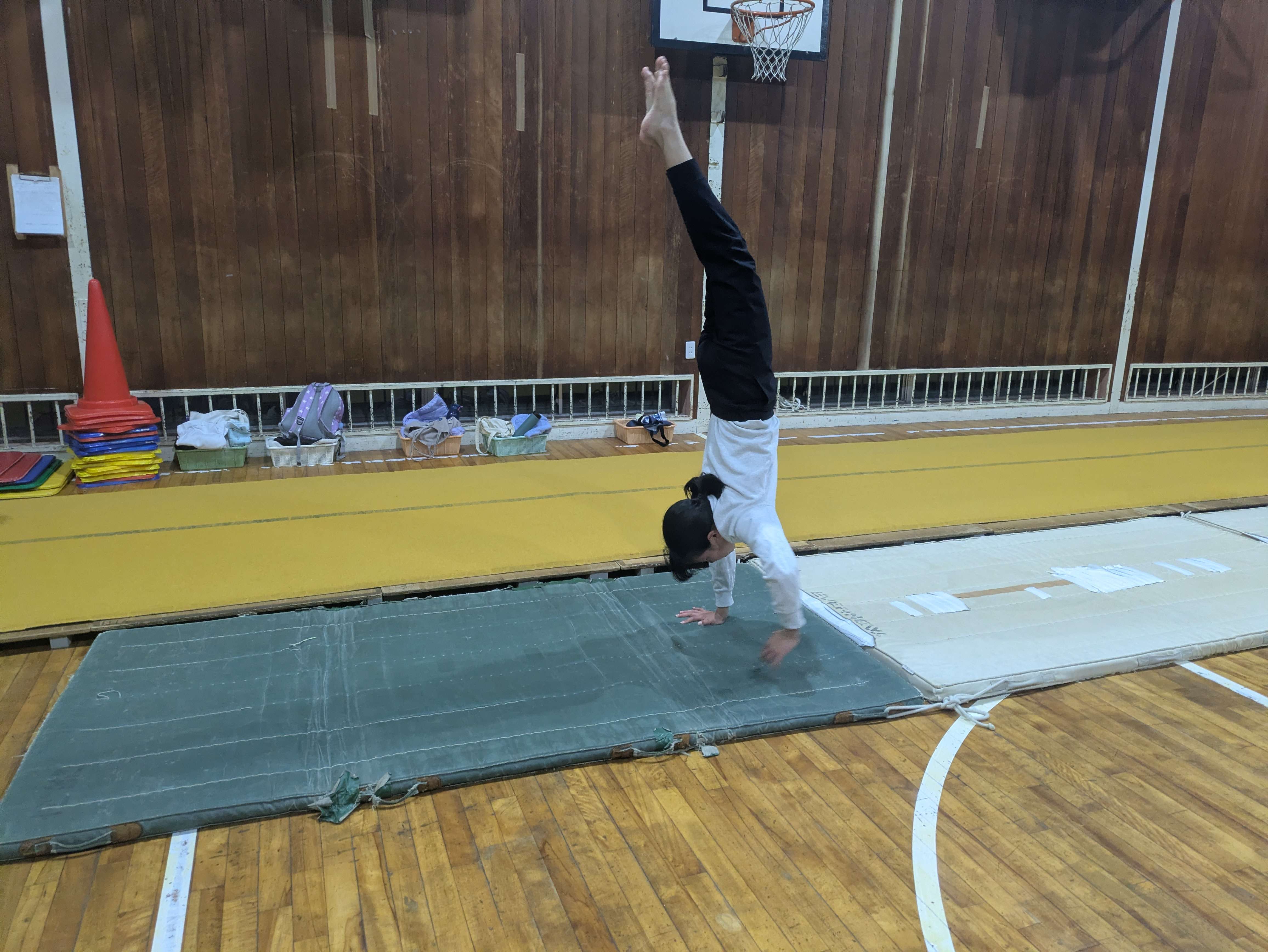 足の振り上げでは、おしりからではなく、足先から早く振り上げ、倒立になれるようにしましょう!