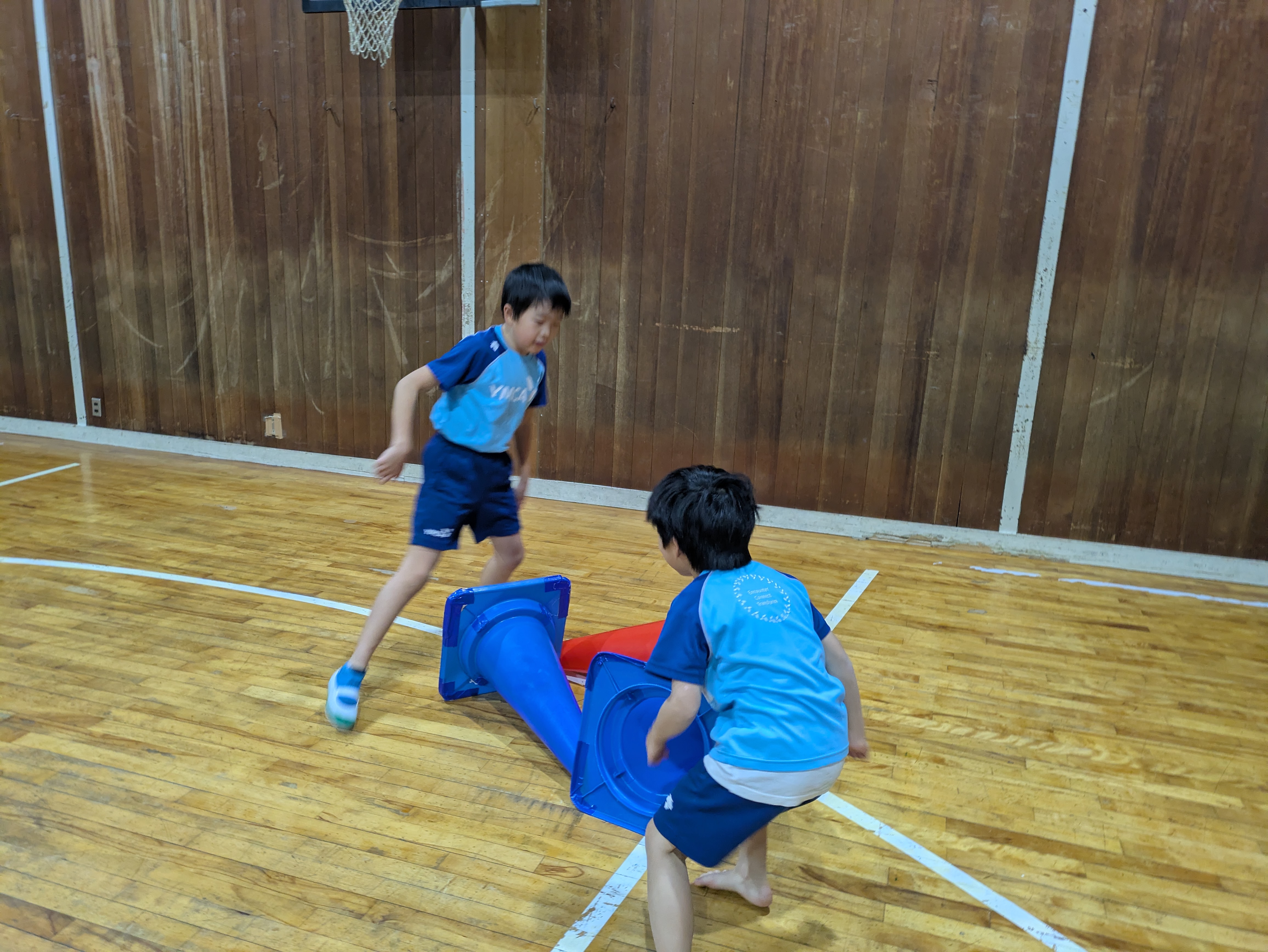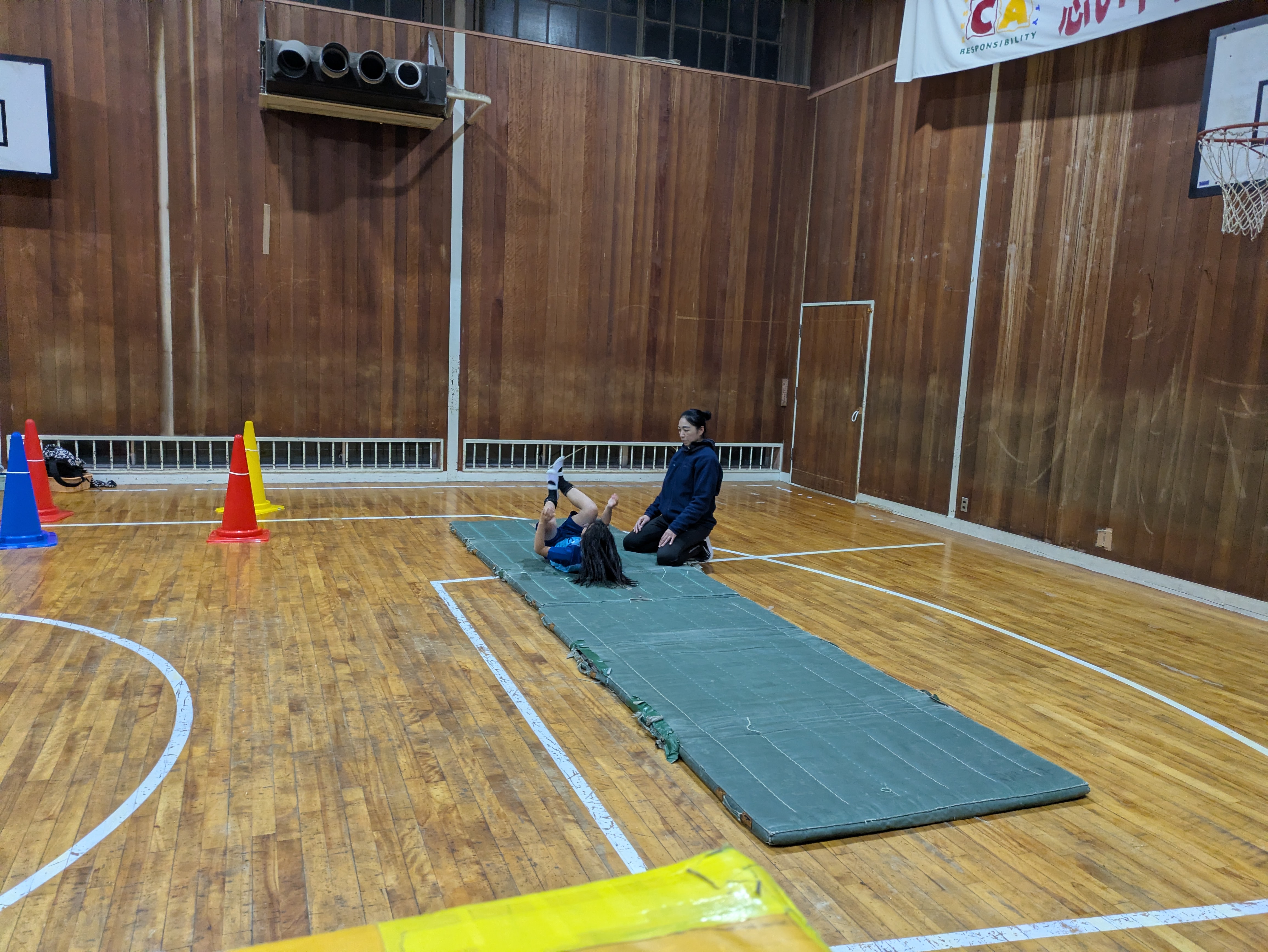 そのあと、前転や足上げ腹筋などのサーキットをしました。台のぼりでは、自分の身長より高い台でも、しっかりジャンプをして腕の力を使って登ることができましたね!