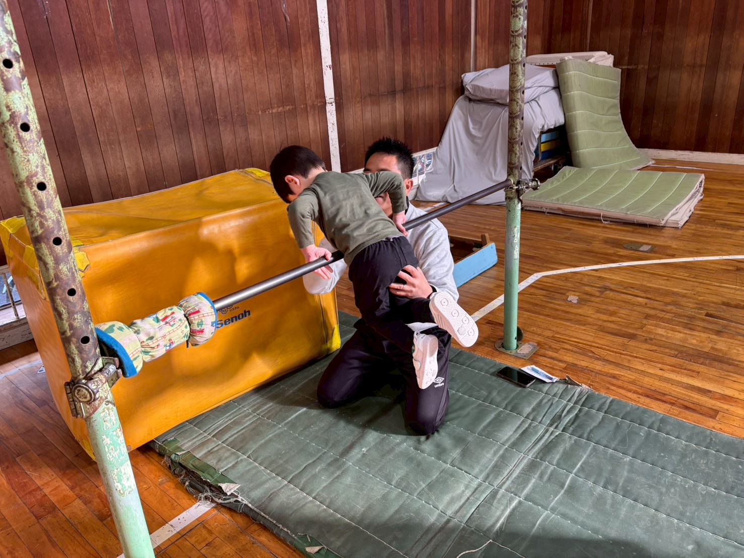 マットでは、昨日に引き続き前転を頑張りました!お腹と足を引っつけたままで、体を丸めてできるようにしましょう!