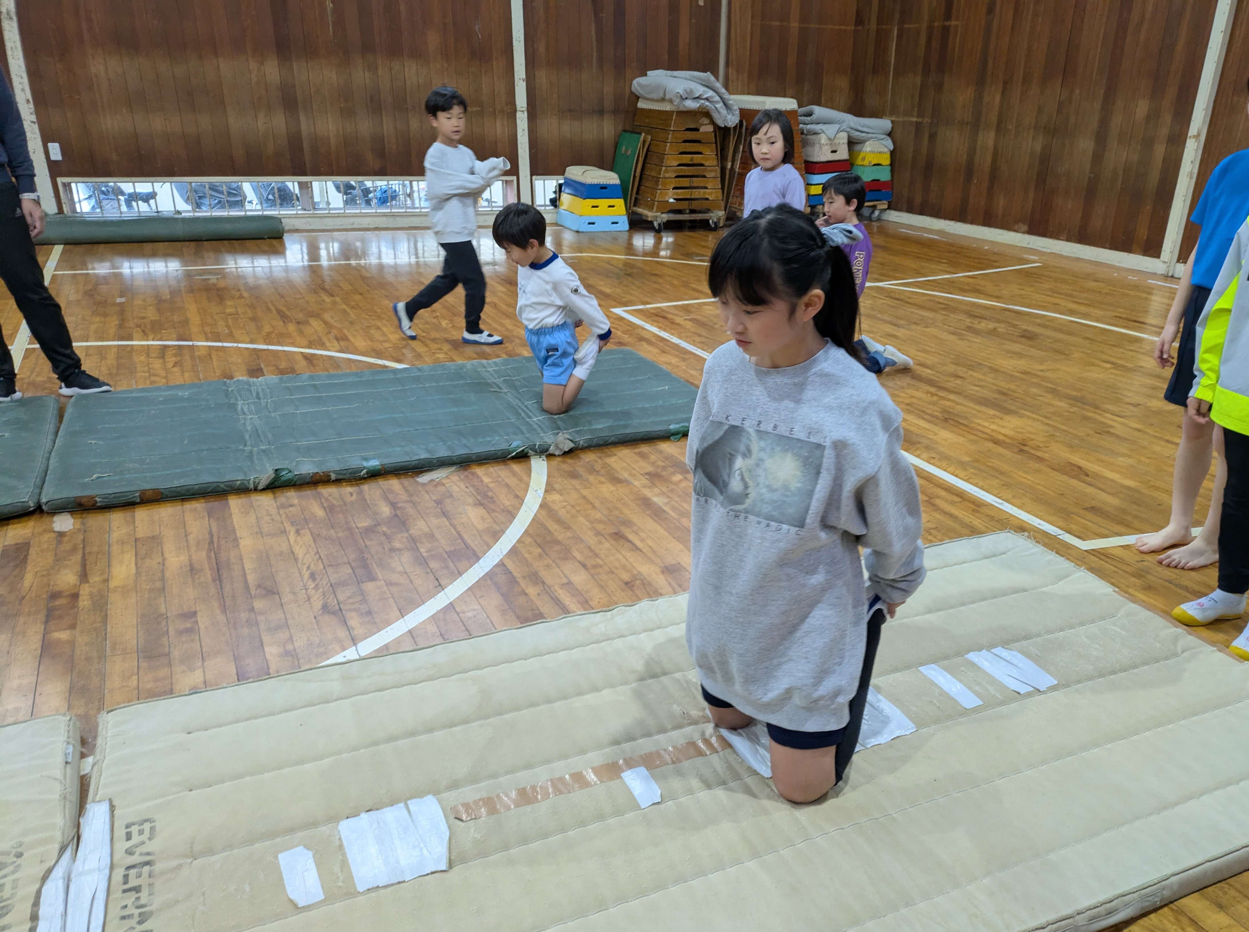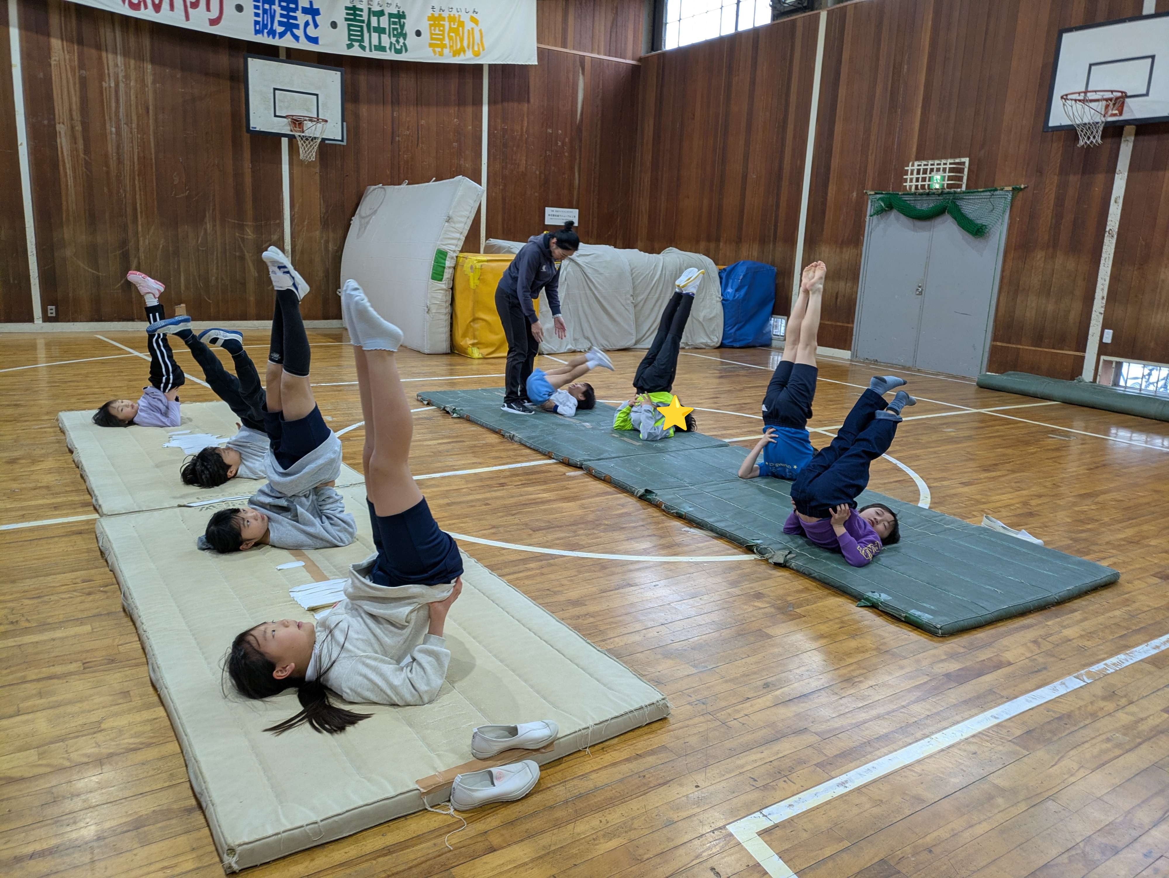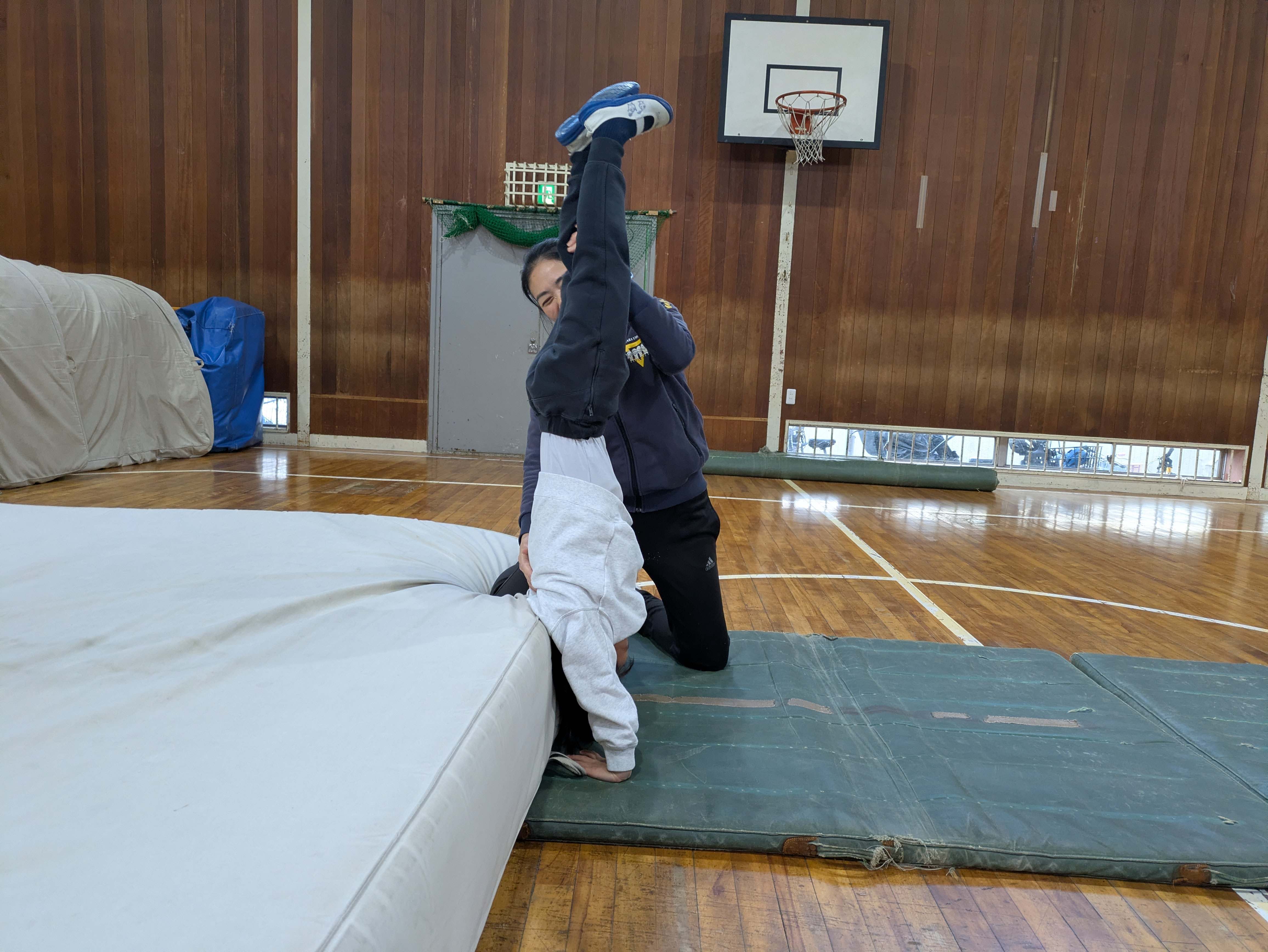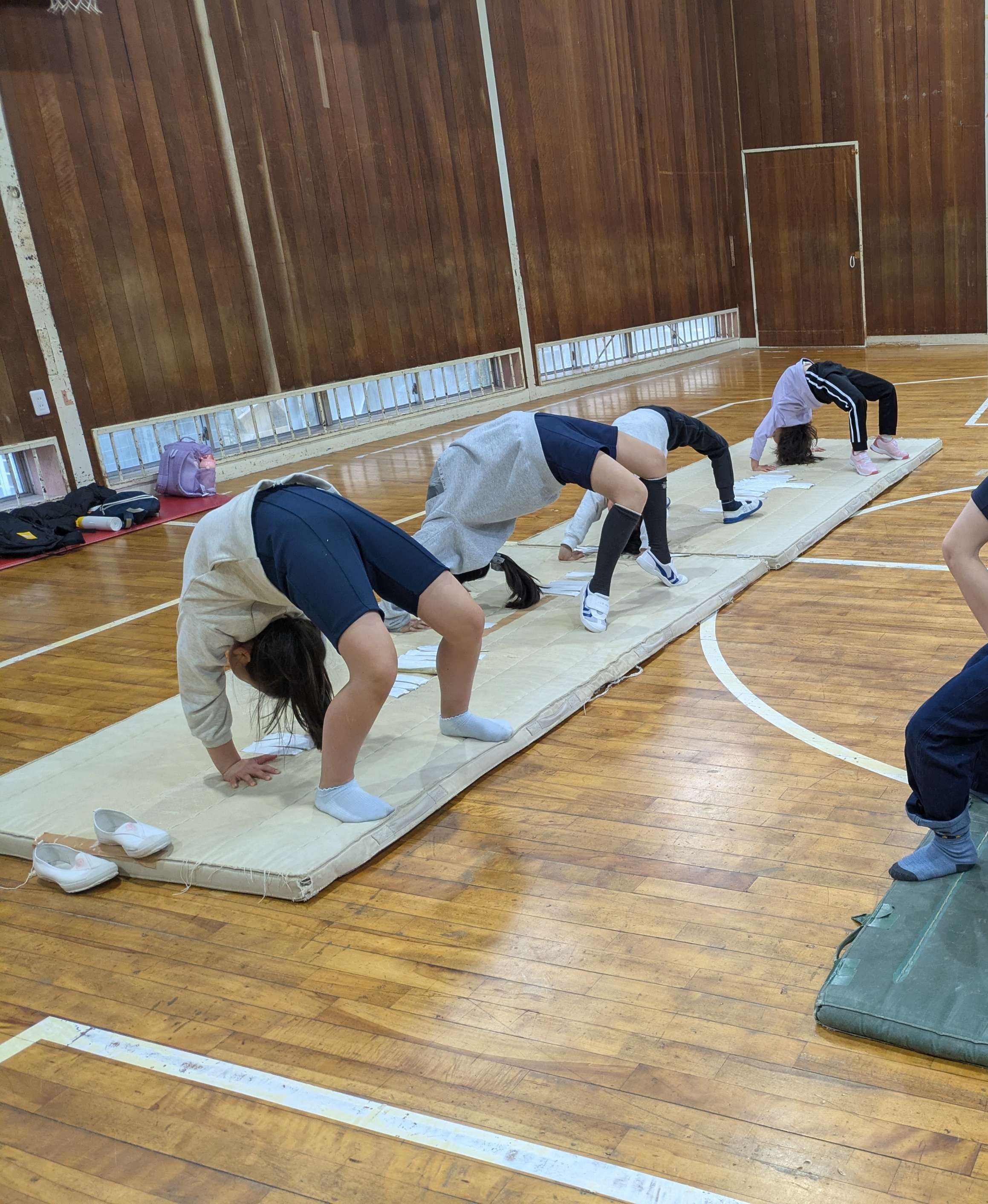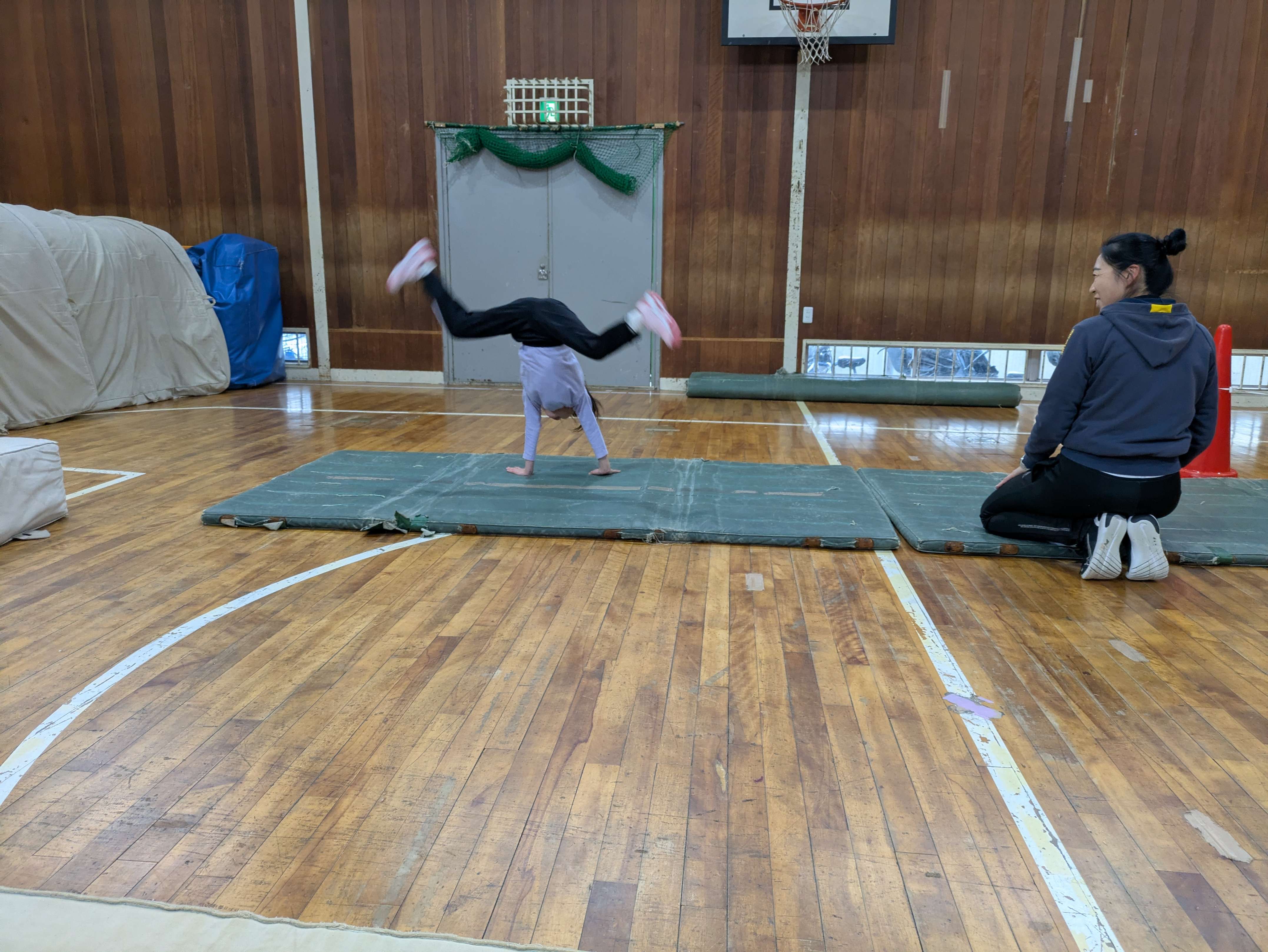 振り上げ倒立では、昨日より勢いよく足を振り上げることができましたね!その足の振り上げを活かして、側転でもまっすぐできるように頑張りましょう!
