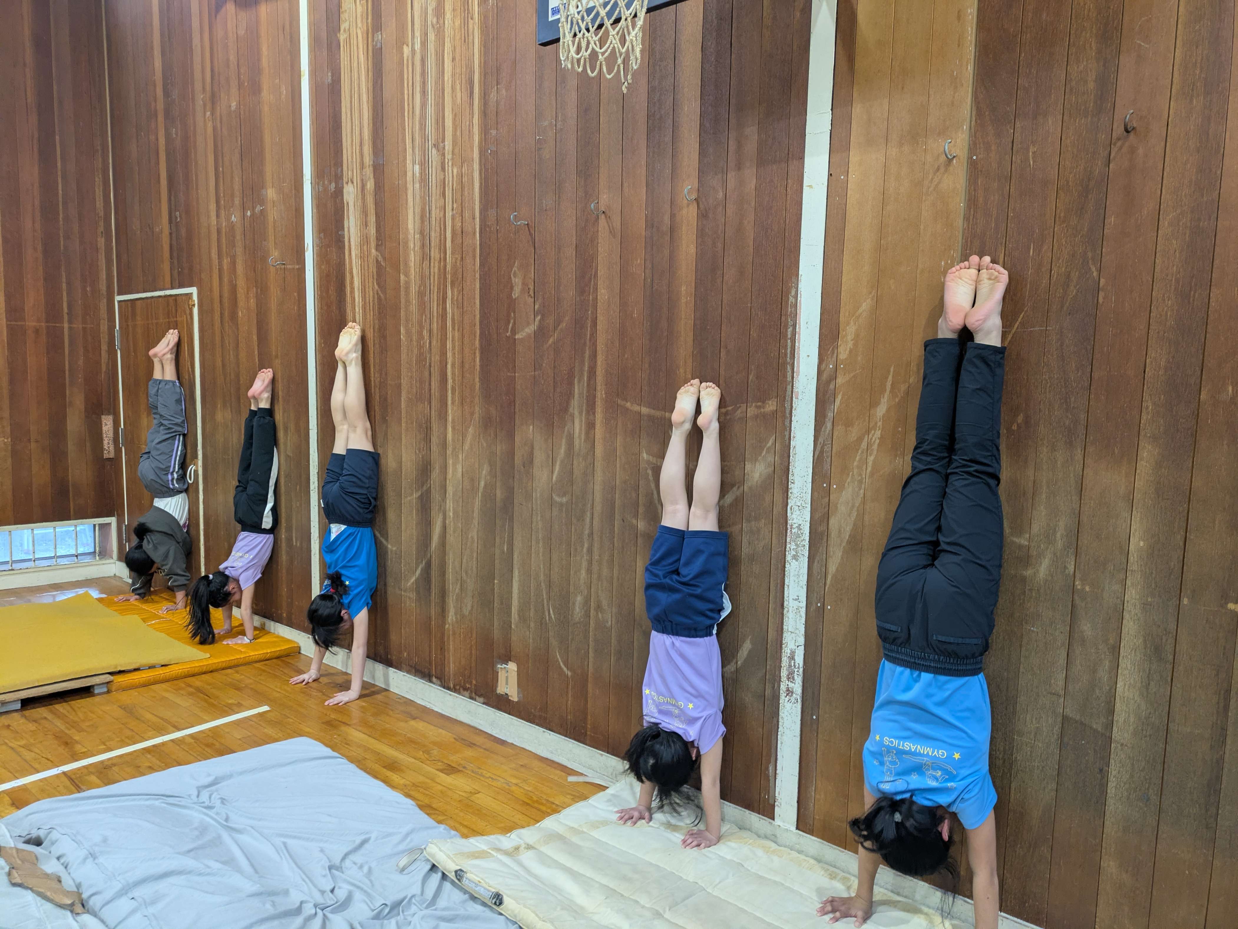今日ははじめに、準備体操と柔軟をして、壁倒立をしました。