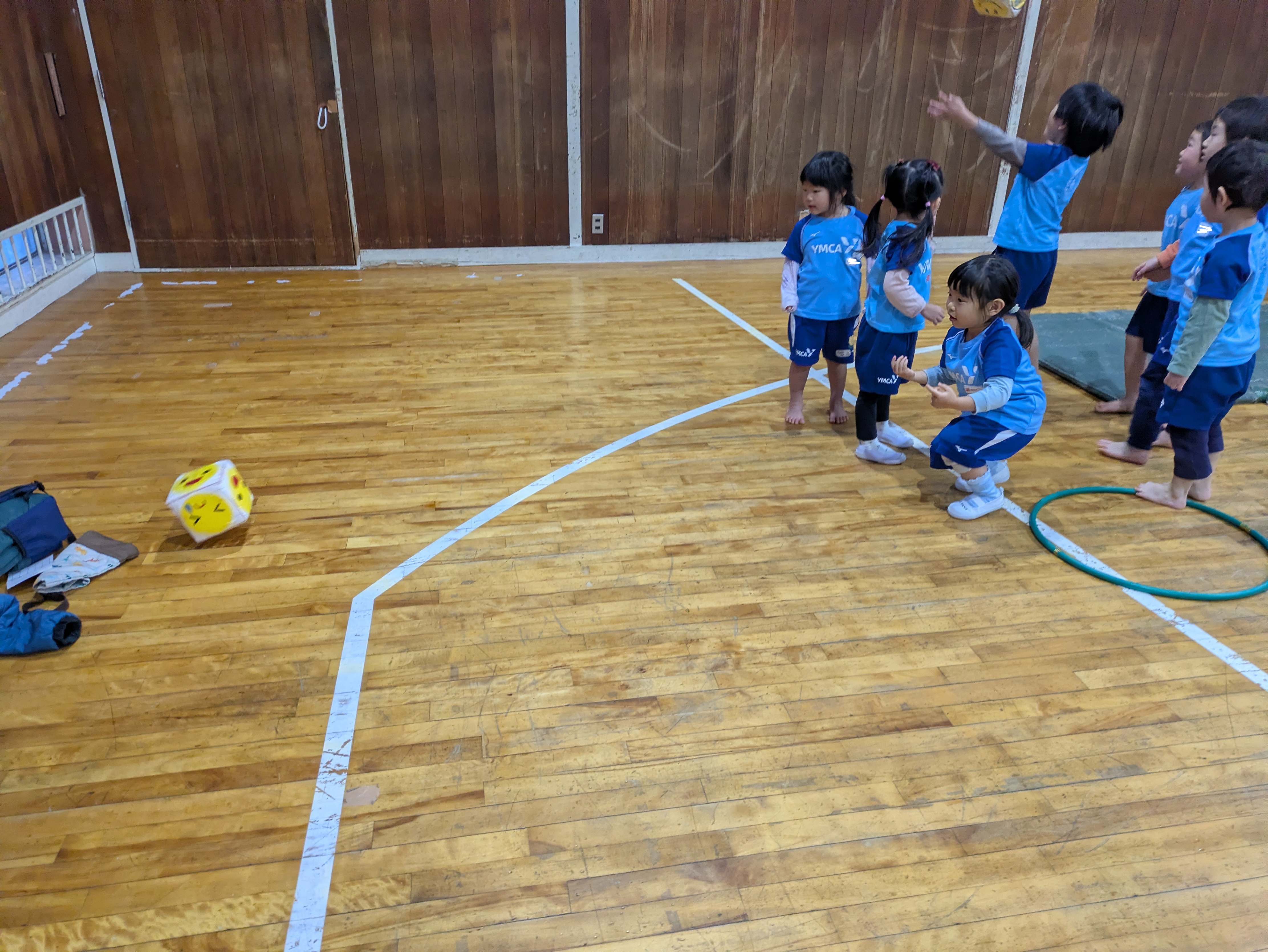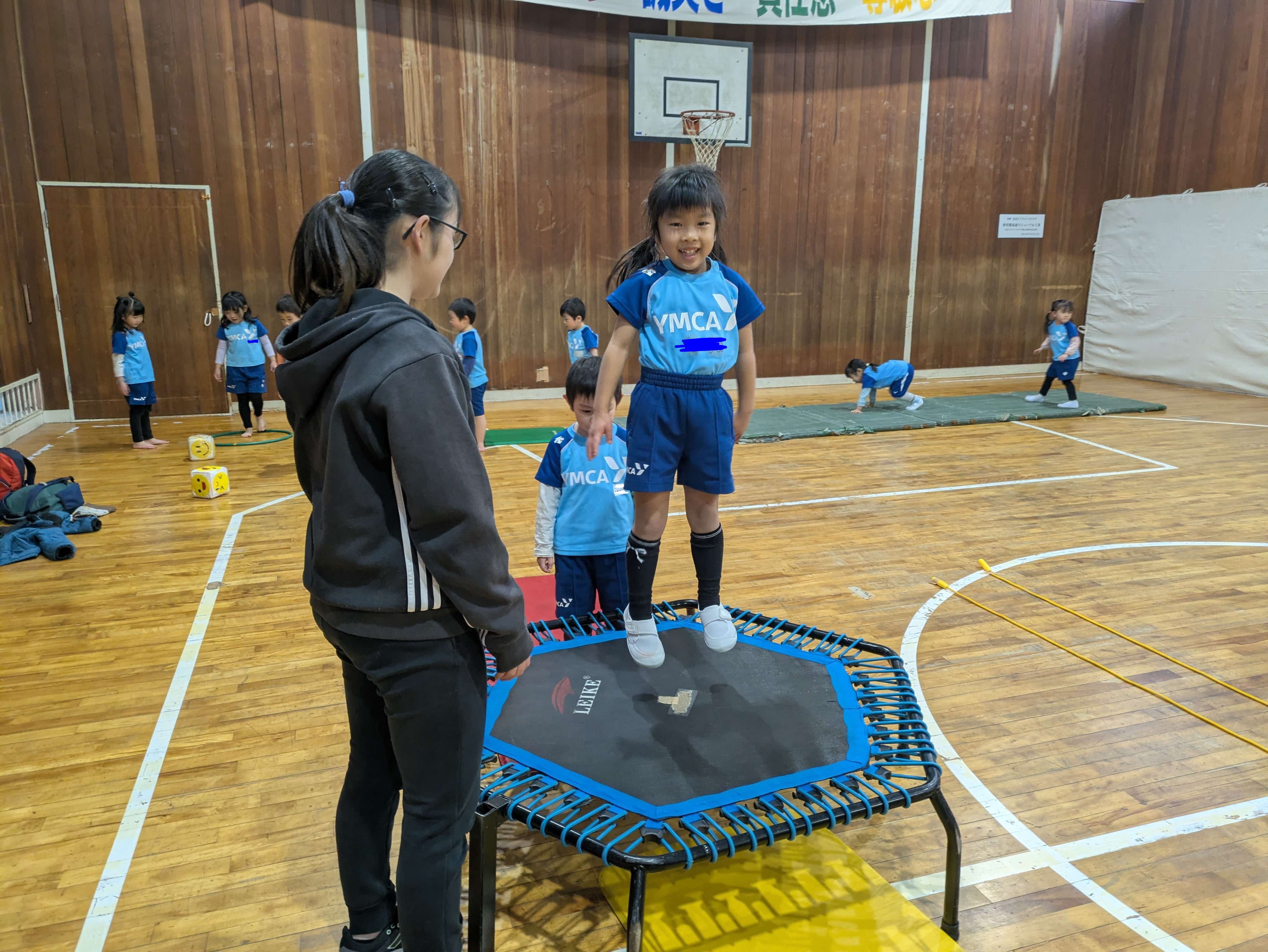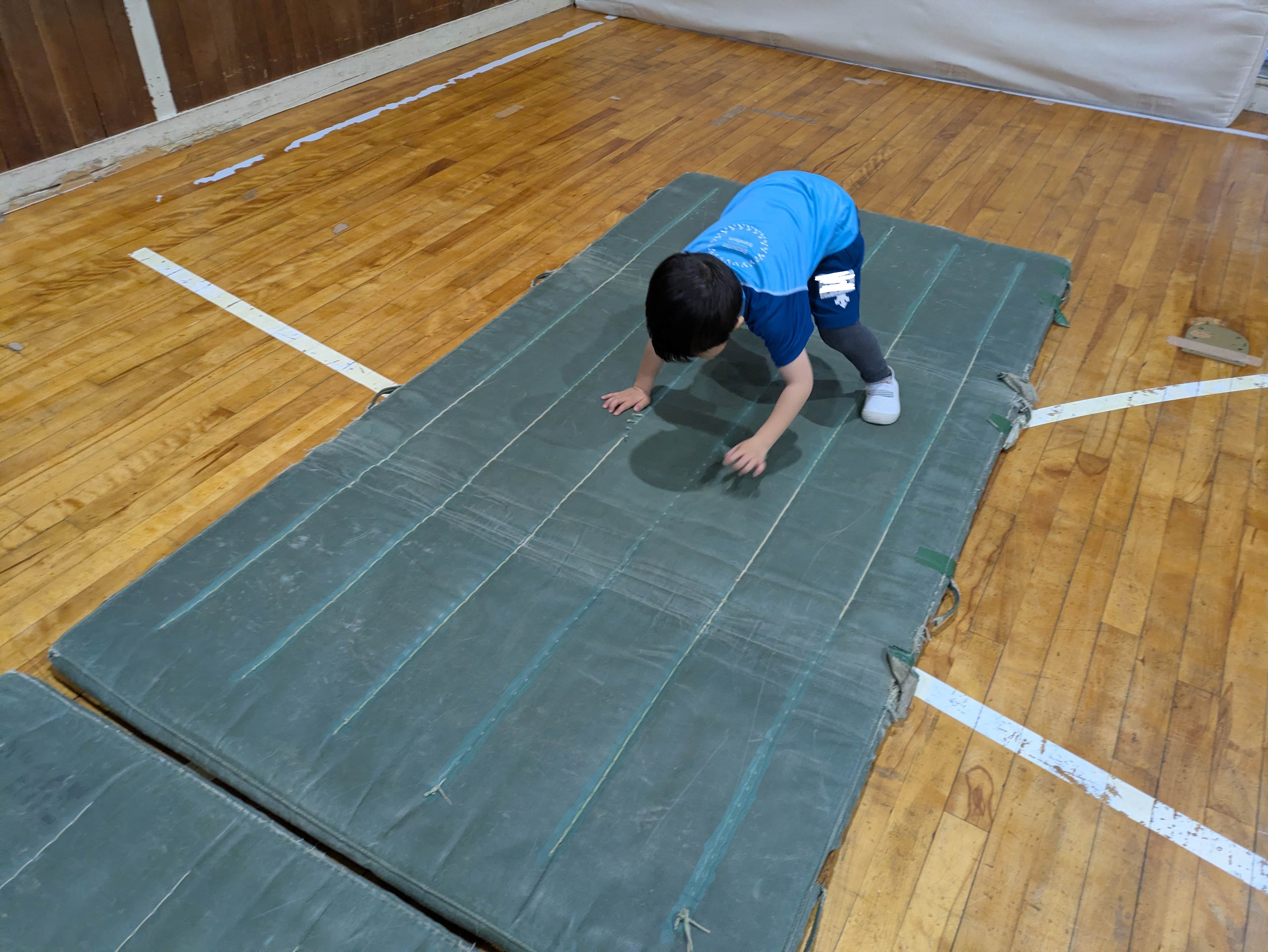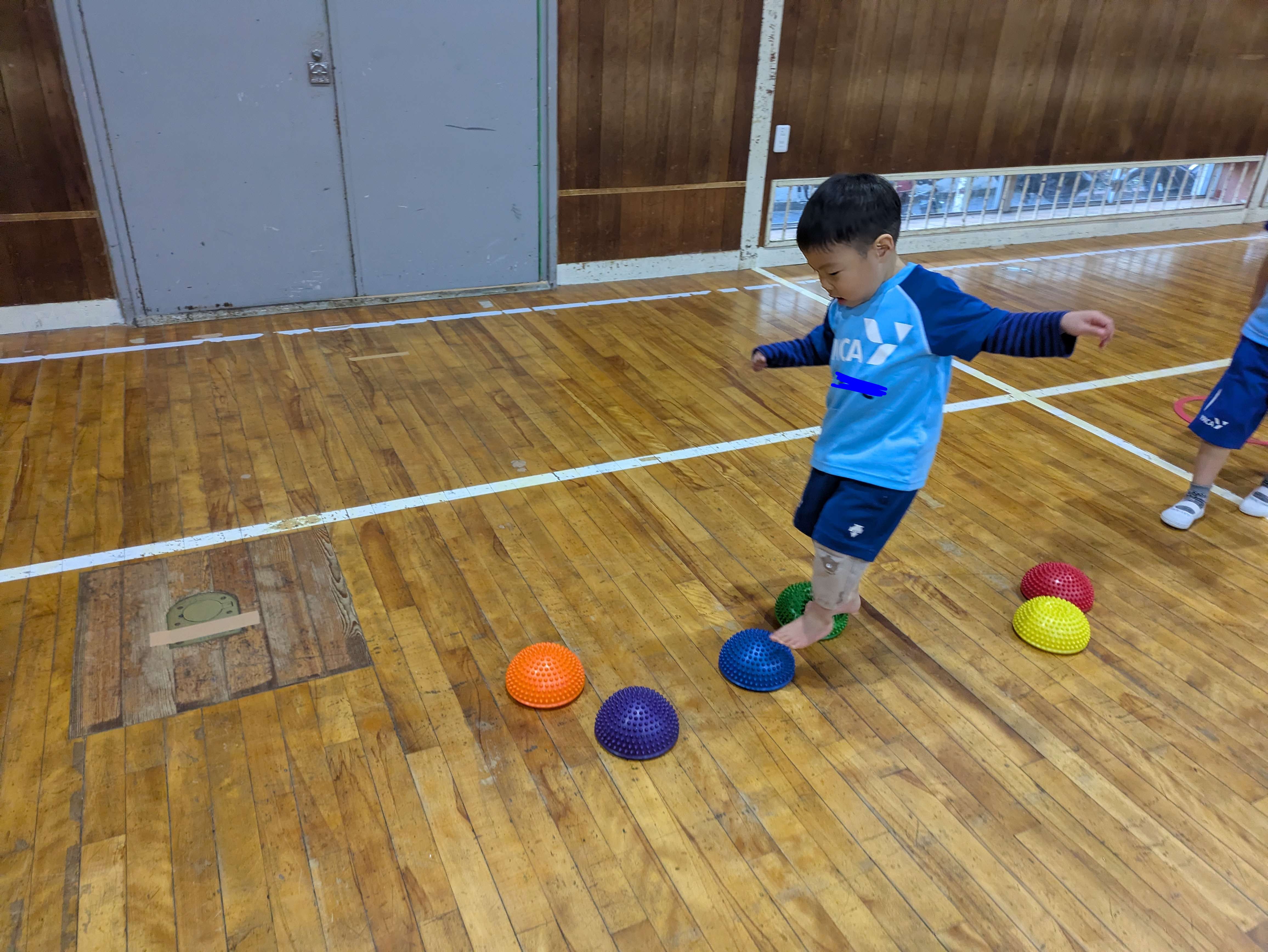 坂道になっている平均台を渡ったり、くまをしたり、今回は途中でサイコロがあり、ニコニコが出るとトリンポリン、泣いている顔だとグーパージャンプというところもあり、楽しみながら取り組めました!