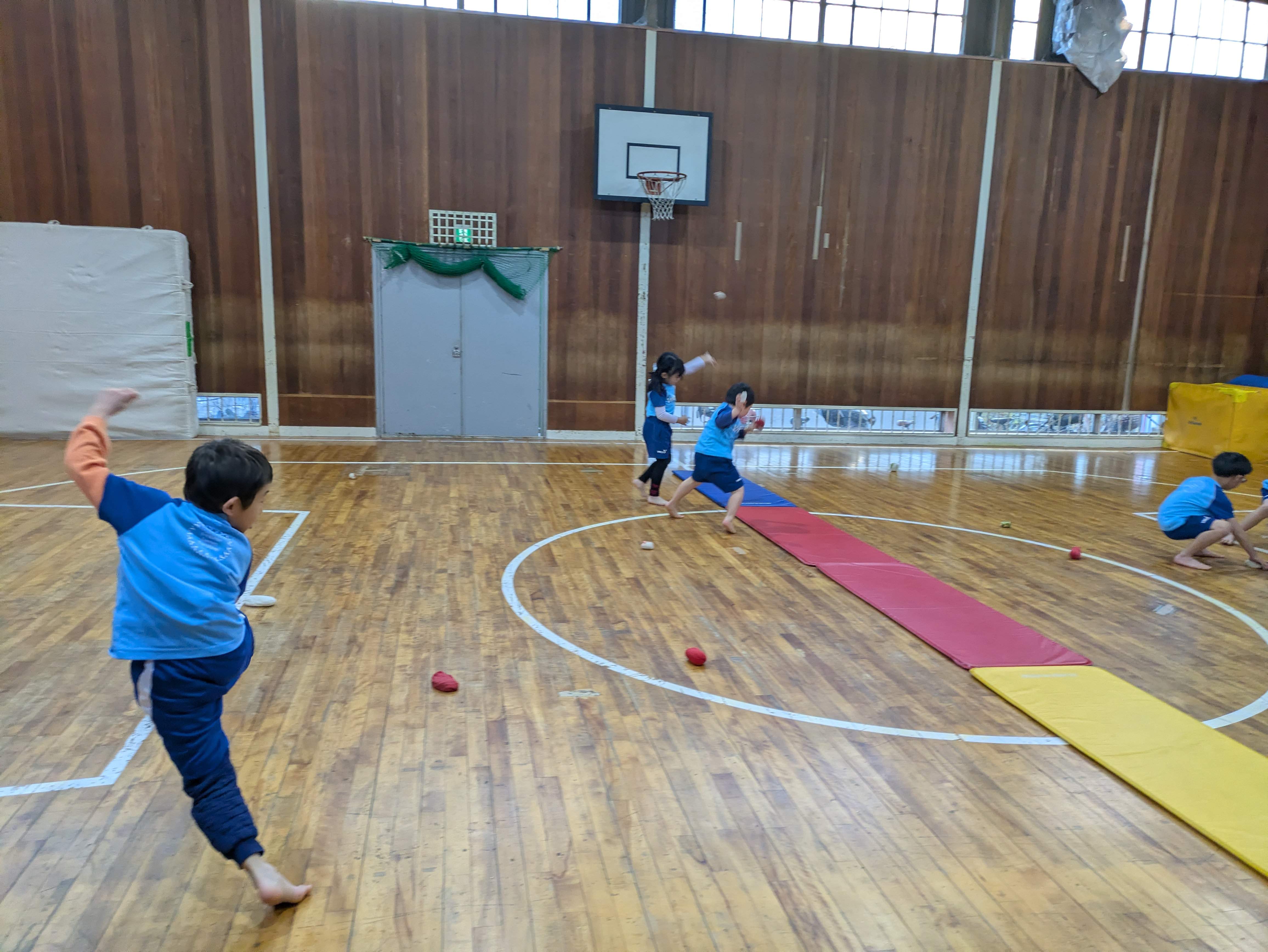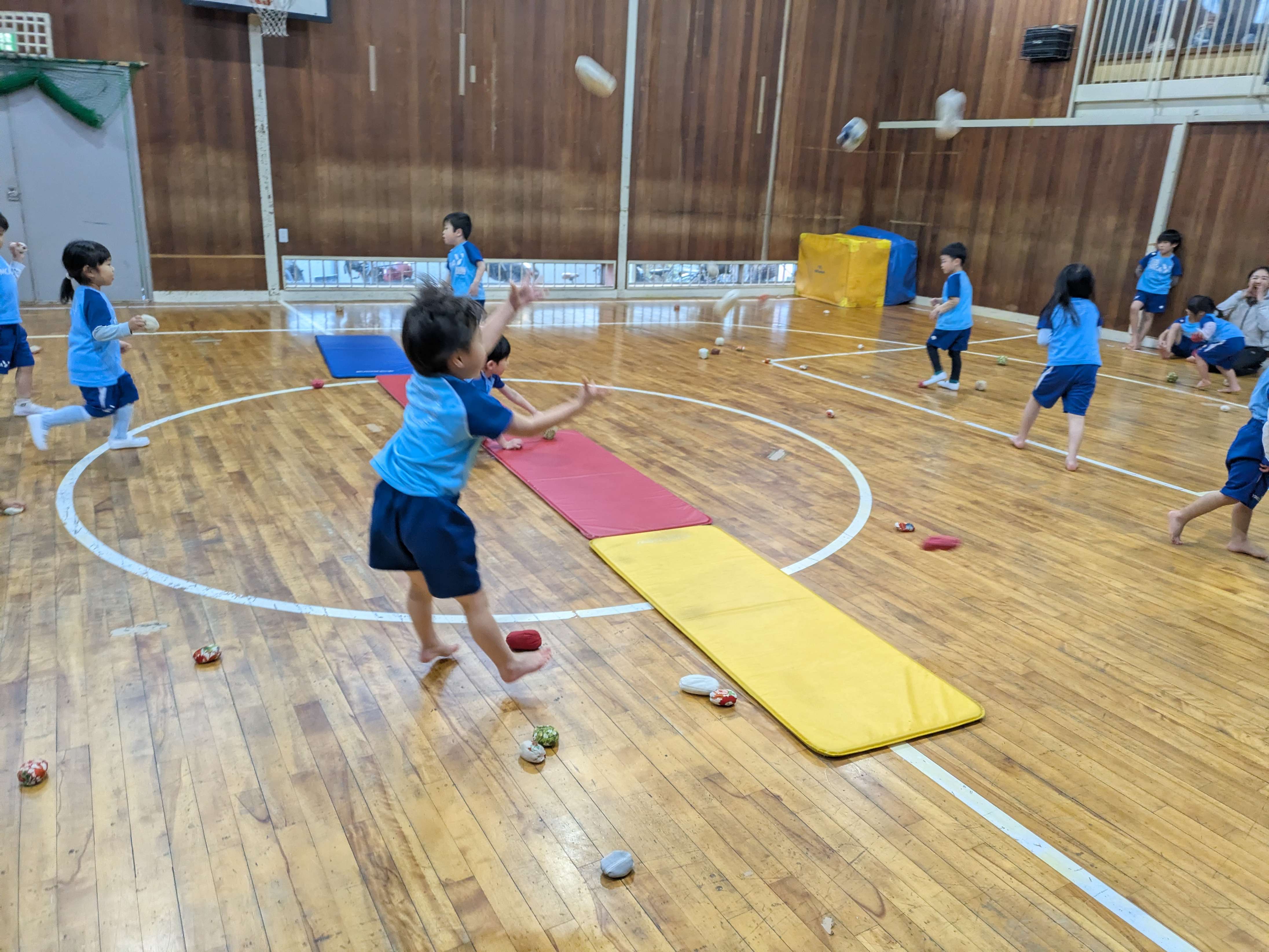 自分のチームの部屋がきれいになるように、一生懸命お手玉を投げていましたね!いっぱい集めてから投げたりと工夫をしているお友だちもいました!