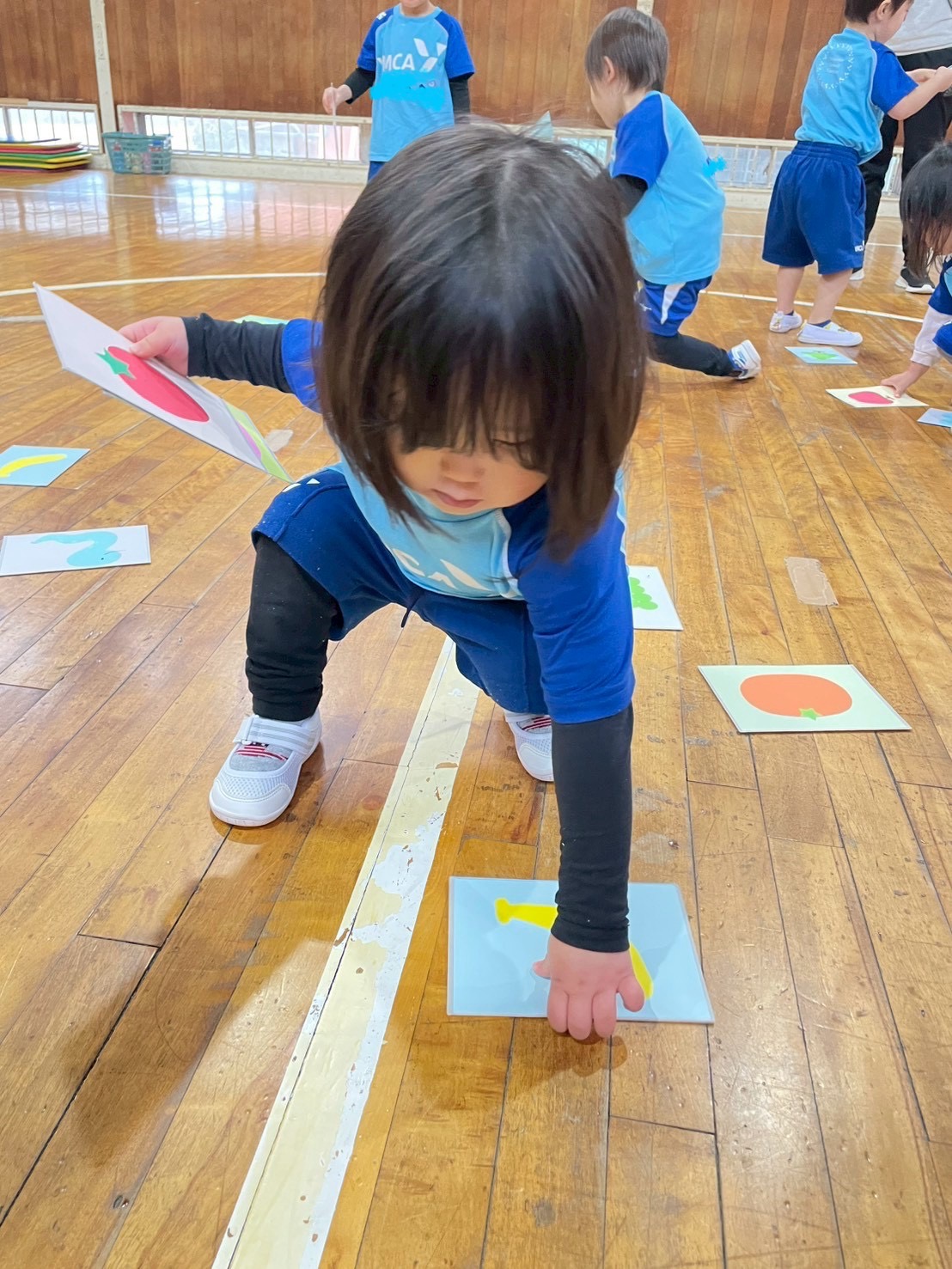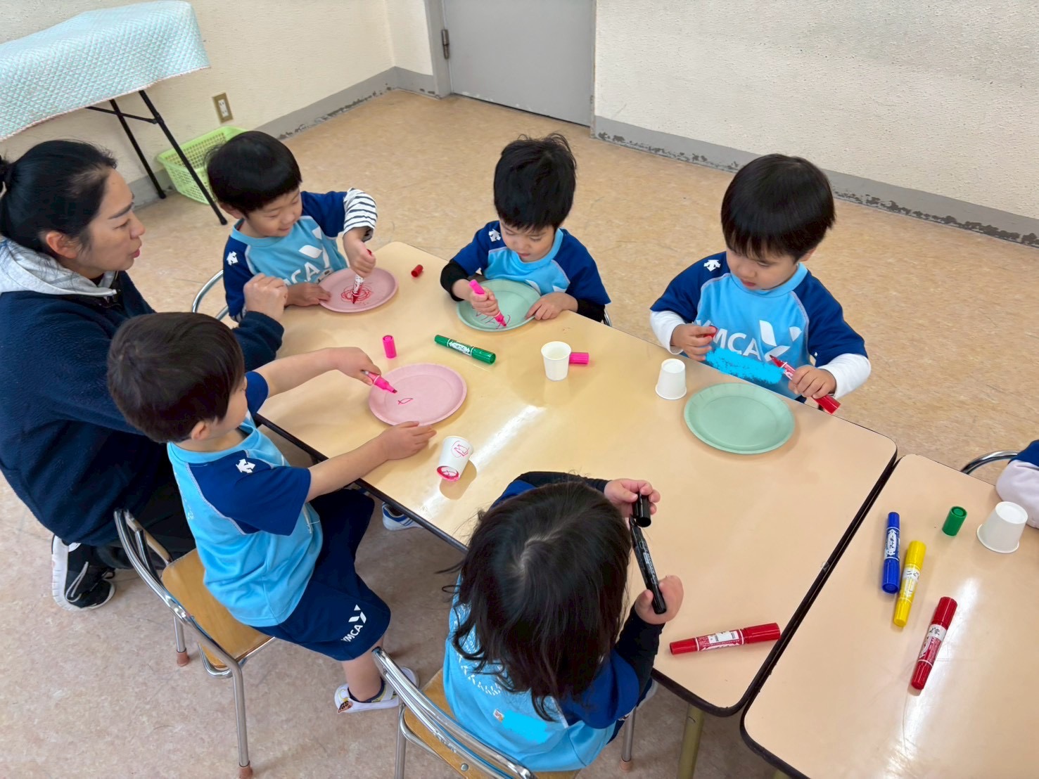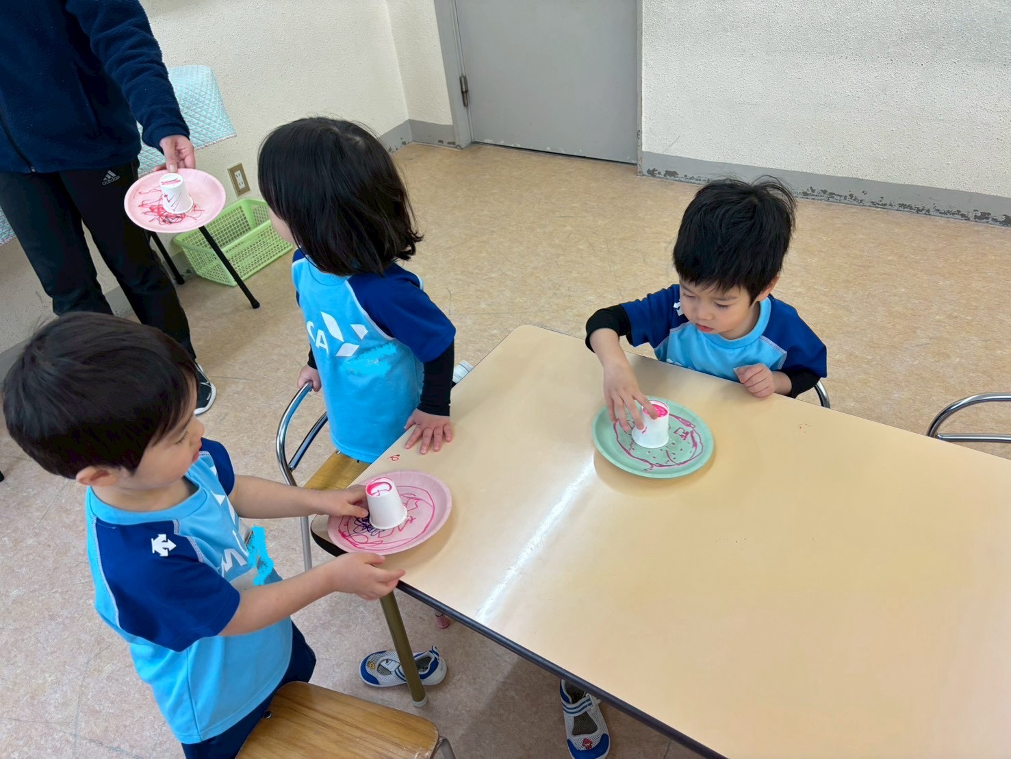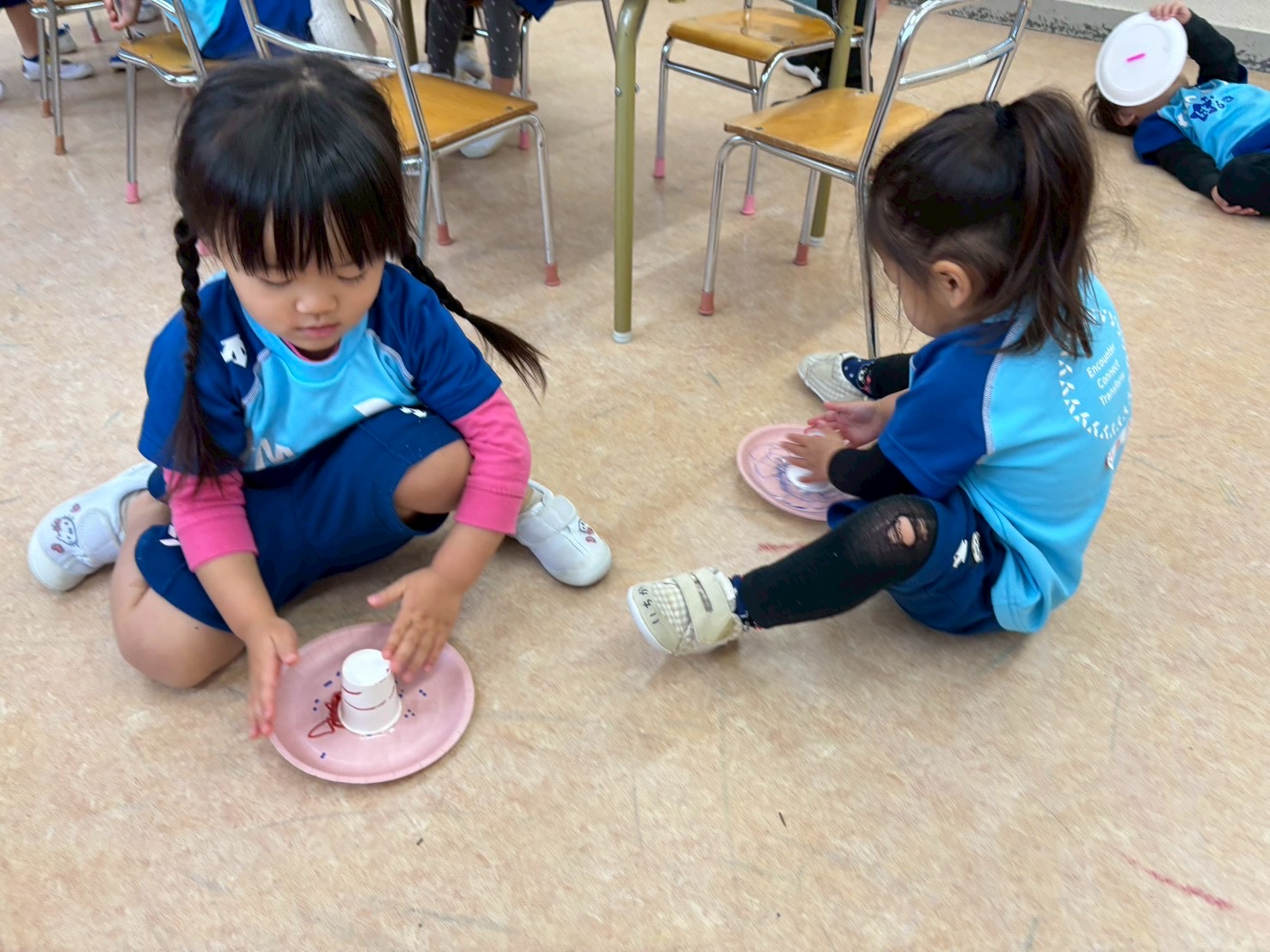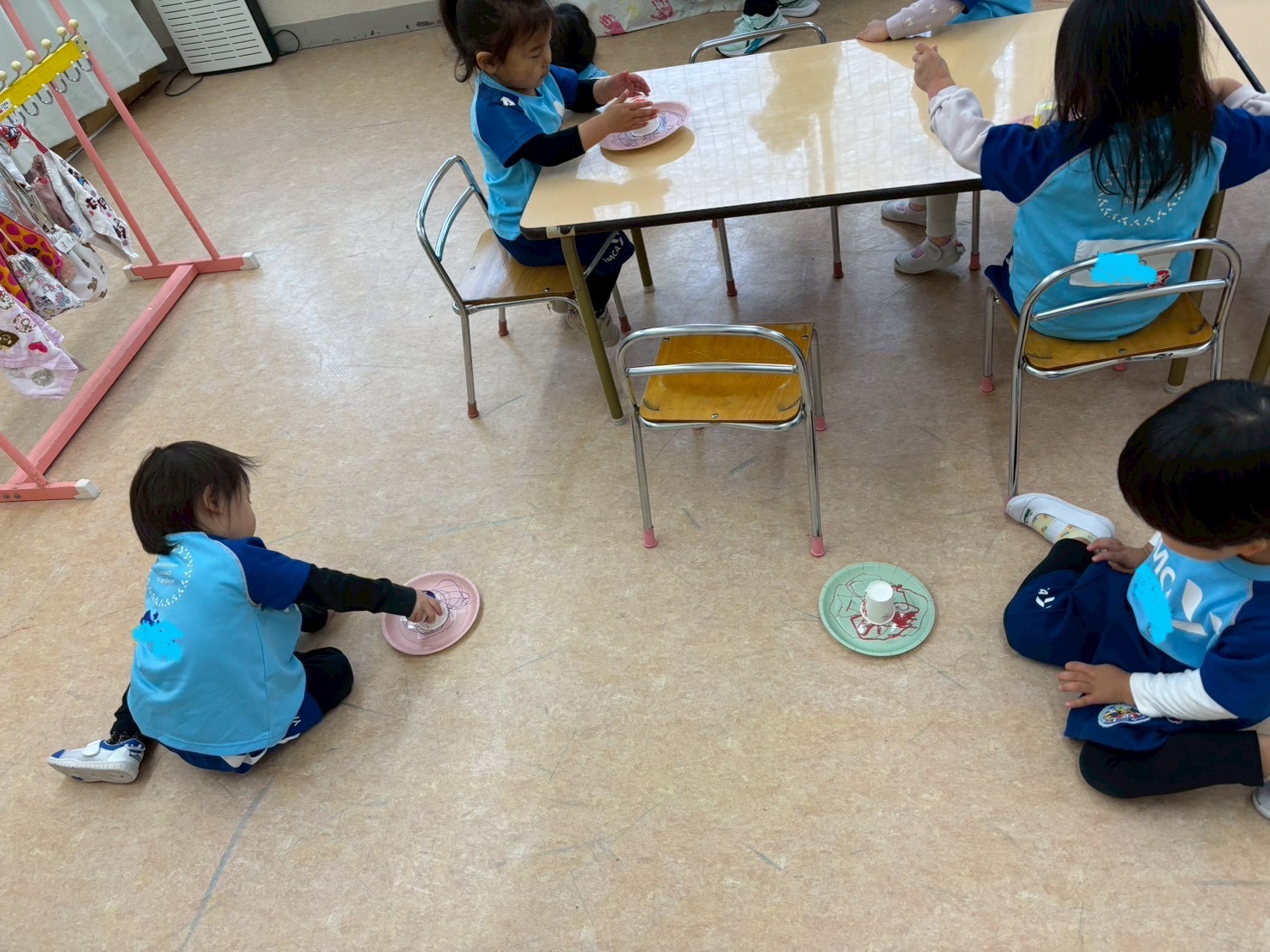 お部屋ではコマを作りました。くるくる回す手も器用にできて、それぞれ夢中になってコマを回していました。お家に持って帰る!と張り切っていたのでまた遊んでみてくださいね(^^♪