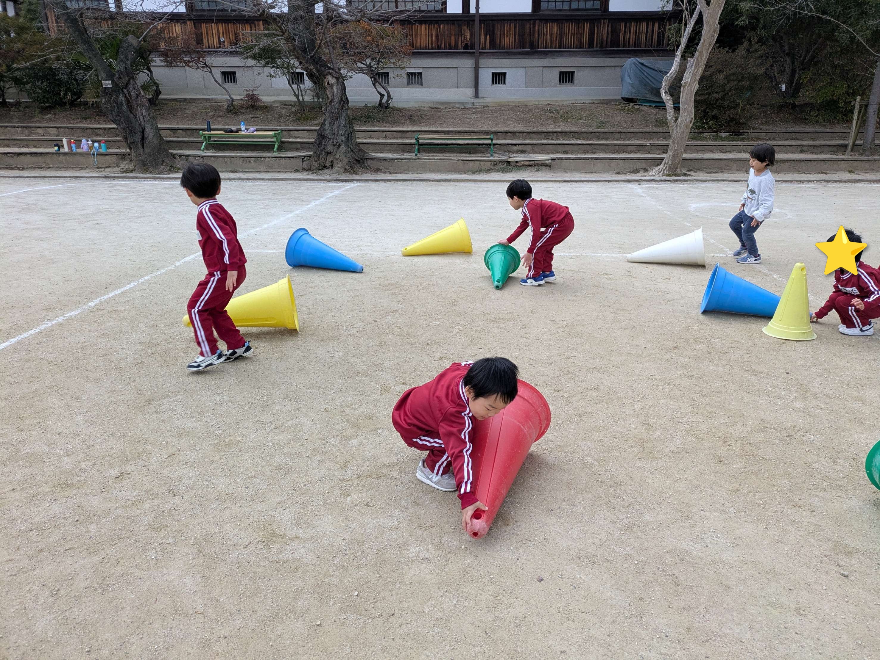 コーンを倒す仕事、コーンを立てる仕事に分かれて頑張りました!自分のチームが勝てるように、素早く仕事をこなすことができましたね!