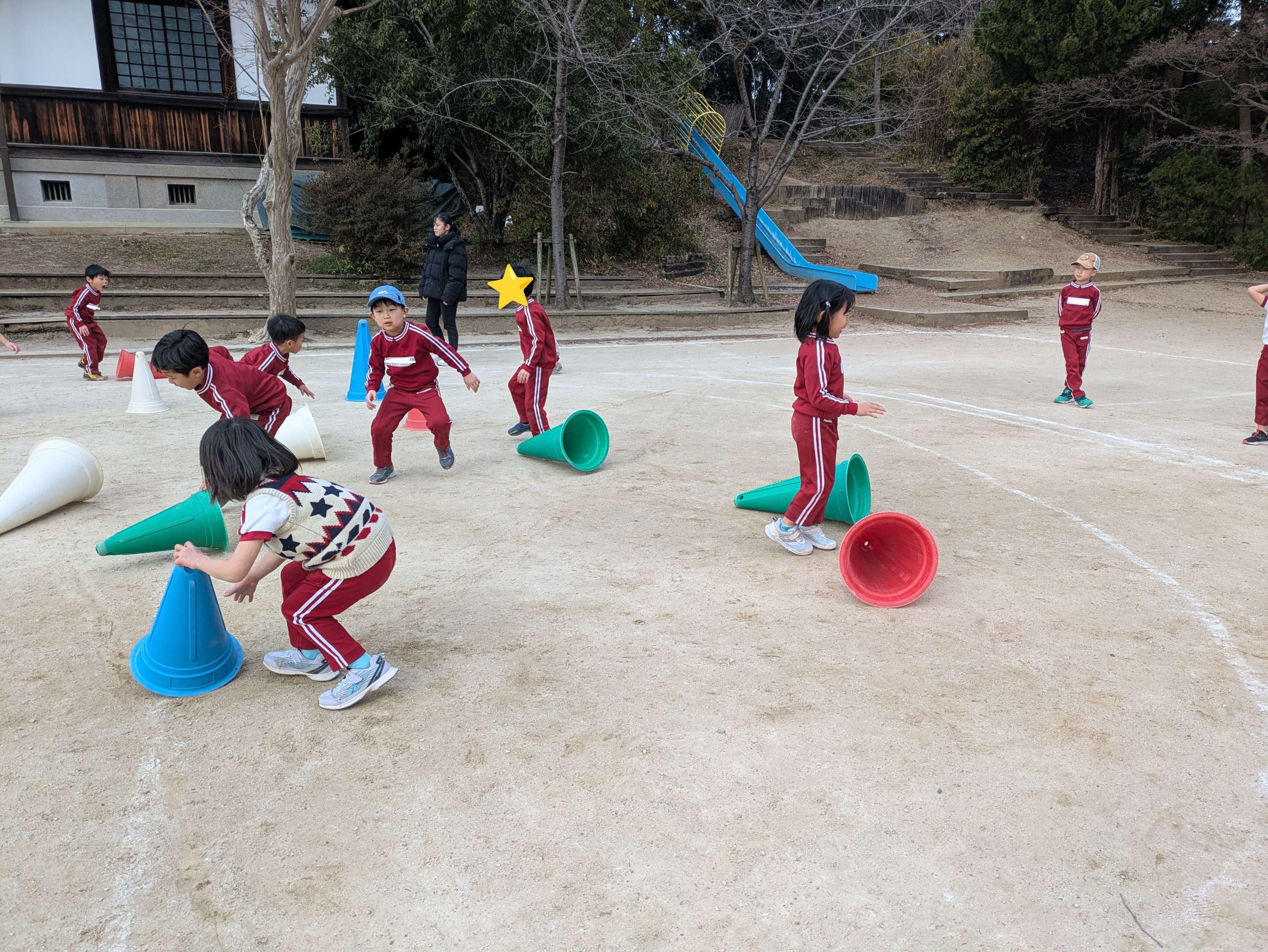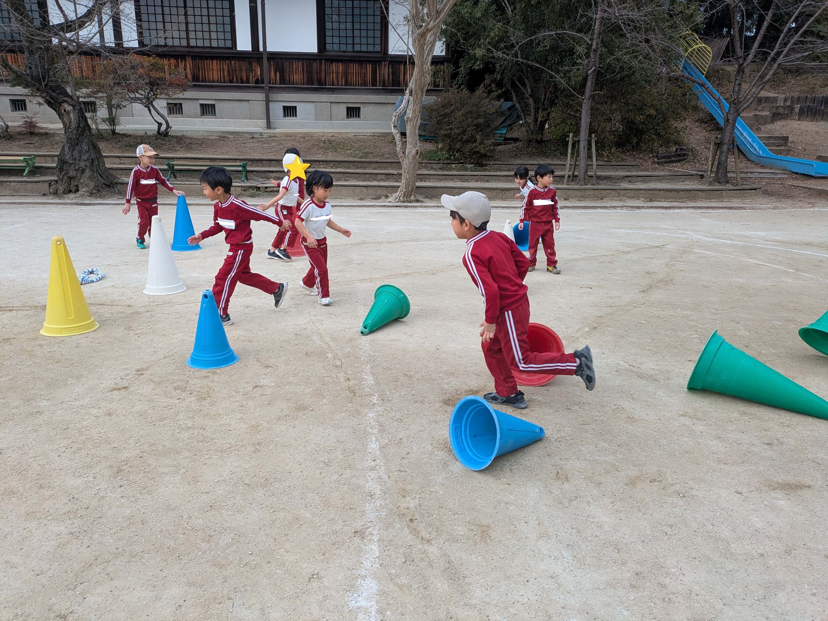 コーンを倒す仕事のチームとコーンを立てる仕事のチームに分かれて対決しました!勝つために素早くそれぞれの仕事を頑張りましたね!