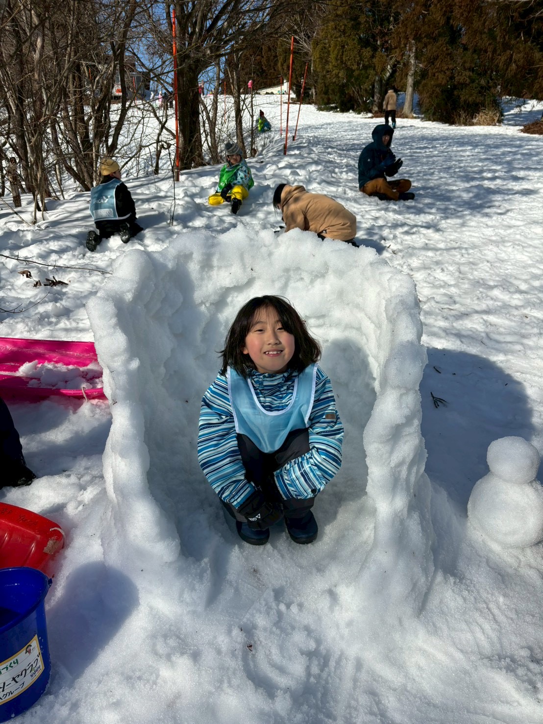 グループごとに作成会議をして協力して雪玉積みリレーや綱引きなどに取り組んでいました!お昼ご飯の際も「早く雪遊びしたい!」、「ご飯食べたらかまくら作りする!」と雪遊びを待ちきれないという声が聞こえました👂🏻