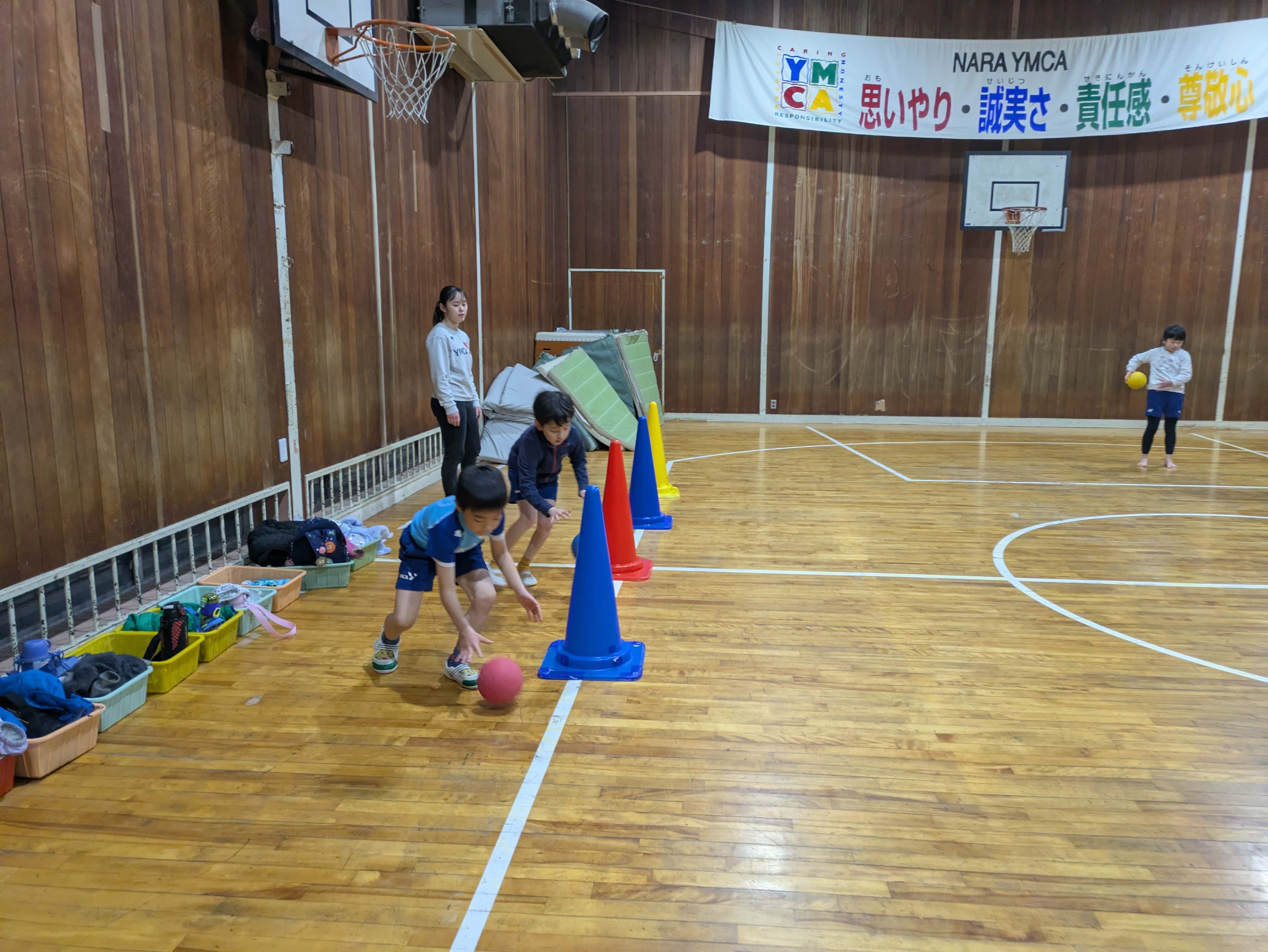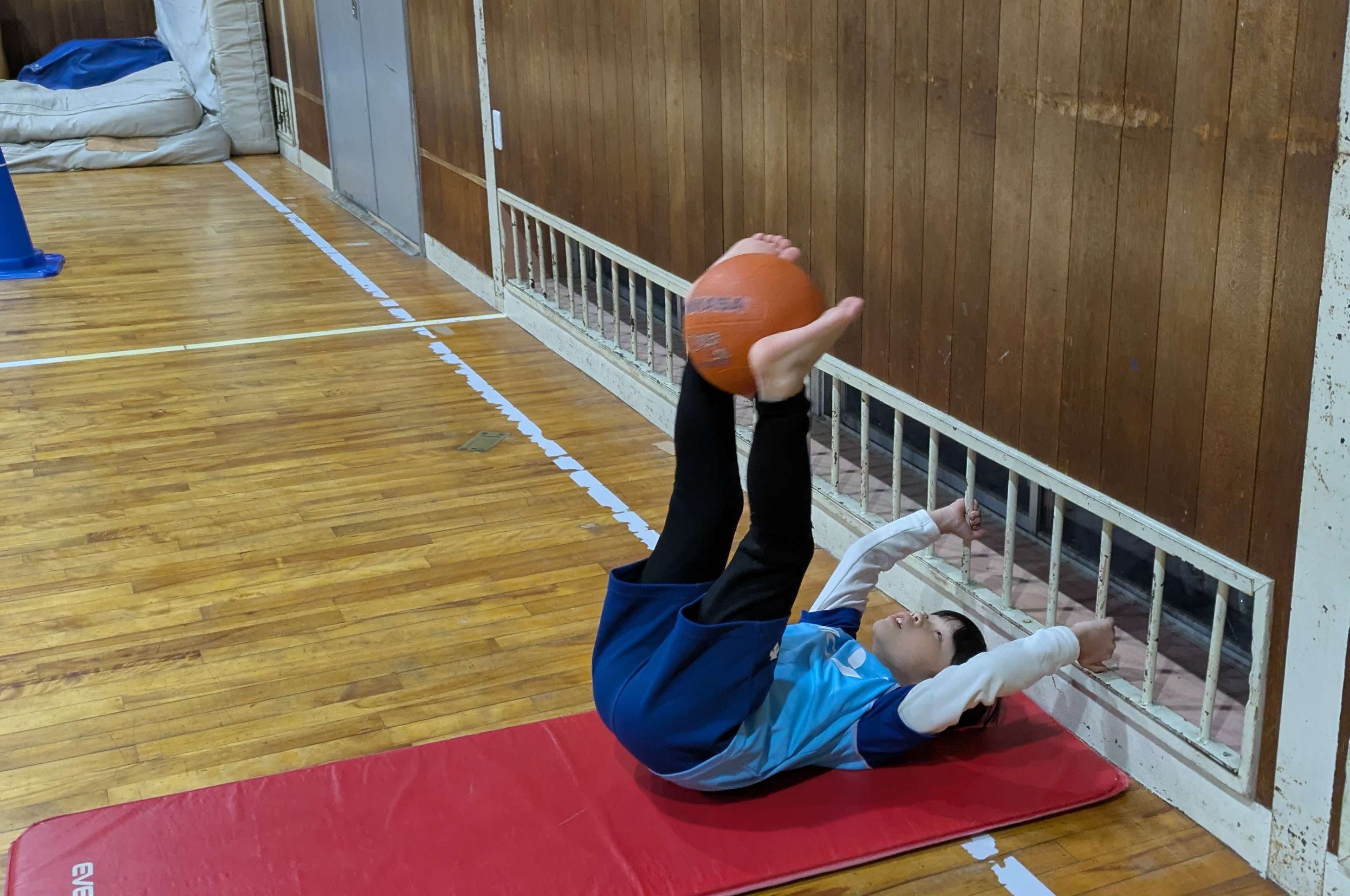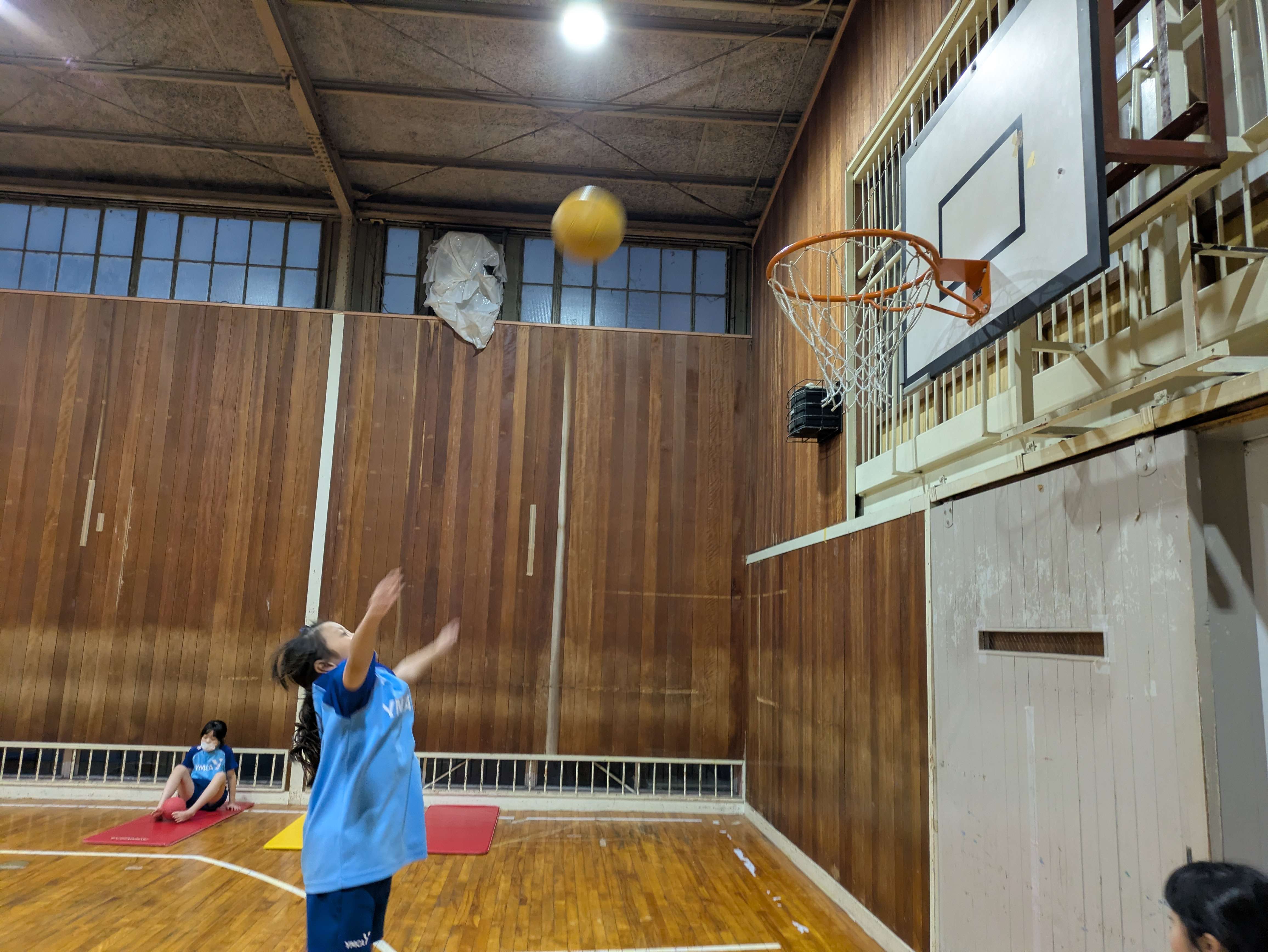 バスケットゴールにシュートをしたり、足にボールを挟んで足上げ腹筋をしたりしました!