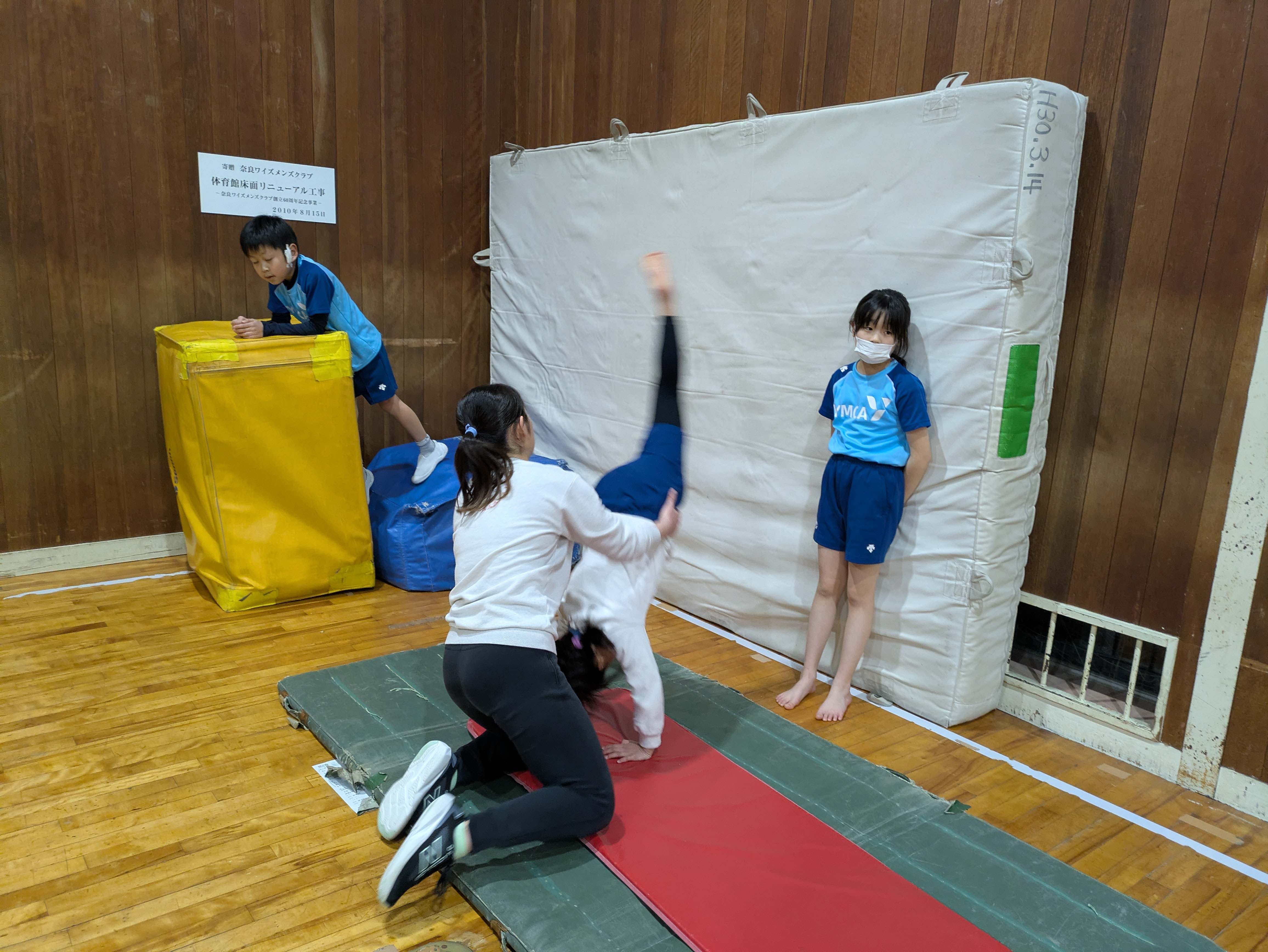 マットの側転は、倒立のようにしっかり足を振り上げるようにしましょう!
