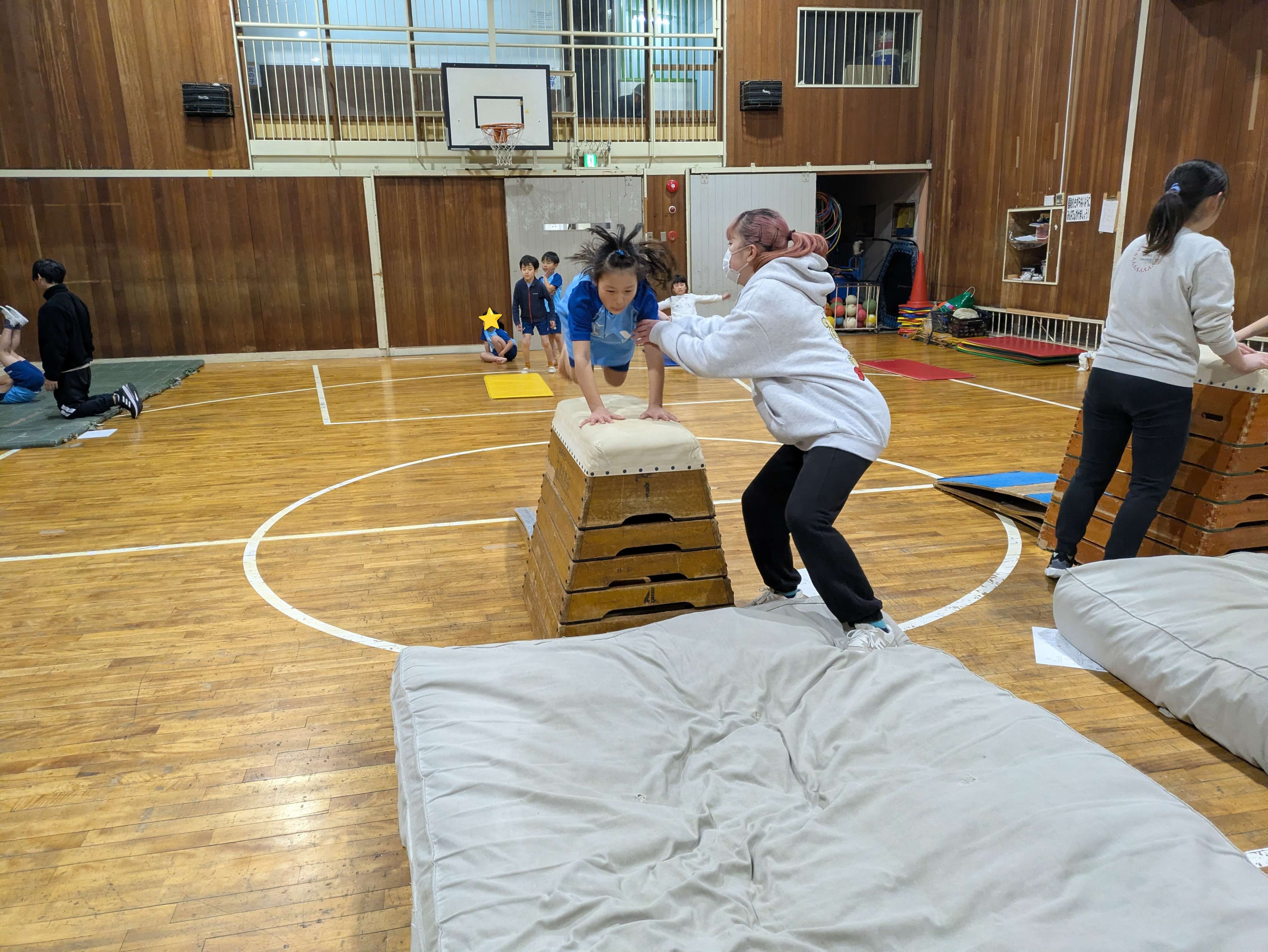 跳び箱では、ロイター板をしっかり使って、おしりを上げて跳べるように頑張りましょう!