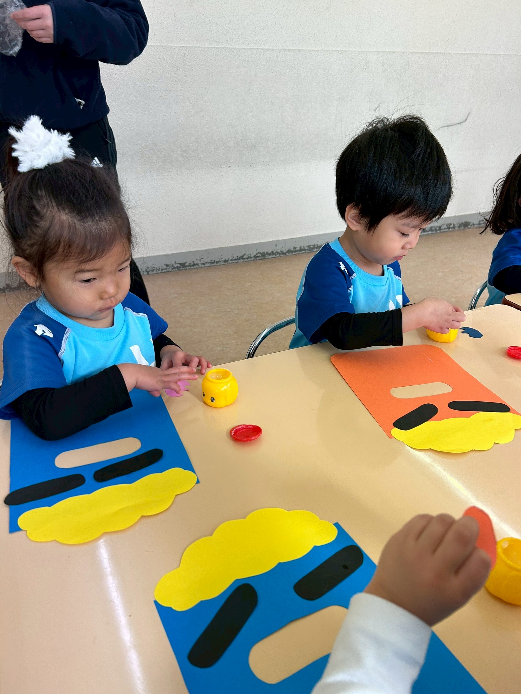 お部屋では、節分遊びに使う鬼のお面を作りました。糊の使い方も上手になりましたね~。いろいろな個性豊かなお顔が出来ました。