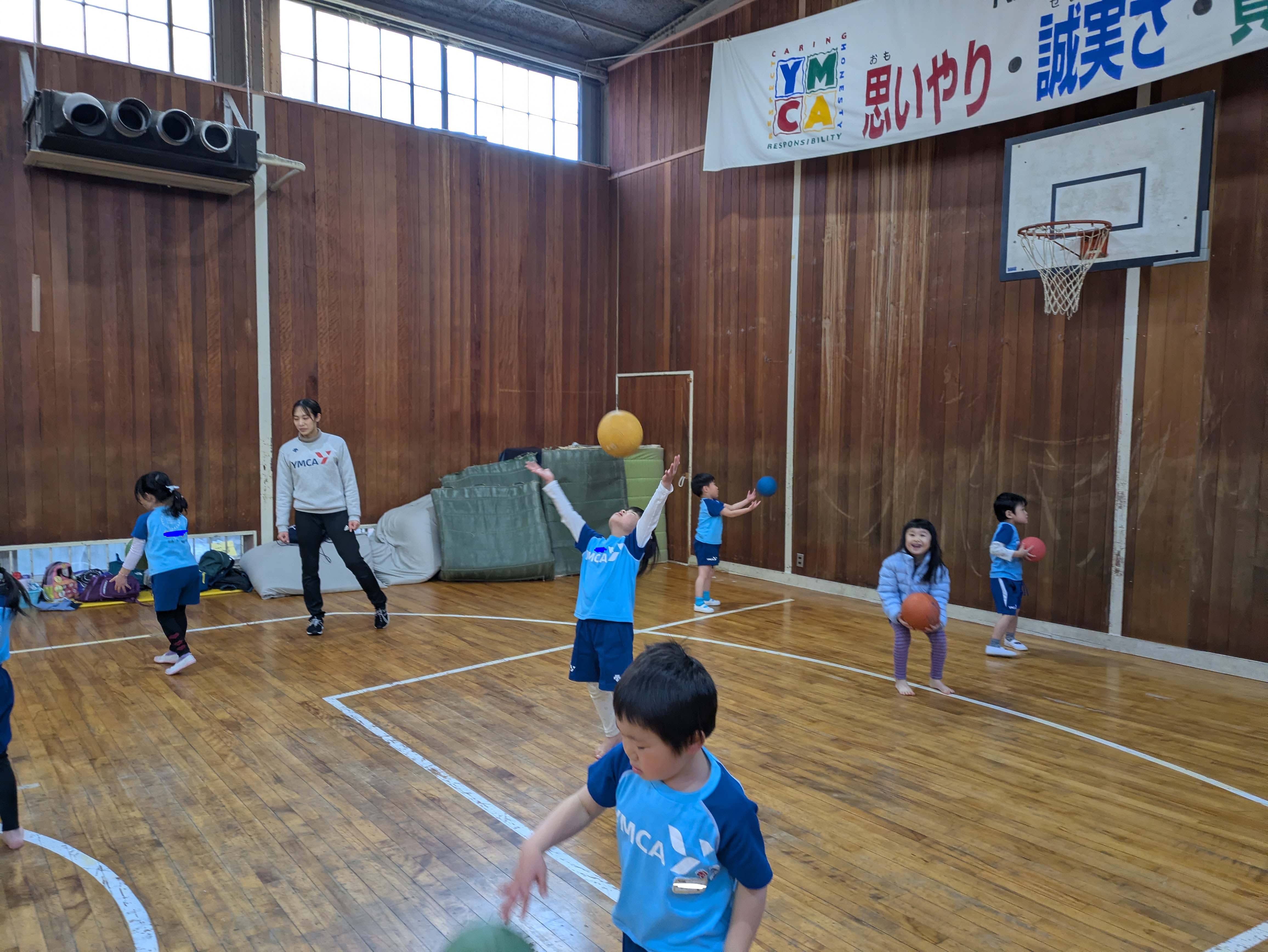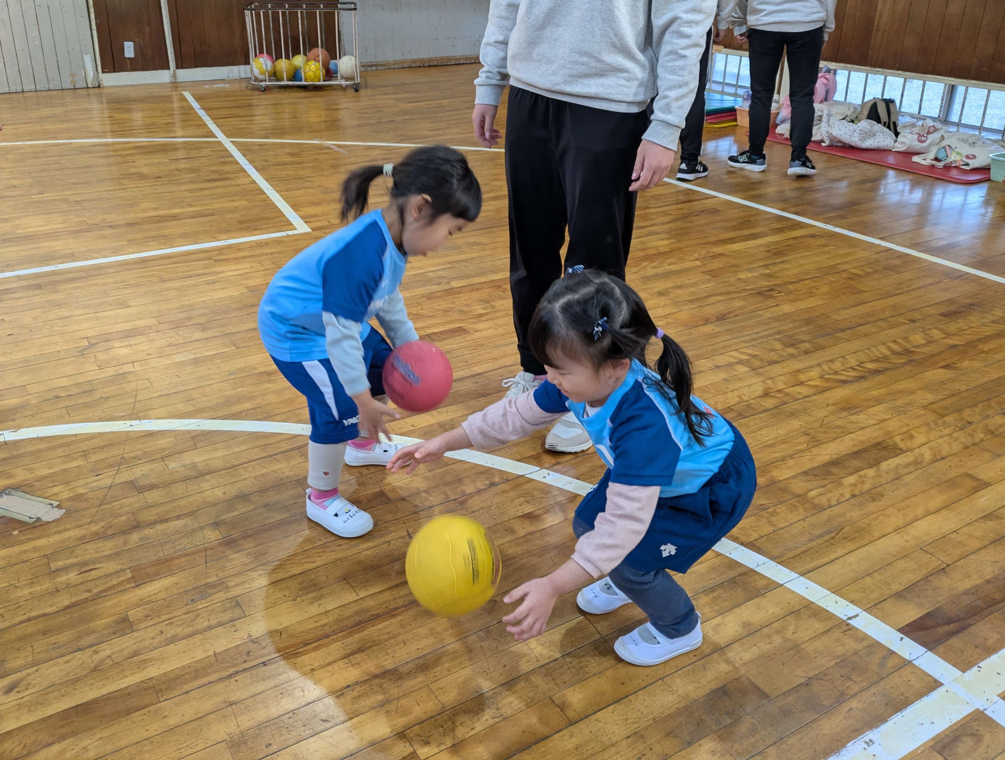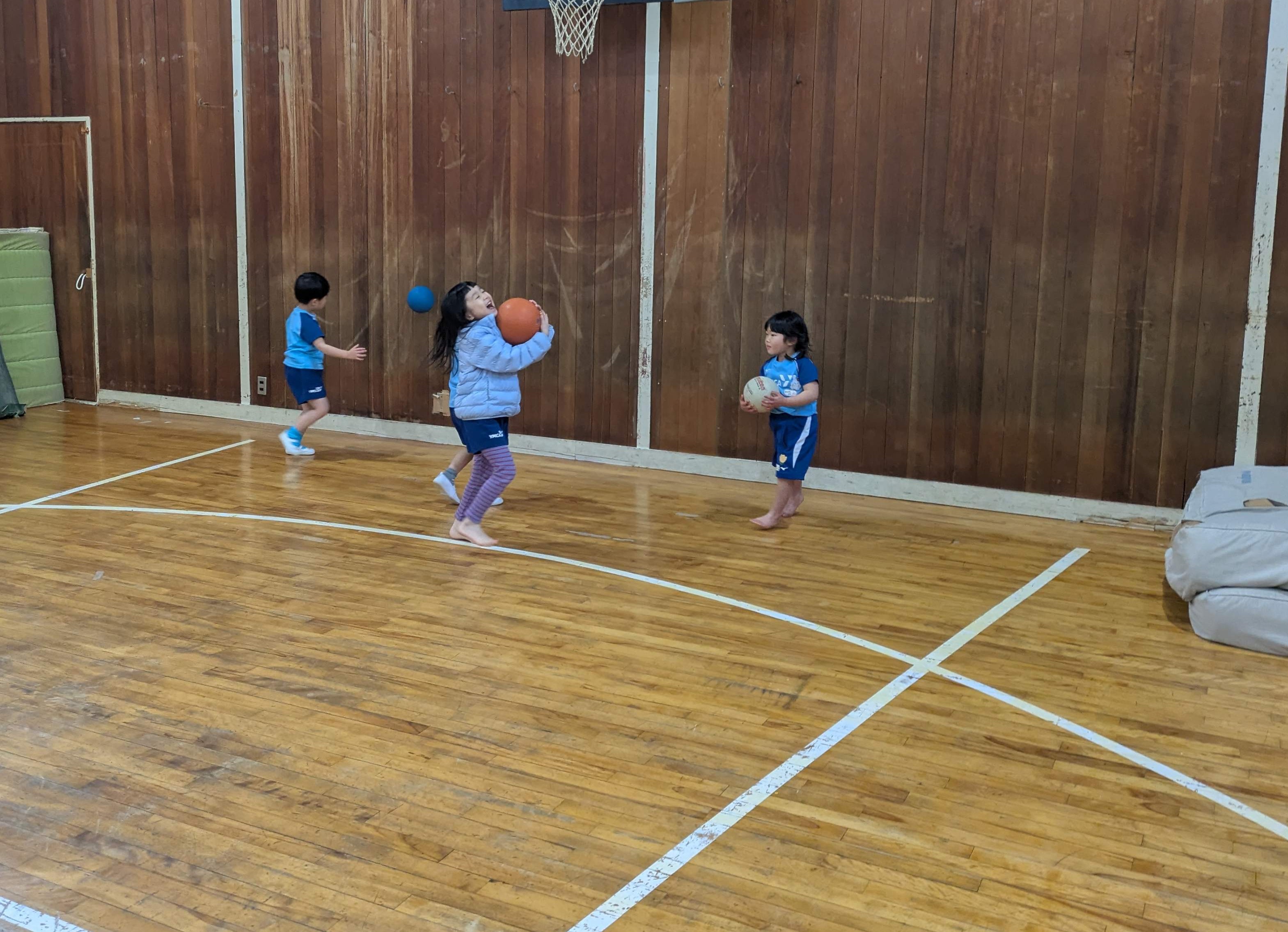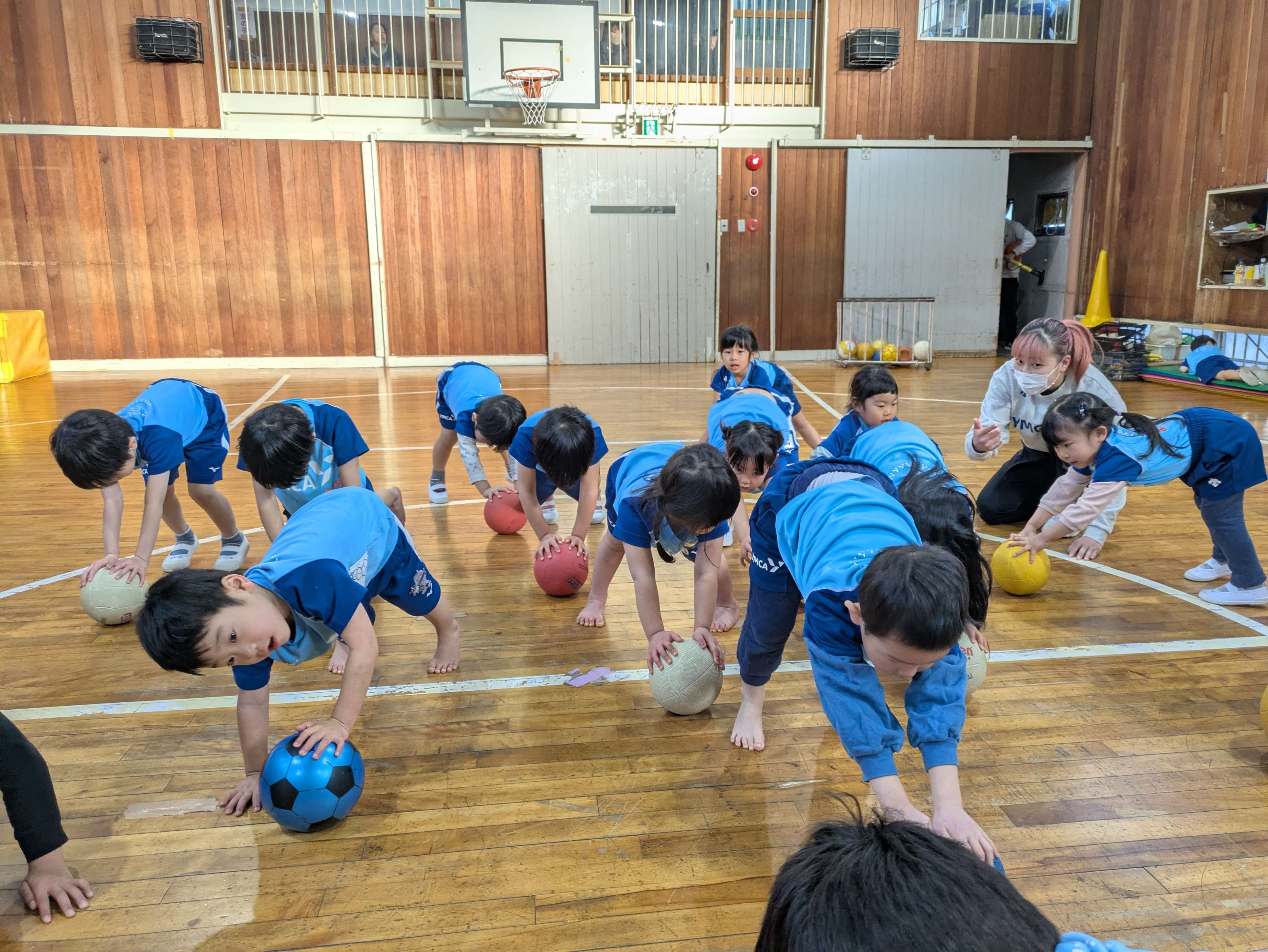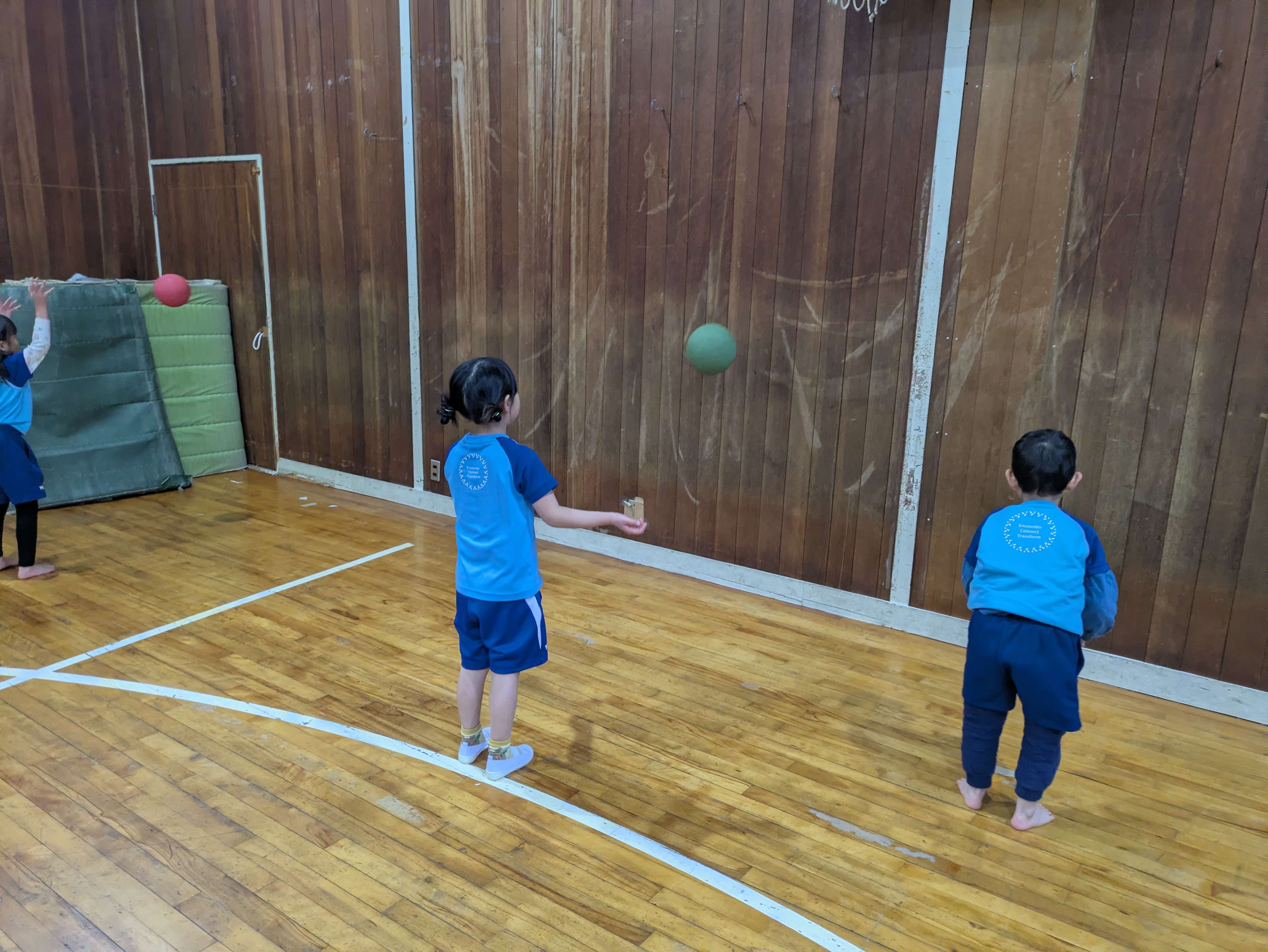 ボールに座ってバランスを取ったり、ドリブルをしたり、投げてキャッチでは、投げたあとすぐに手でお皿を作って落とさないように頑張りました!