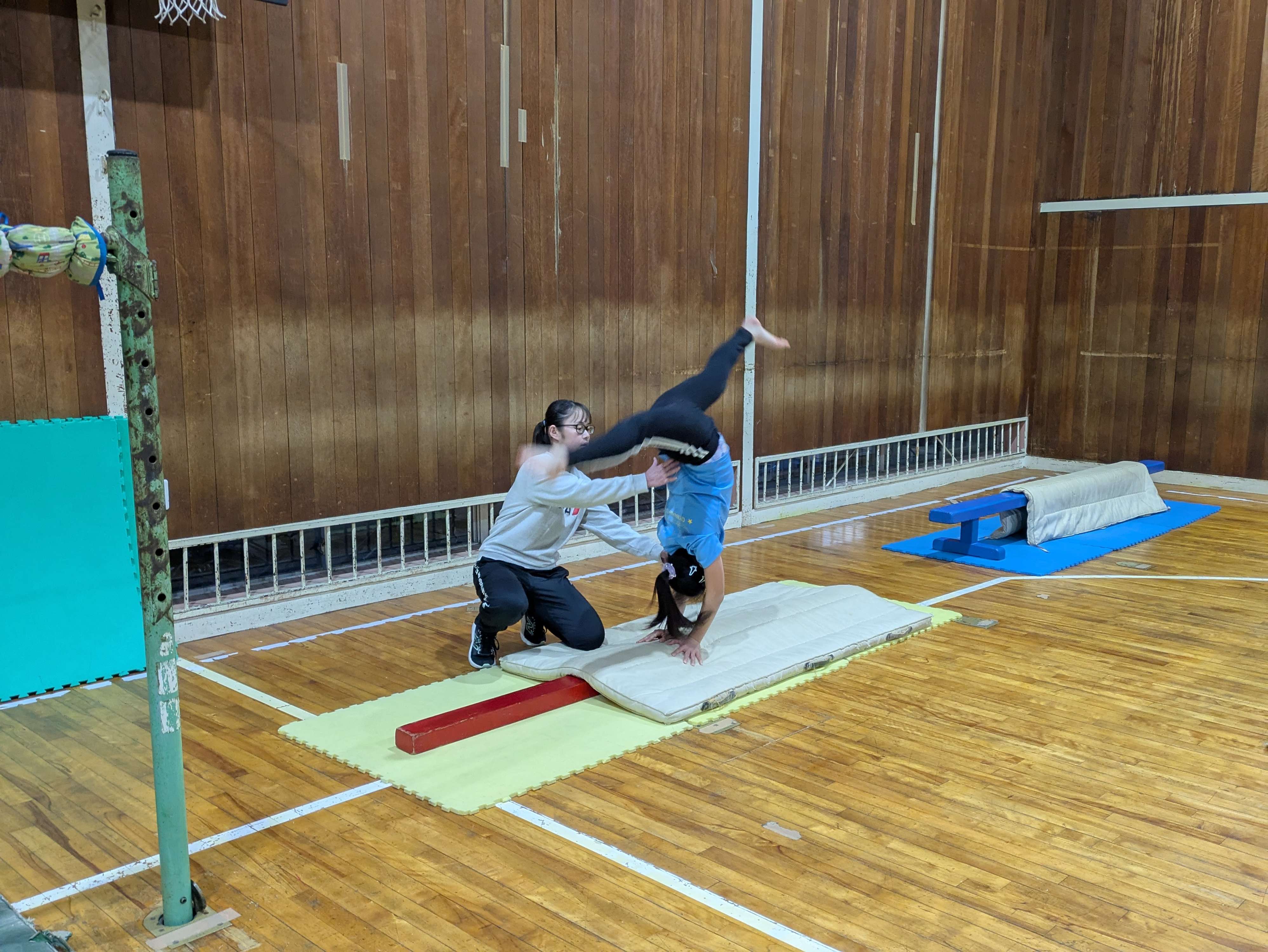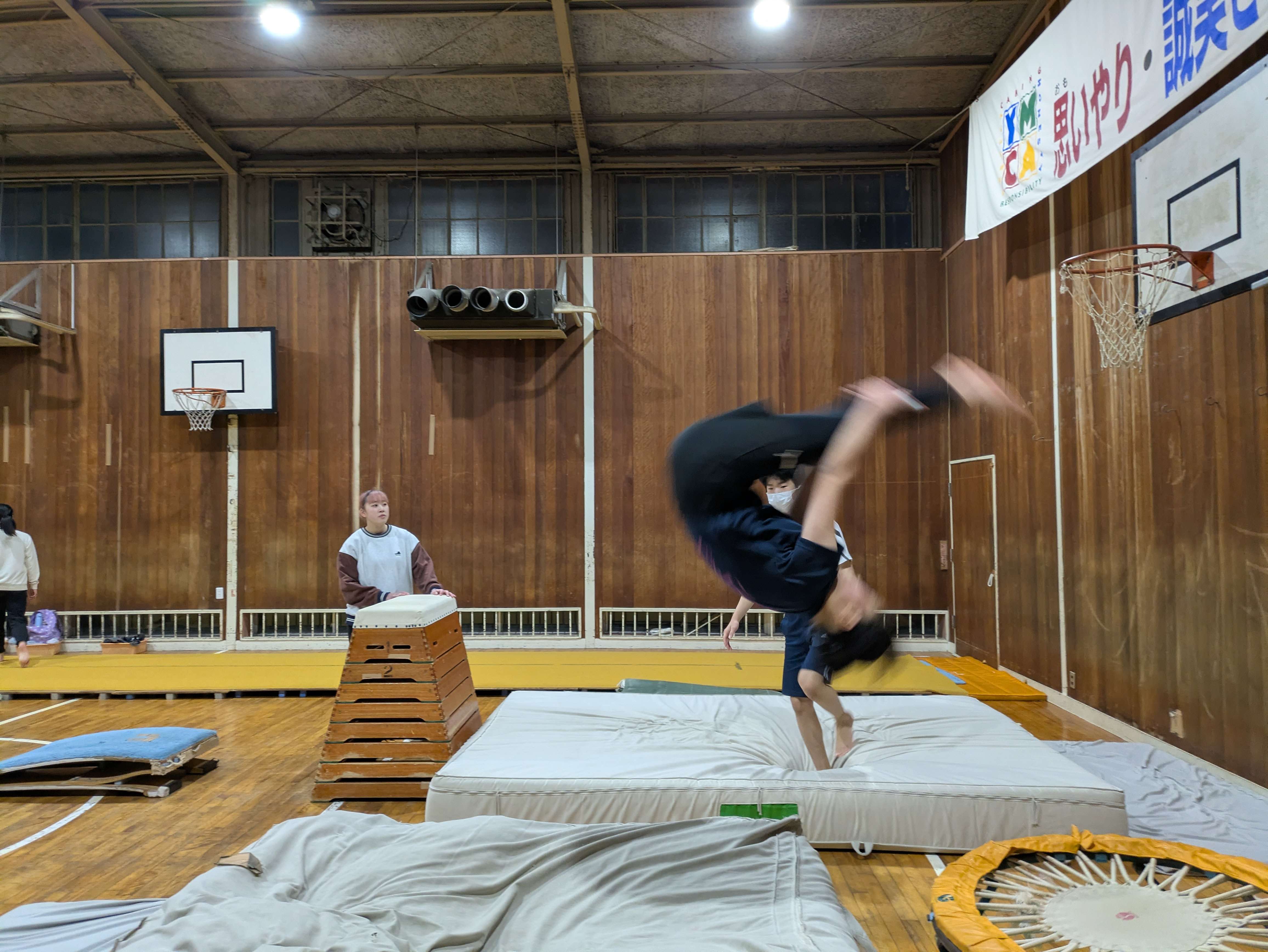 トレーニングでは、倒立歩行や跳び箱で転回倒れ込みなどをしました。