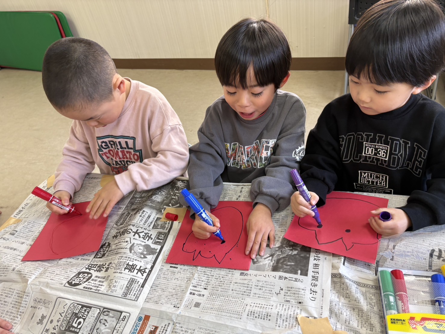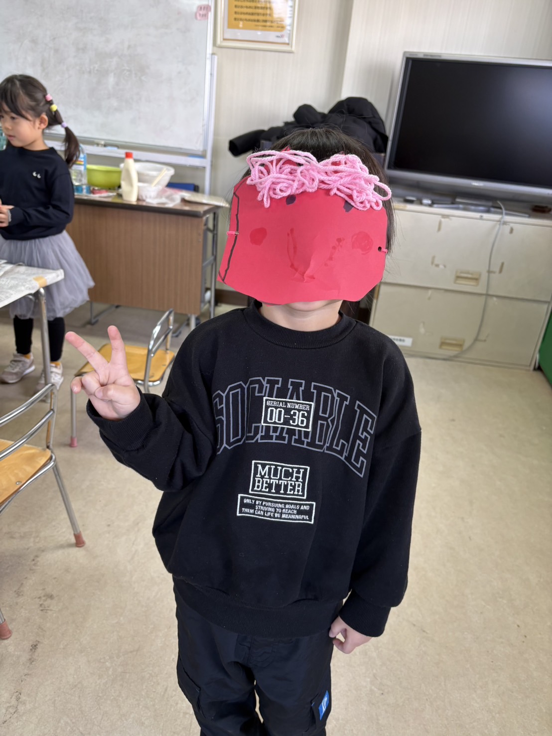 一人ひとり工夫を凝らした個性あふれるお面が完成し、友だち同士で見せ合いながら楽しむ様子が見られました😊