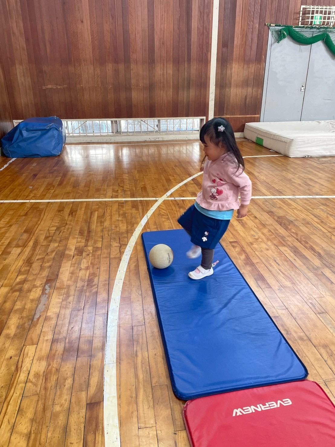 ボールサーキットをしました。上から転がしたボールを追いかけて下でキャッチ!坂の上で手を放すタイミング、スピード、考えながら転がすのでなかなか難しい!でもとっても上手にできました。
