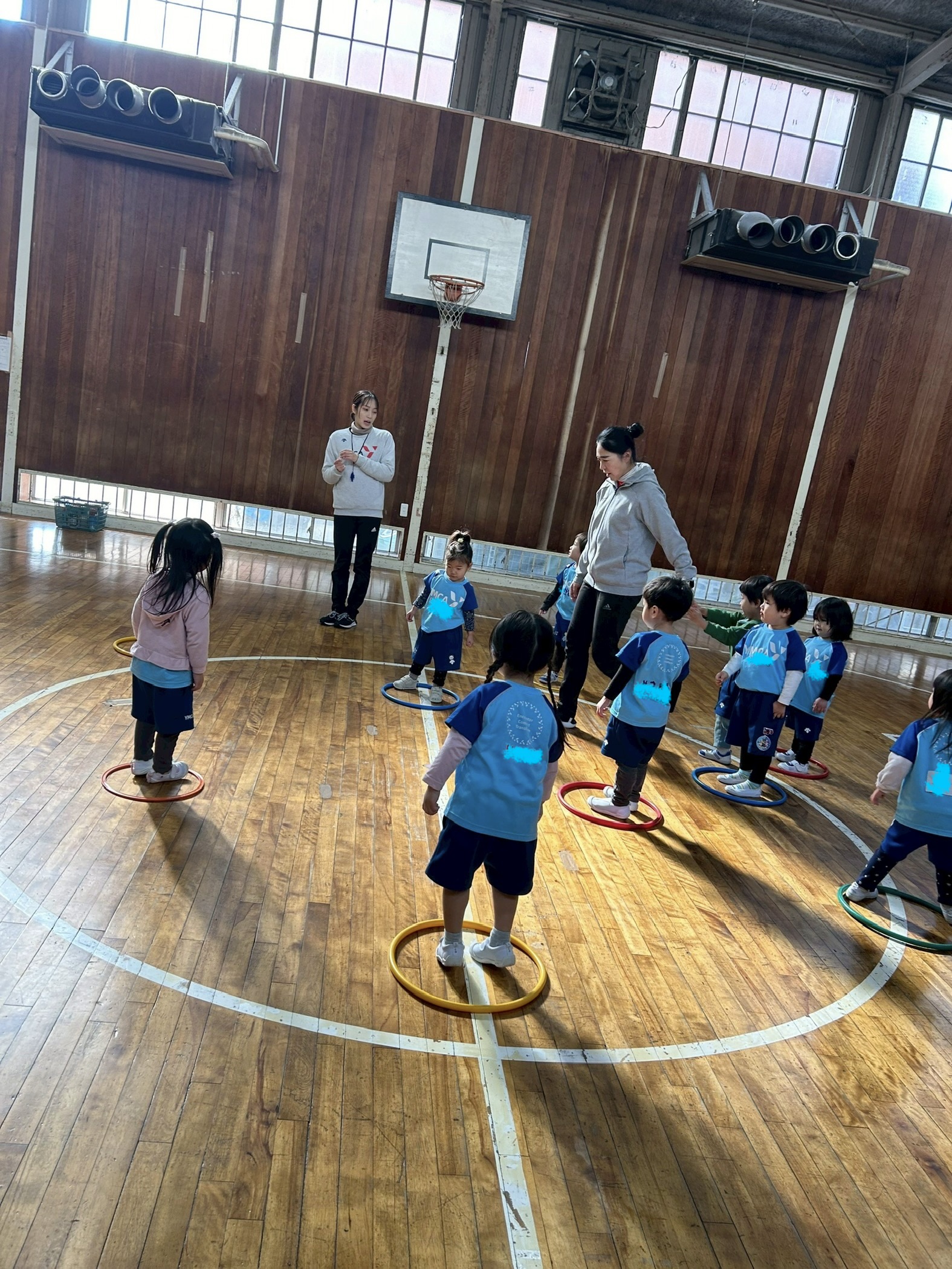 今日は、椅子取りゲームの要領で、フープ取りをしました。
