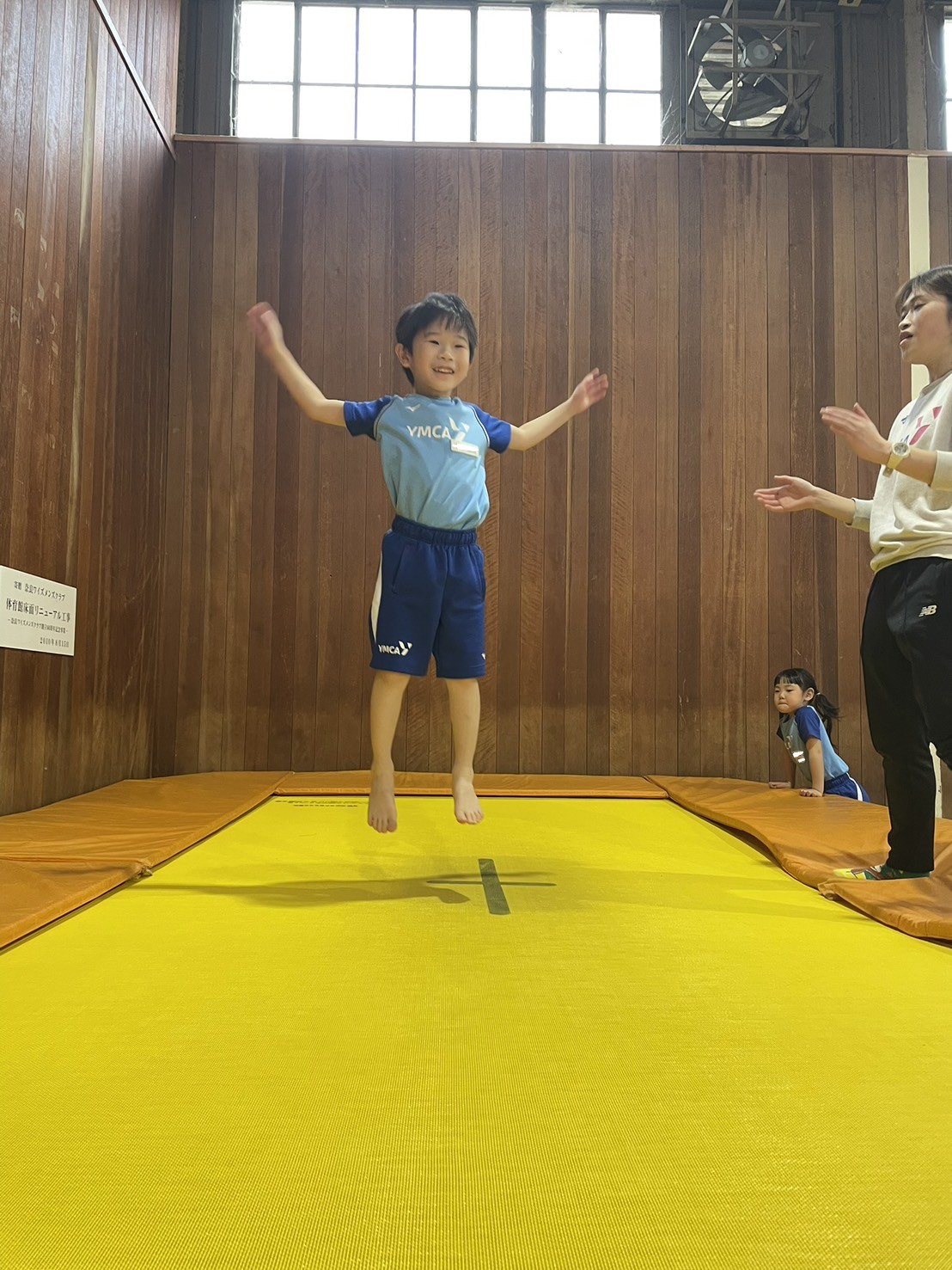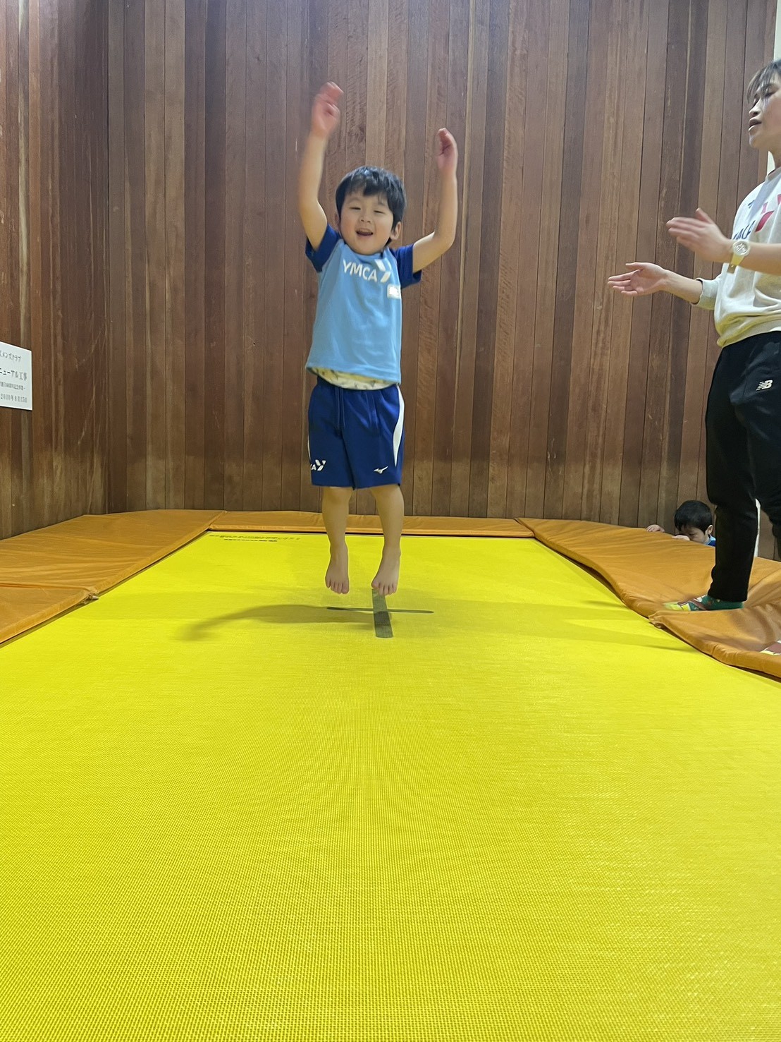 トランポリンでは、手もしっかり使って高く跳べるようにしましょう!