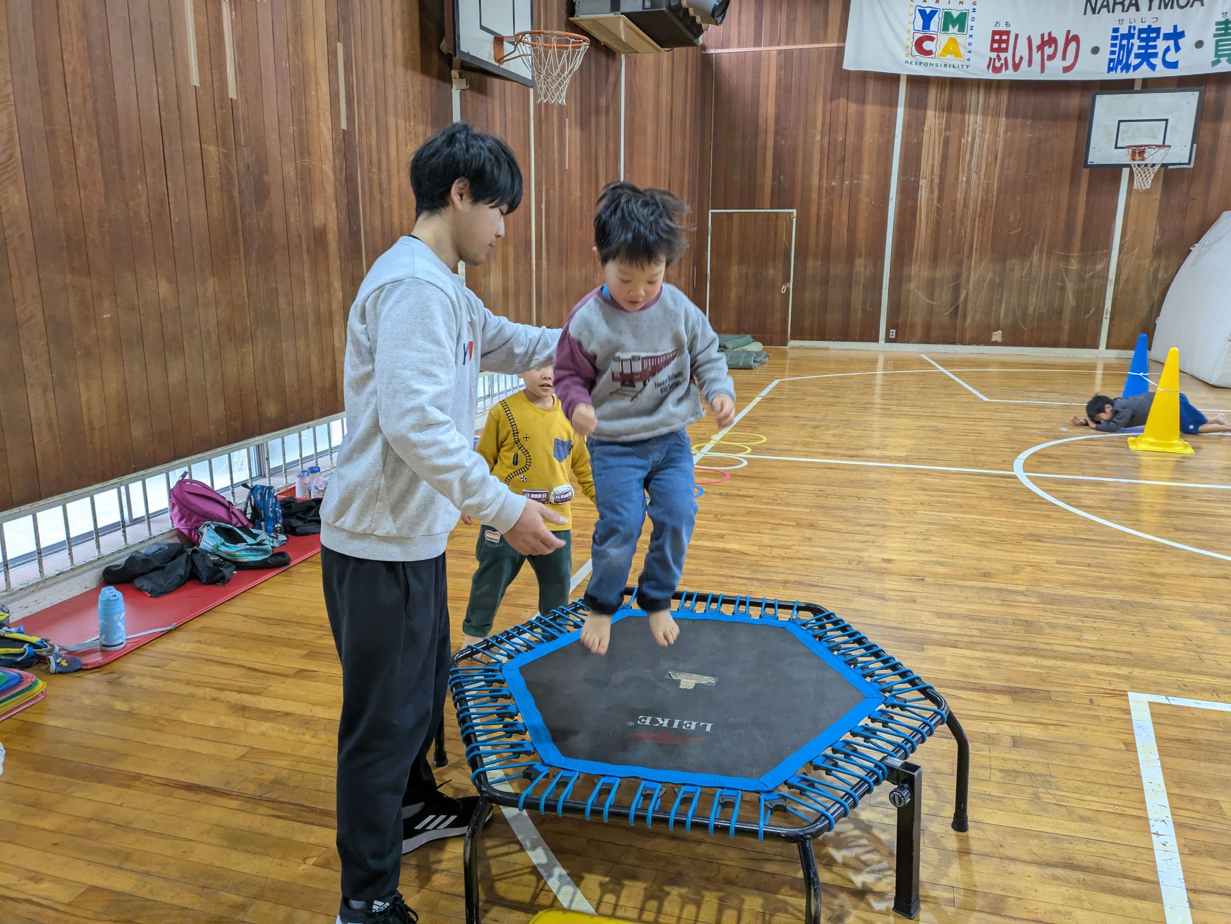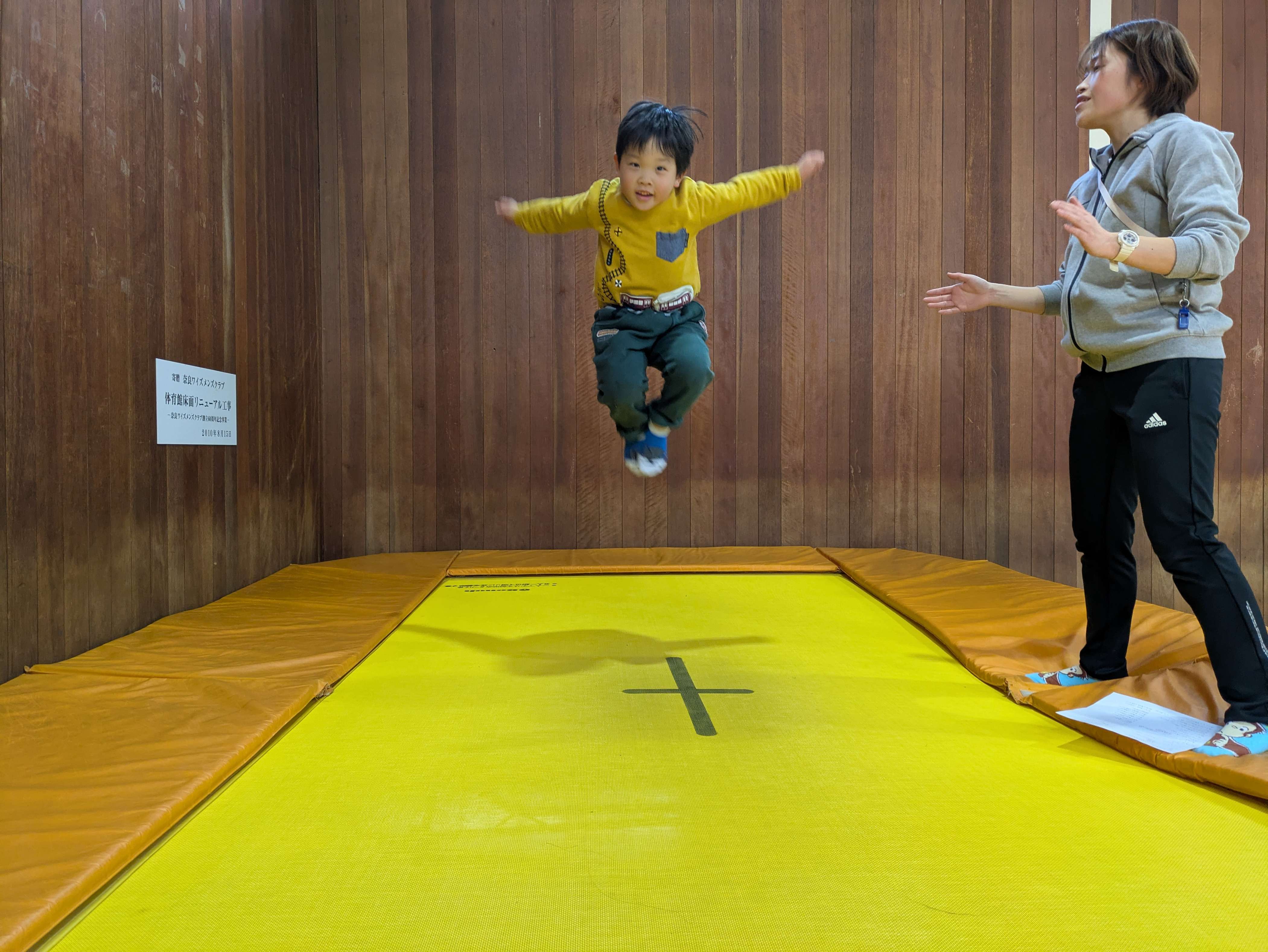 トランポリンは、楽しく取り組むことができました!体に力を入れて、同じ場所でまっすぐ跳べるようにしましょう!