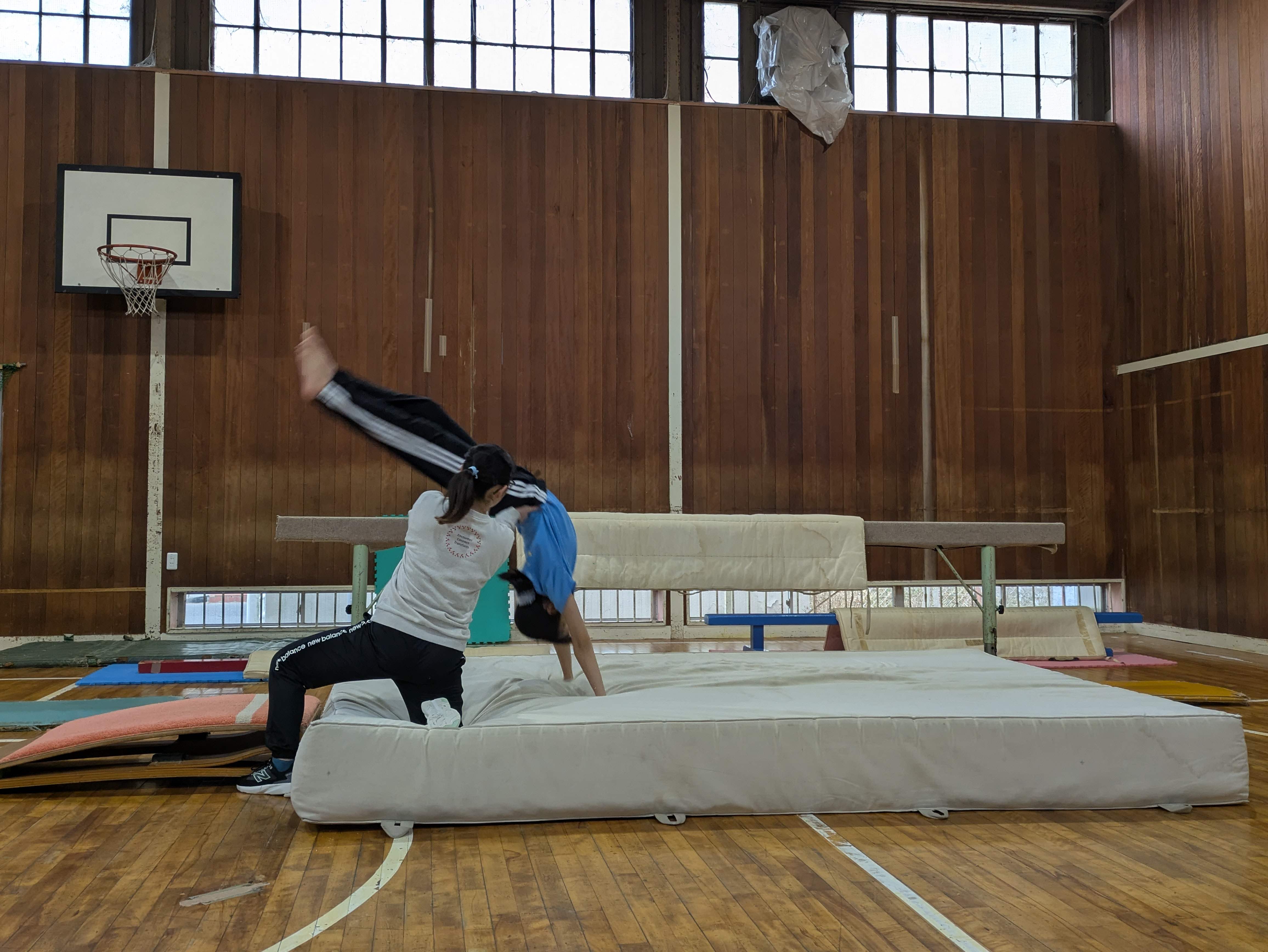 転回倒れ込みでは、手をついた時に倒立姿勢になれるよう頑張りましょう!