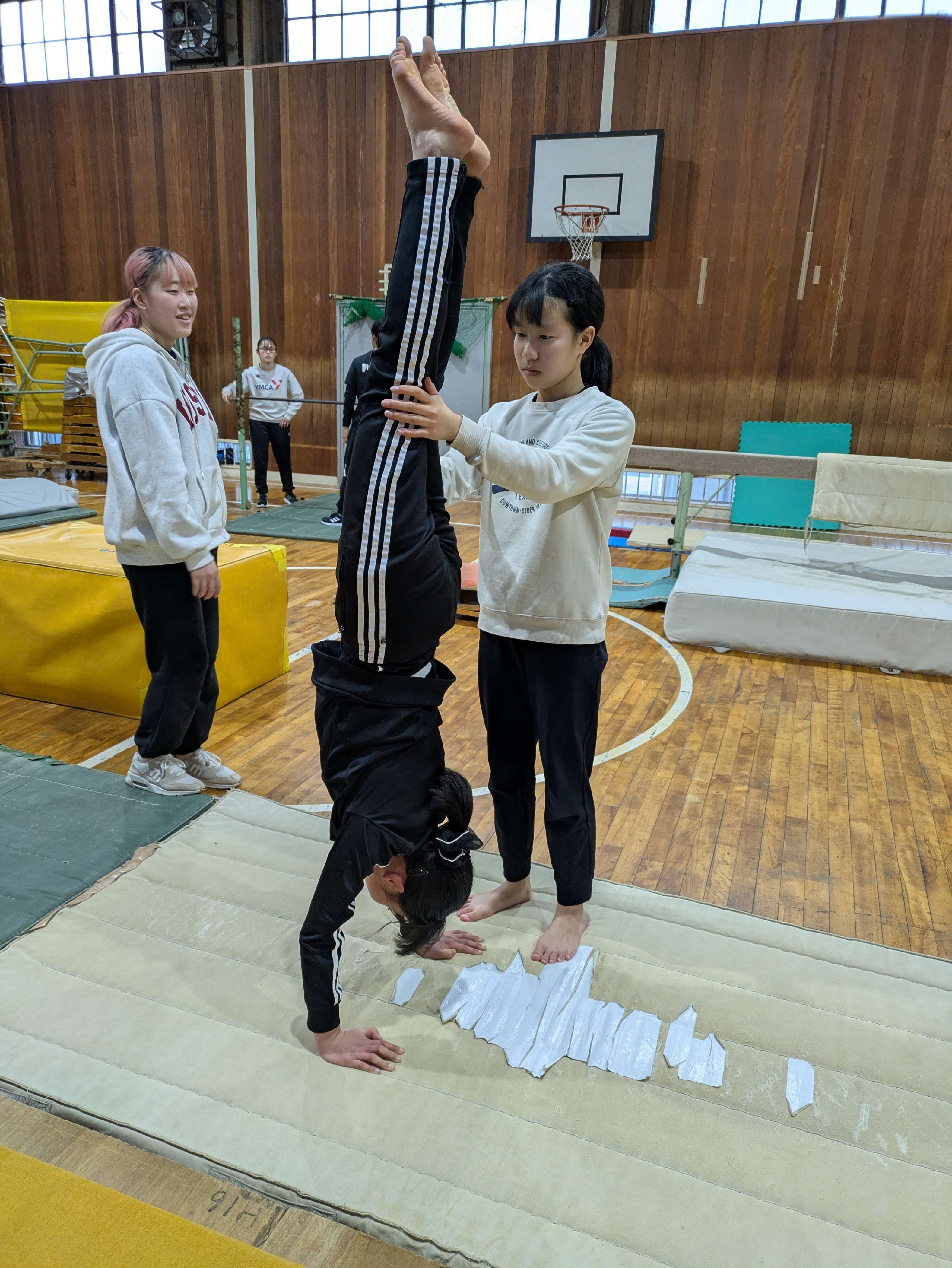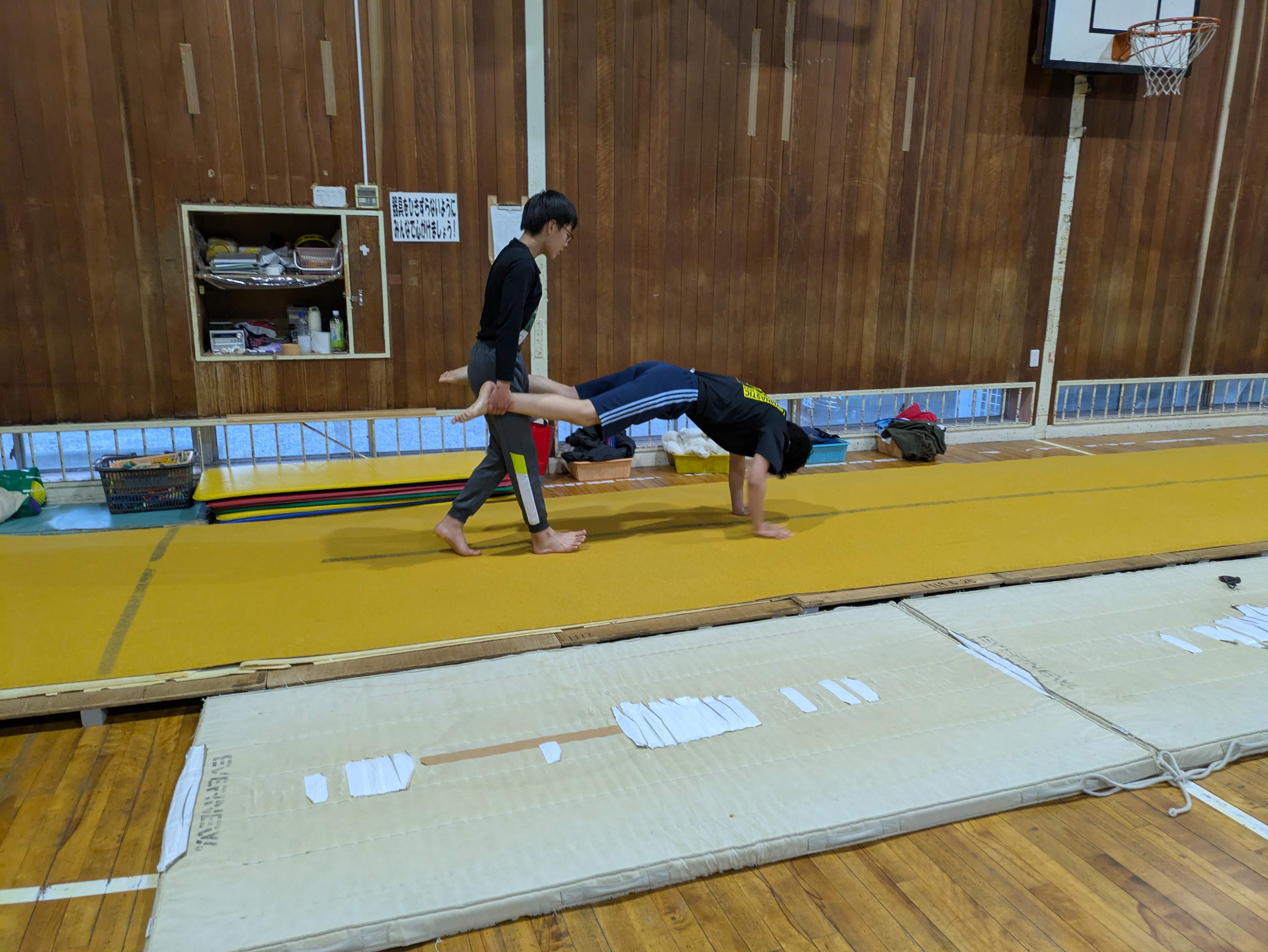 トレーニングでは、倒立や手押し車、なわとびなどをしました。