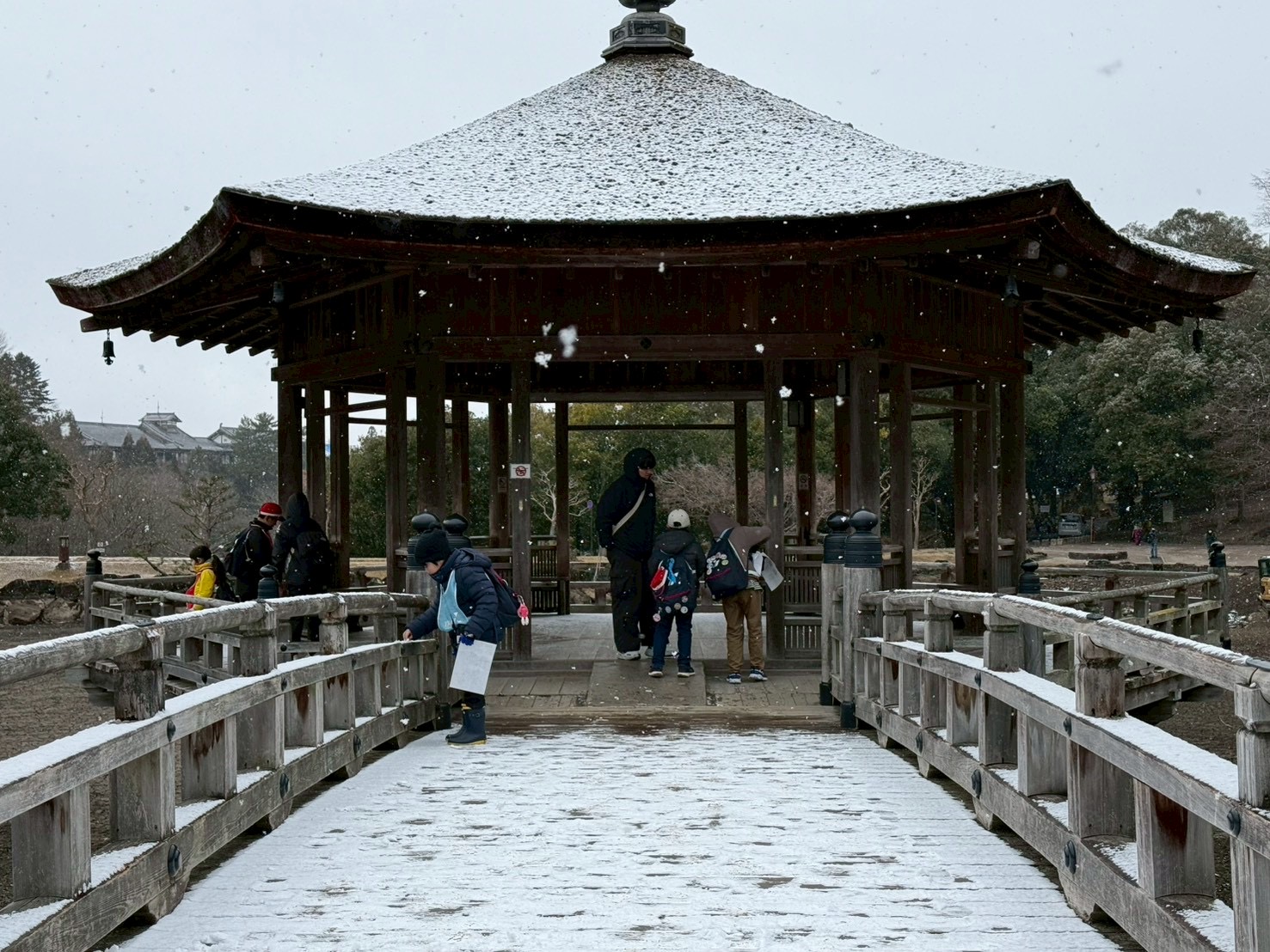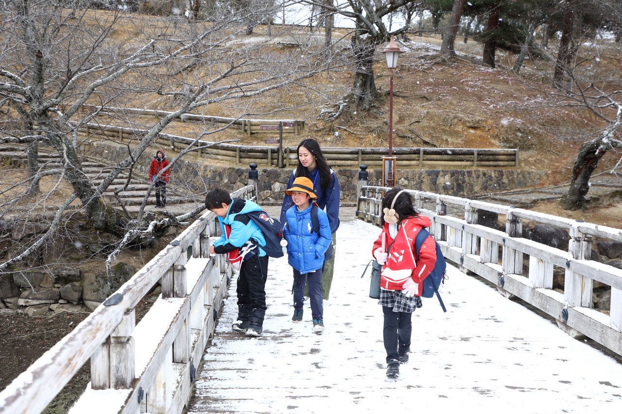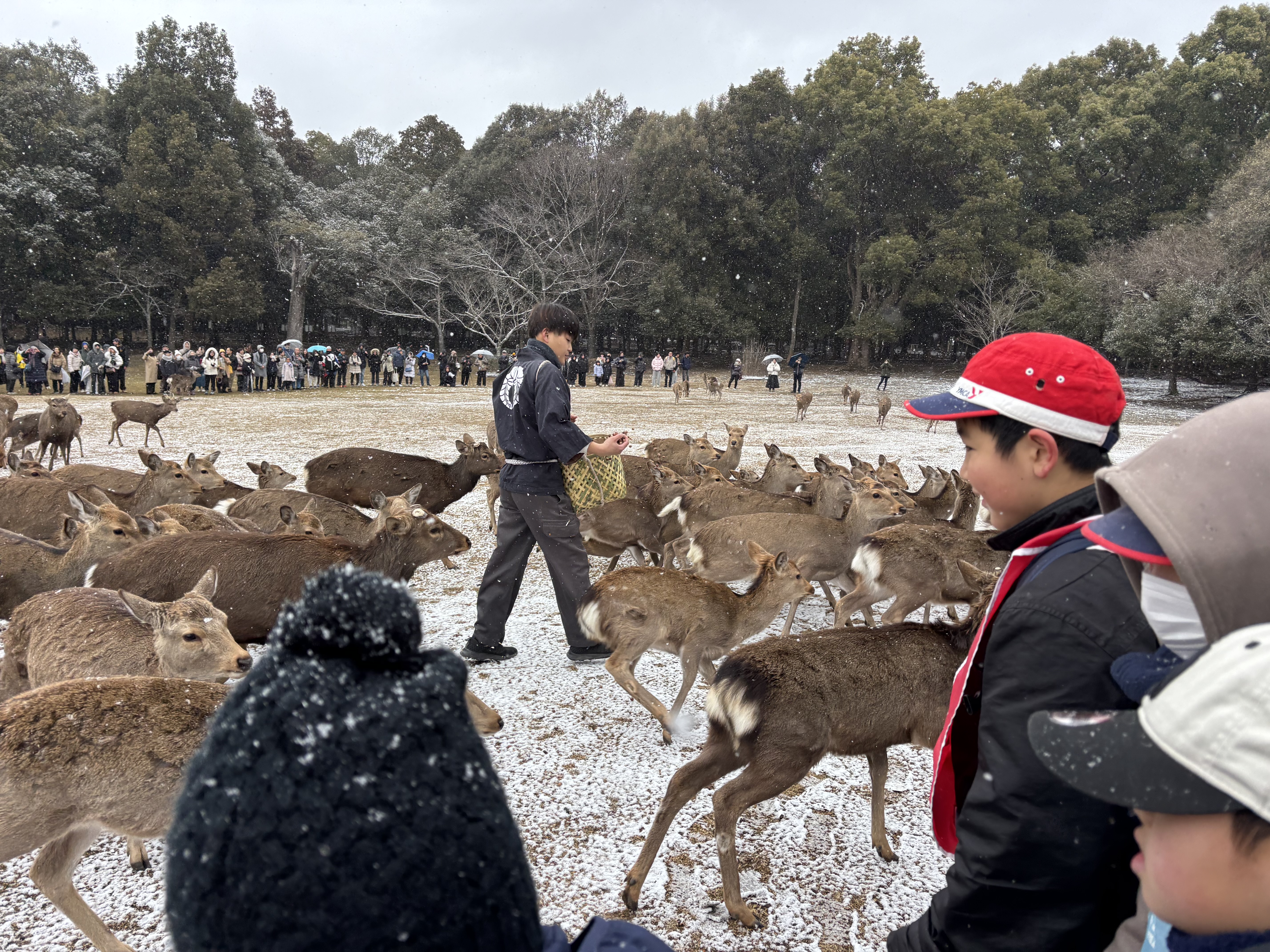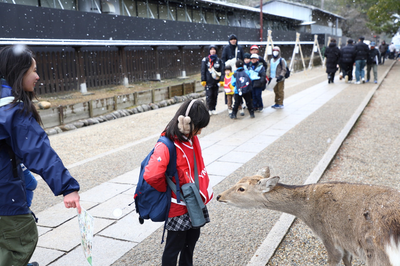 雪景色の奈良公園の中、班で協力をして梅を見つけたり、奈良の歴史に触れることができました。