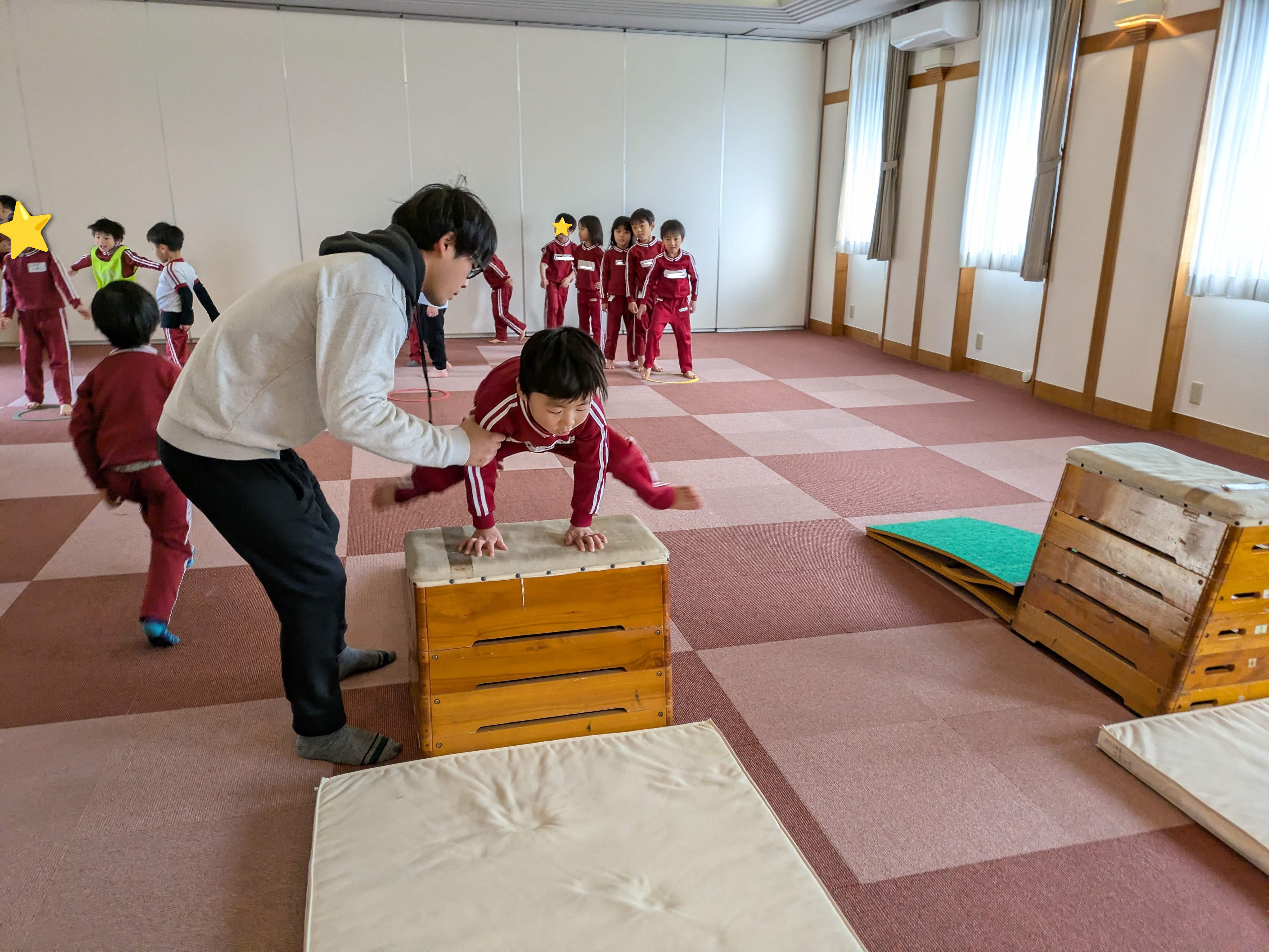 ロイター板でしっかりジャンプをすることができましたね!手を使って体を前に運べるようにしていきましょう!