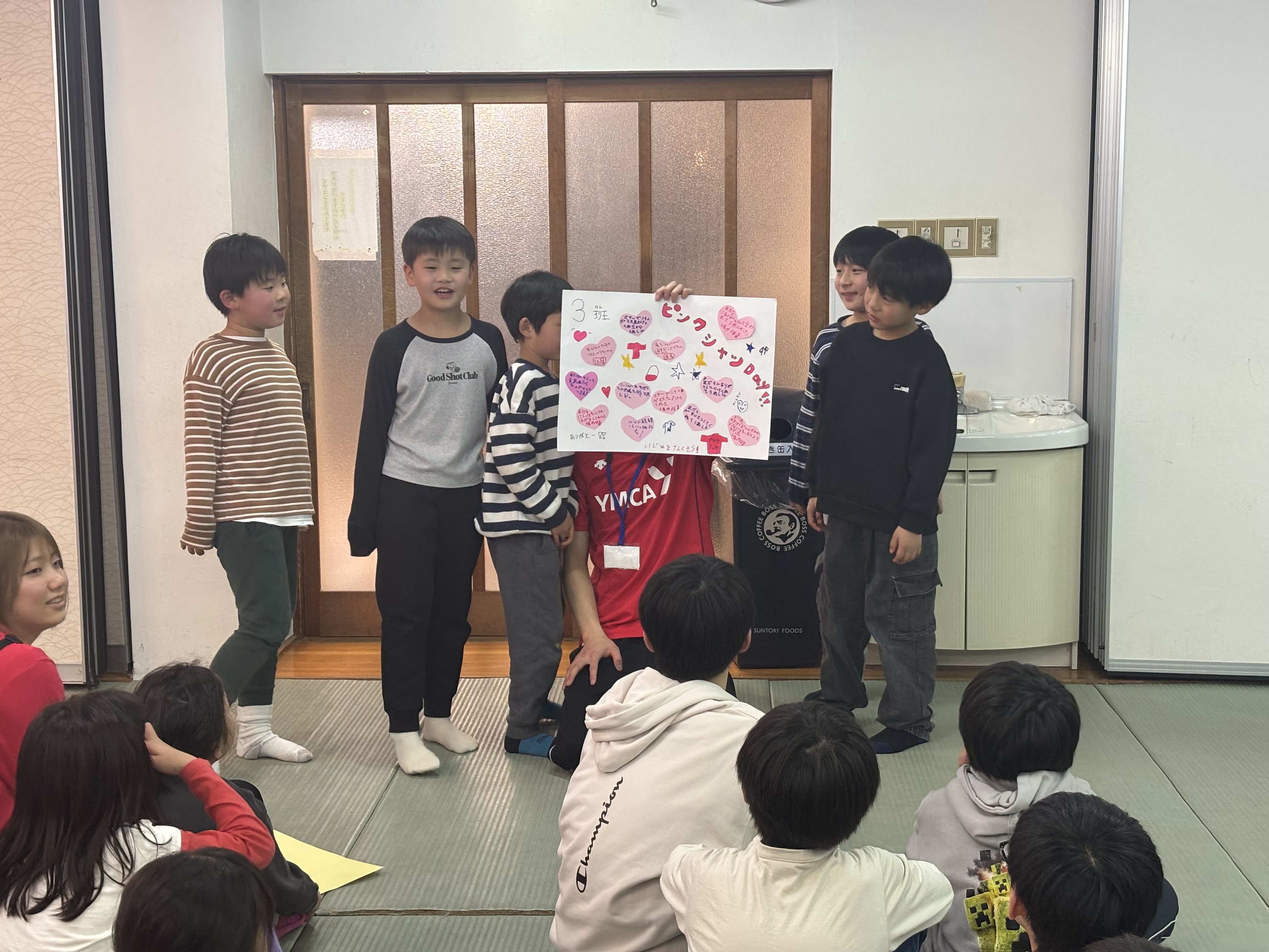 また、ピンクシャツデーの取り組みをしました。各グループ「お友だちにしてもらってうれしかったこと・うれしかった言葉」「いじめをなくすためには」など、感じたこと、考えたことをまとめて発表しました!