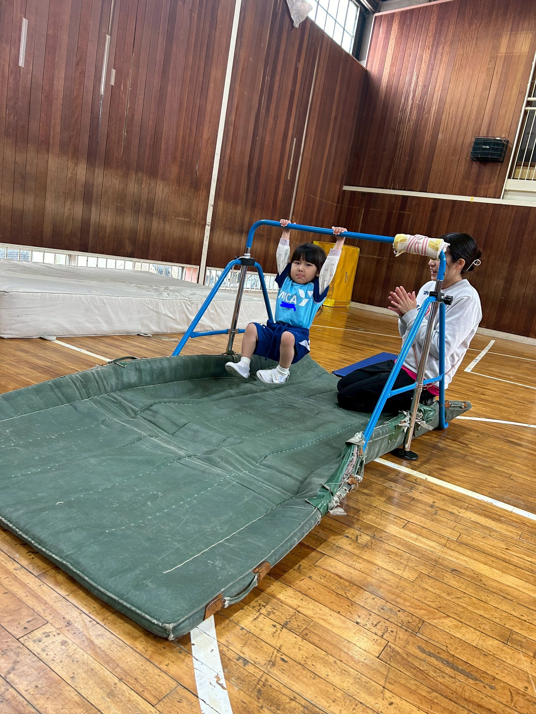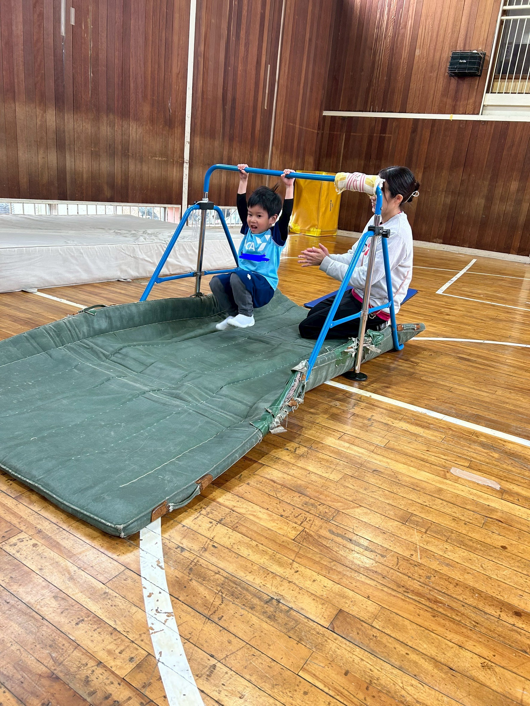 しっかりと鉄棒を握り、自分で足をあげて、ブラブラ揺れていましたね!