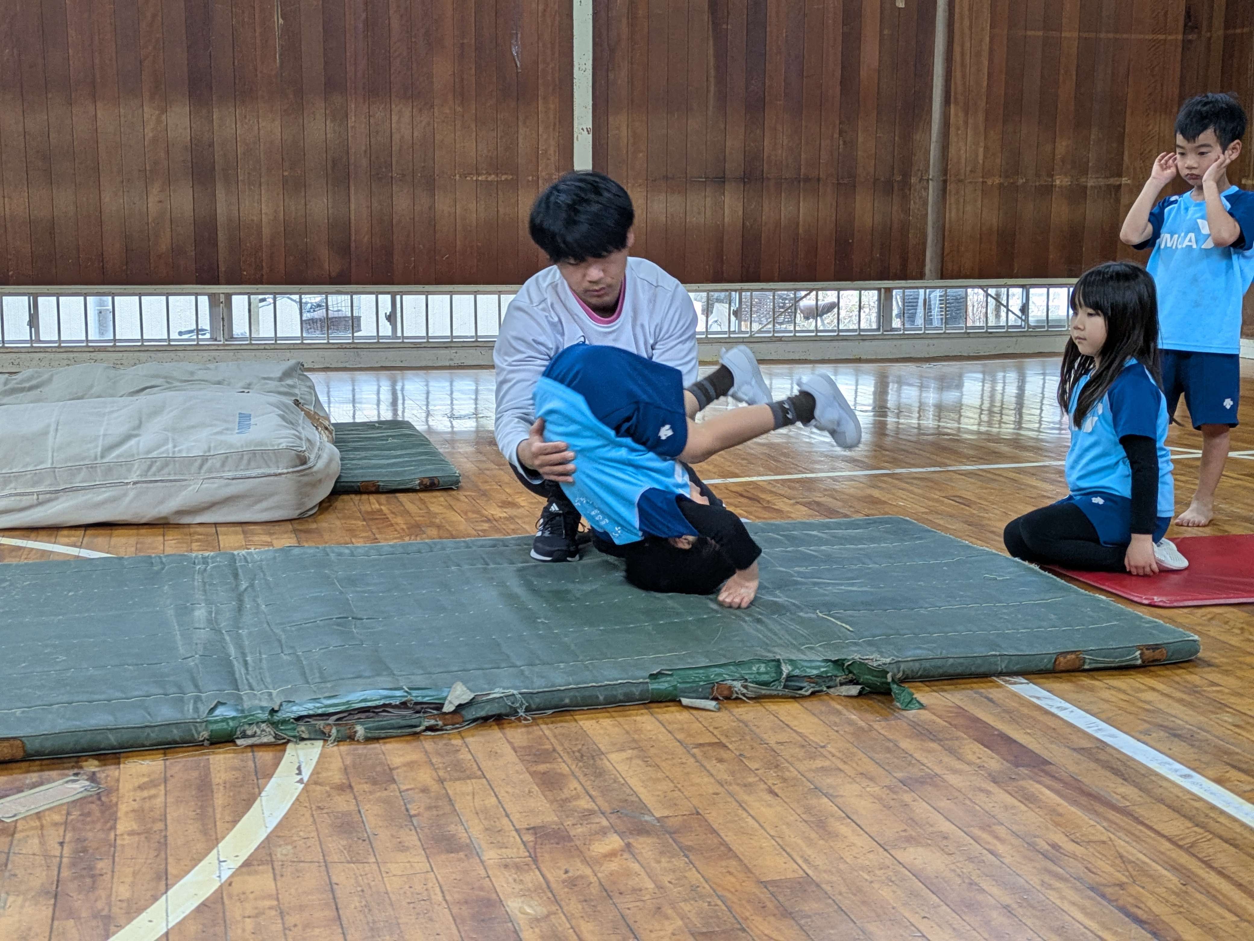 マットの前転では、回ったあと足とおへそが離れないように頑張りましょう!